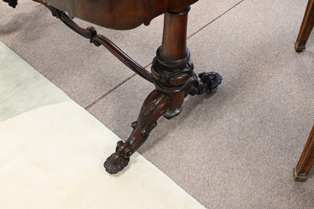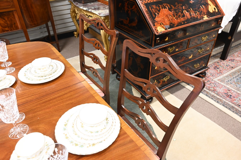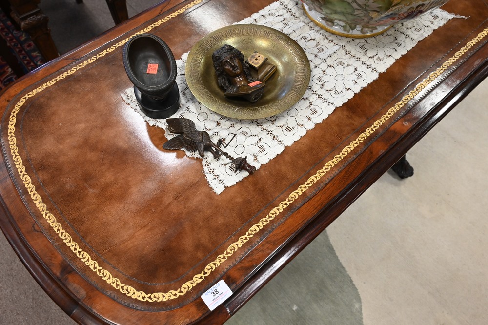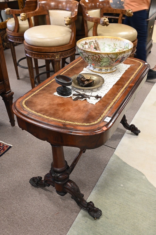 Lot 38: George IV Rosewood Writing Table, having inset leather top, two drawers on carved pedestal bases, scroll stretcher, circa 1850, height 28 inches, top 24 x 45 inches.