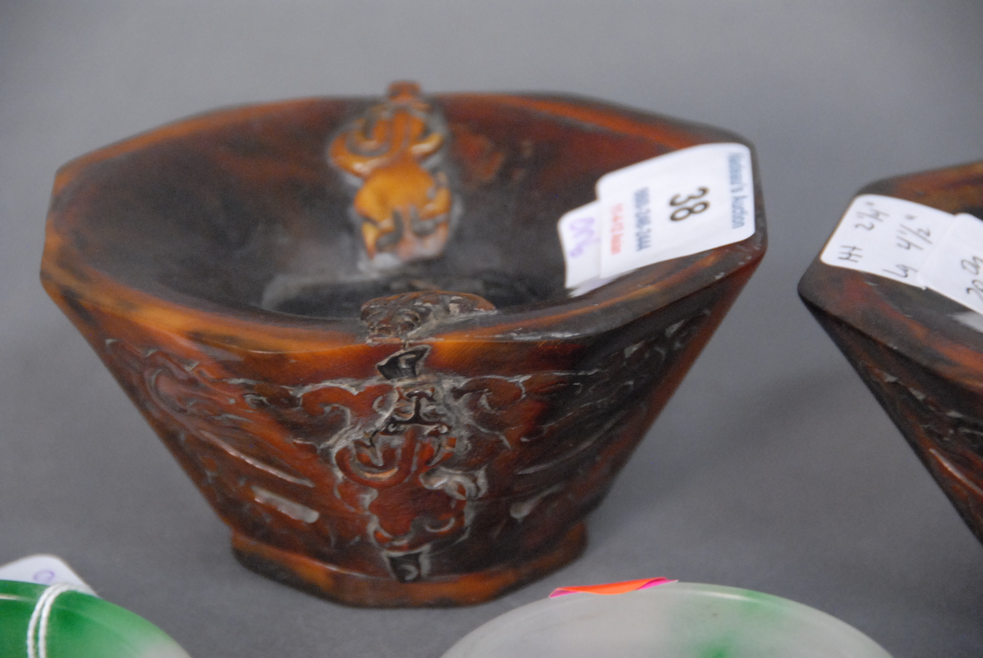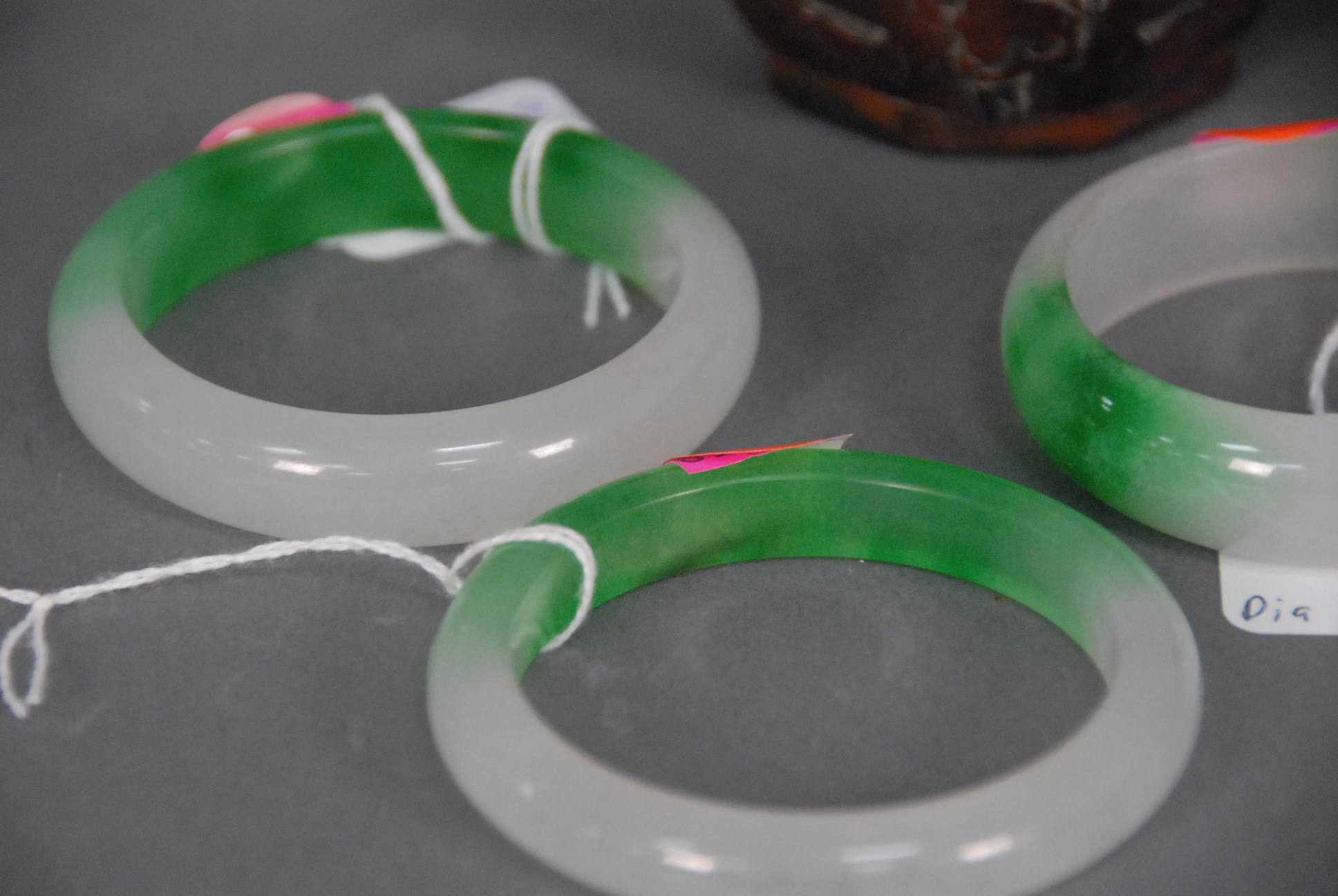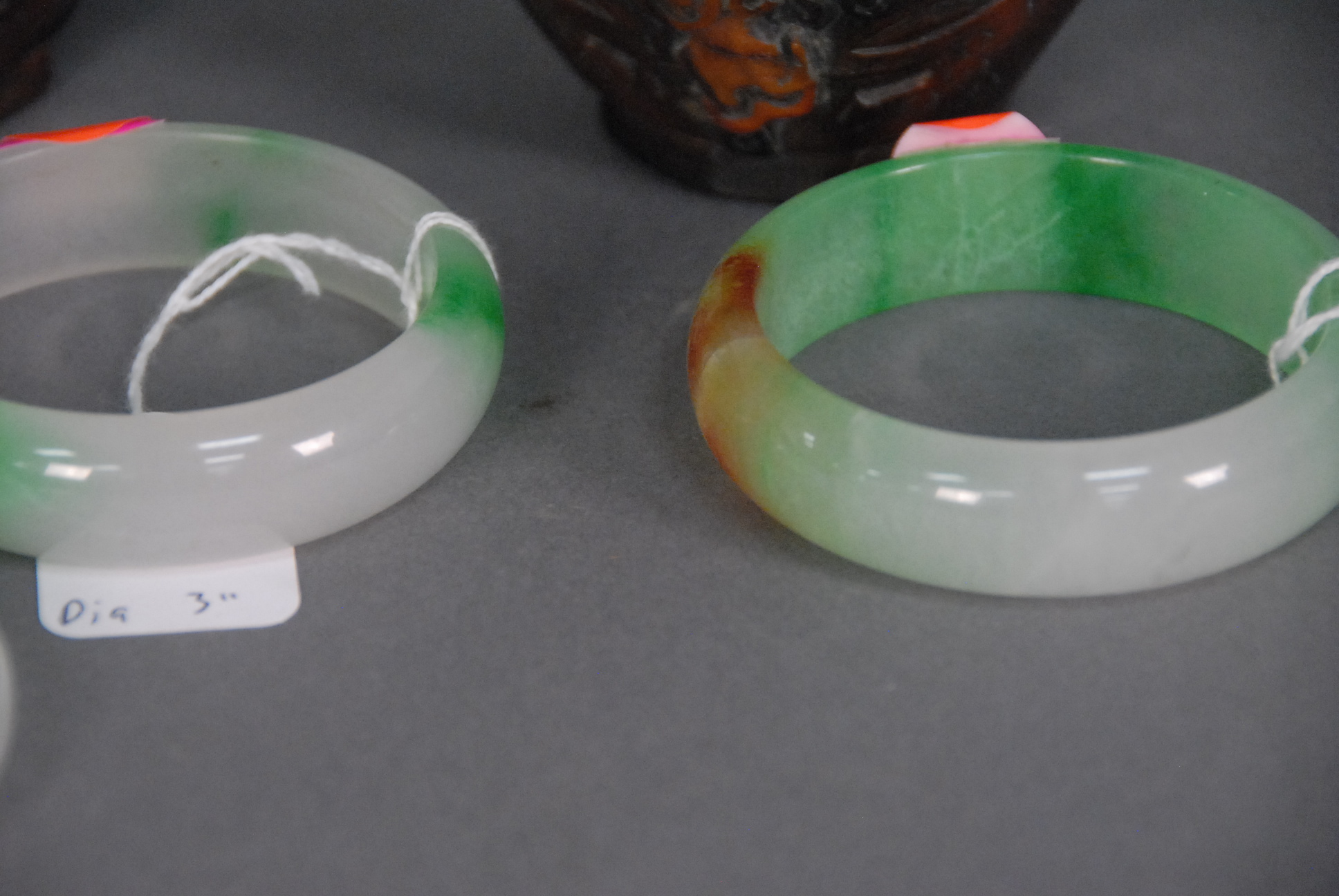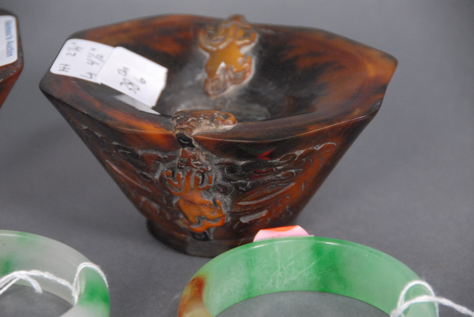 Lot 38: Group of six Oriental items pair of carved horn cups hts. 2 1/4in. lg. 4 1/2in. and four jadeite bracelets dia. 3in.