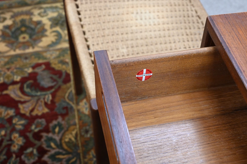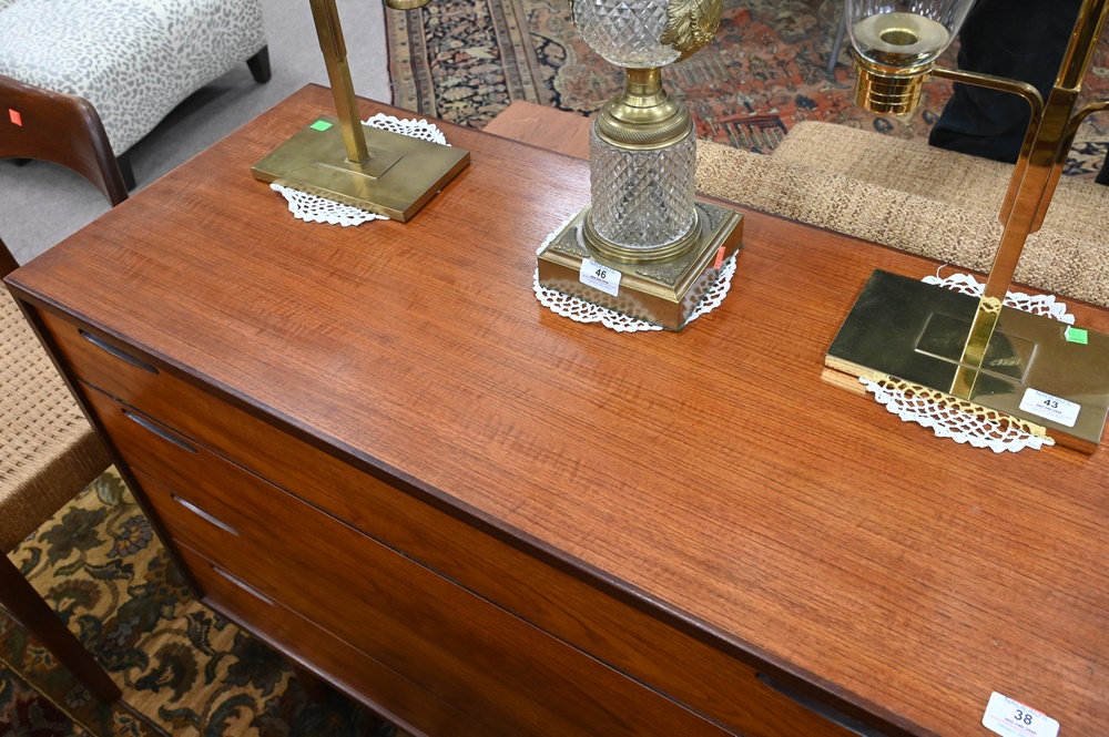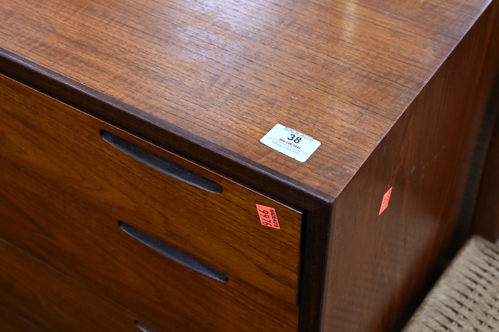 Lot 38: Ib Kofod Larsen Free Standing Teak Four Drawer Chest, stamped Made in Denmark, Imported by Selig, height 30 inches, depth 17.75 inches, width 39.5 inches