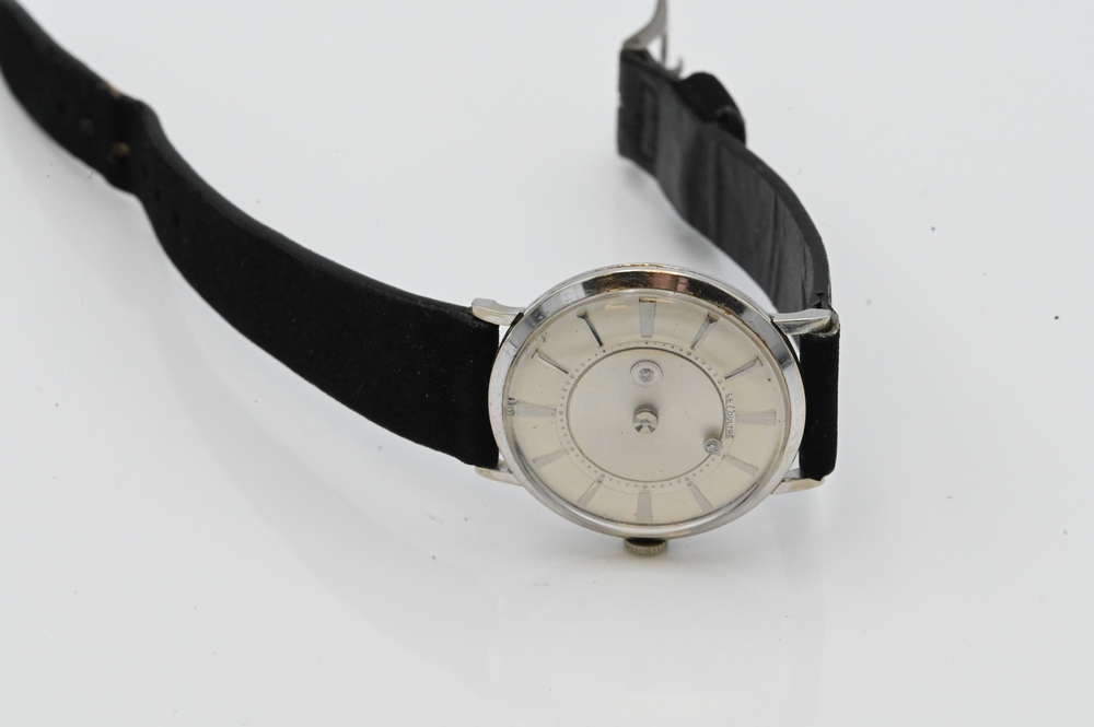 LeCoultre 14 Karat White Gold Men’s Wristwatch, having small diamonds for hands, 32.5 millimeters.