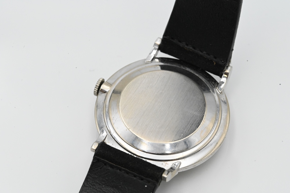 Lot 38: LeCoultre 14 Karat White Gold Men’s Wristwatch, having small diamonds for hands, 32.5 millimeters.