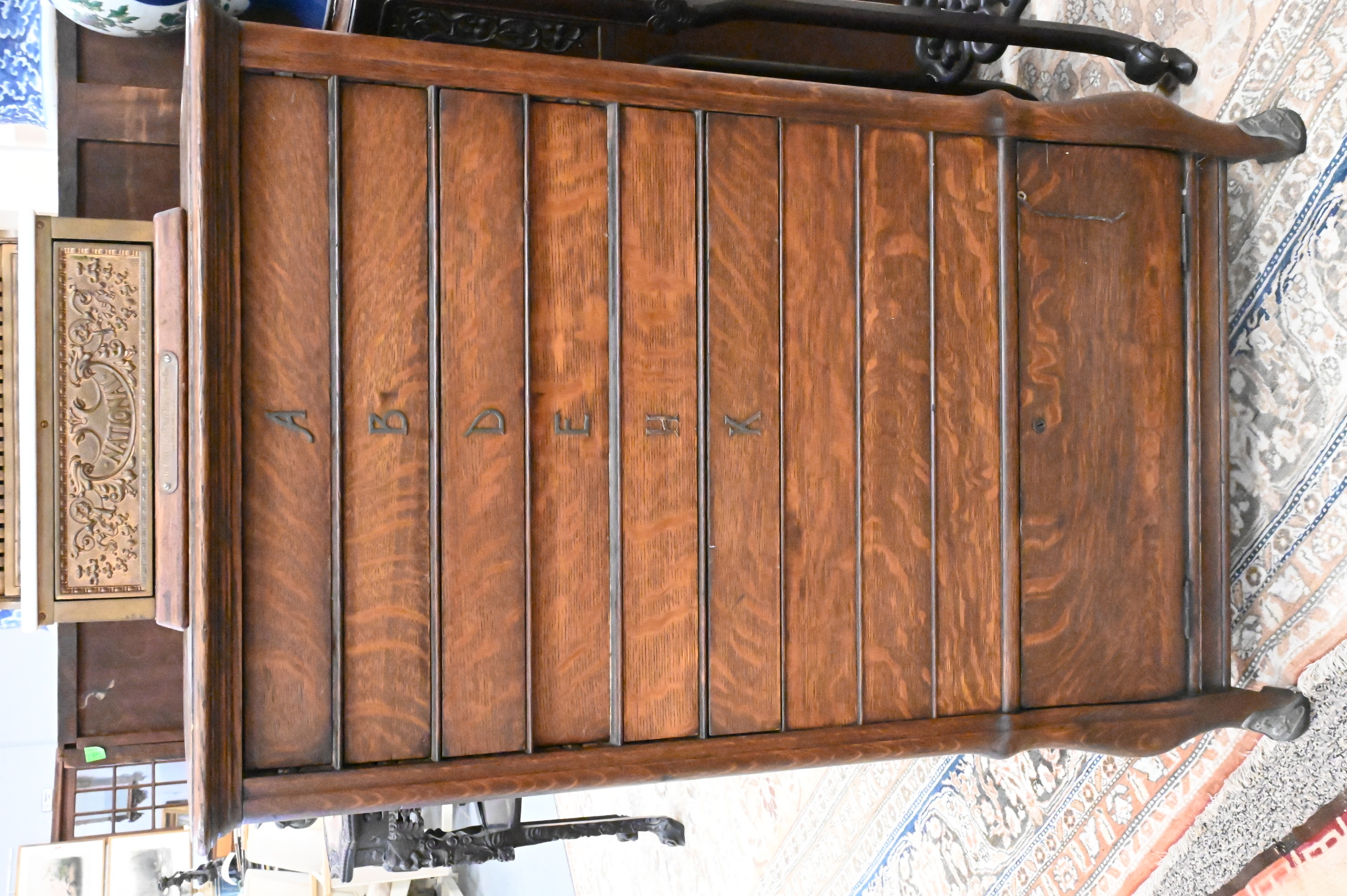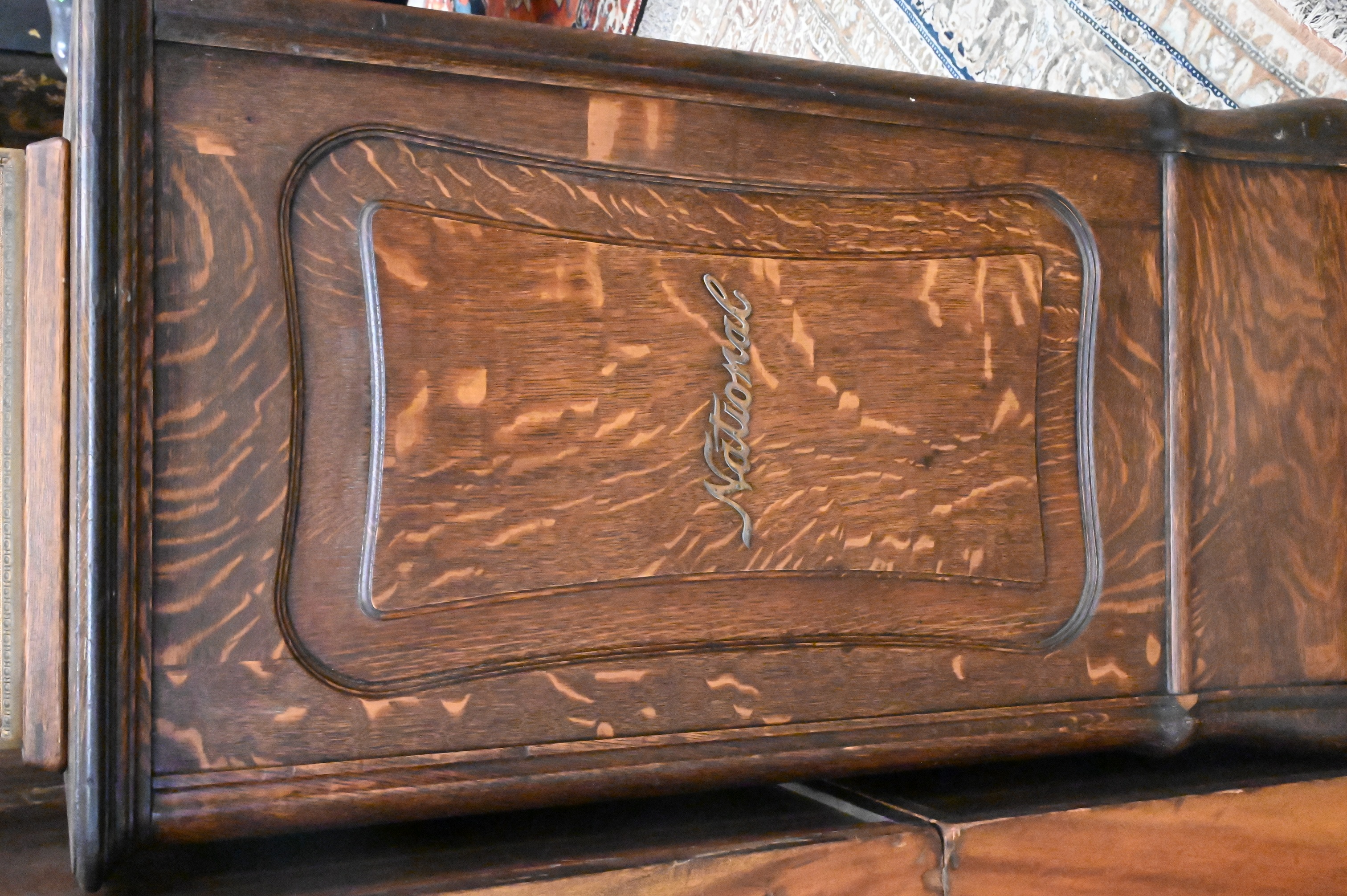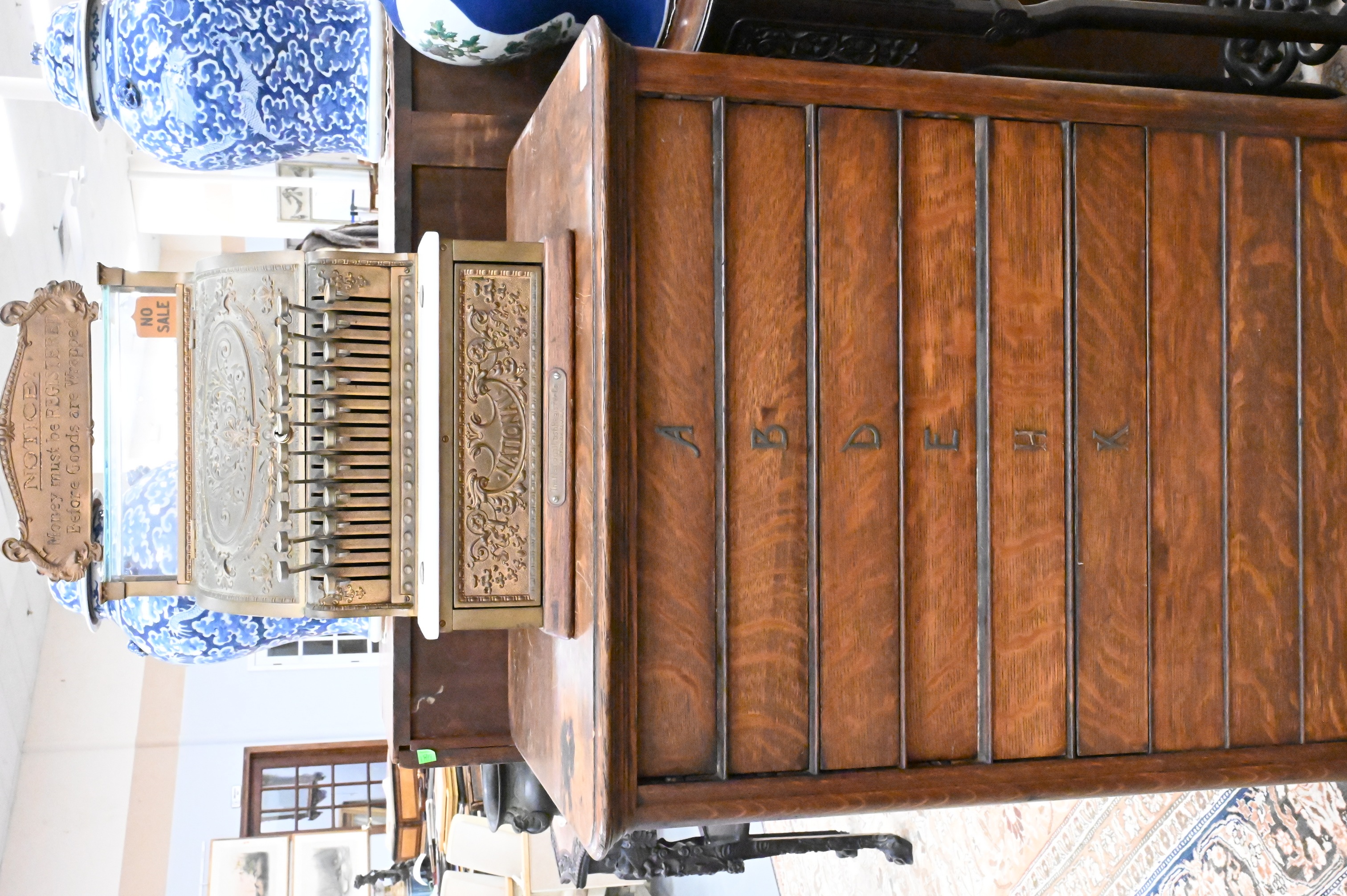 set on an oak Victorian base cabinet originally made to support a National Cash Register. The paneled sides mounted with raised “NATIONAL” letters, the upper drawers stenciled A, B, D, E, H, and K, over lower plain drawers and cupboard door. Shaped skirt and cabriole-style legs with cast metal feet.
