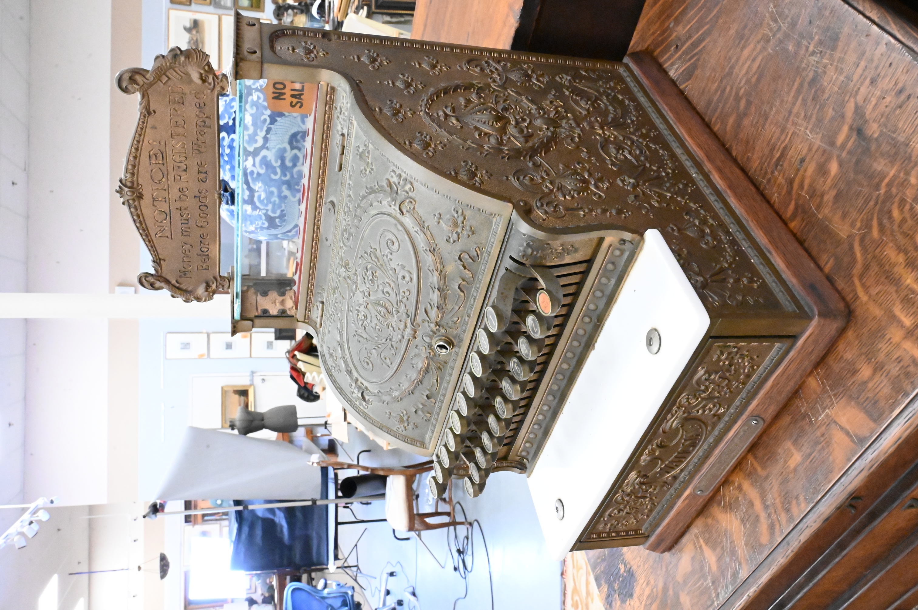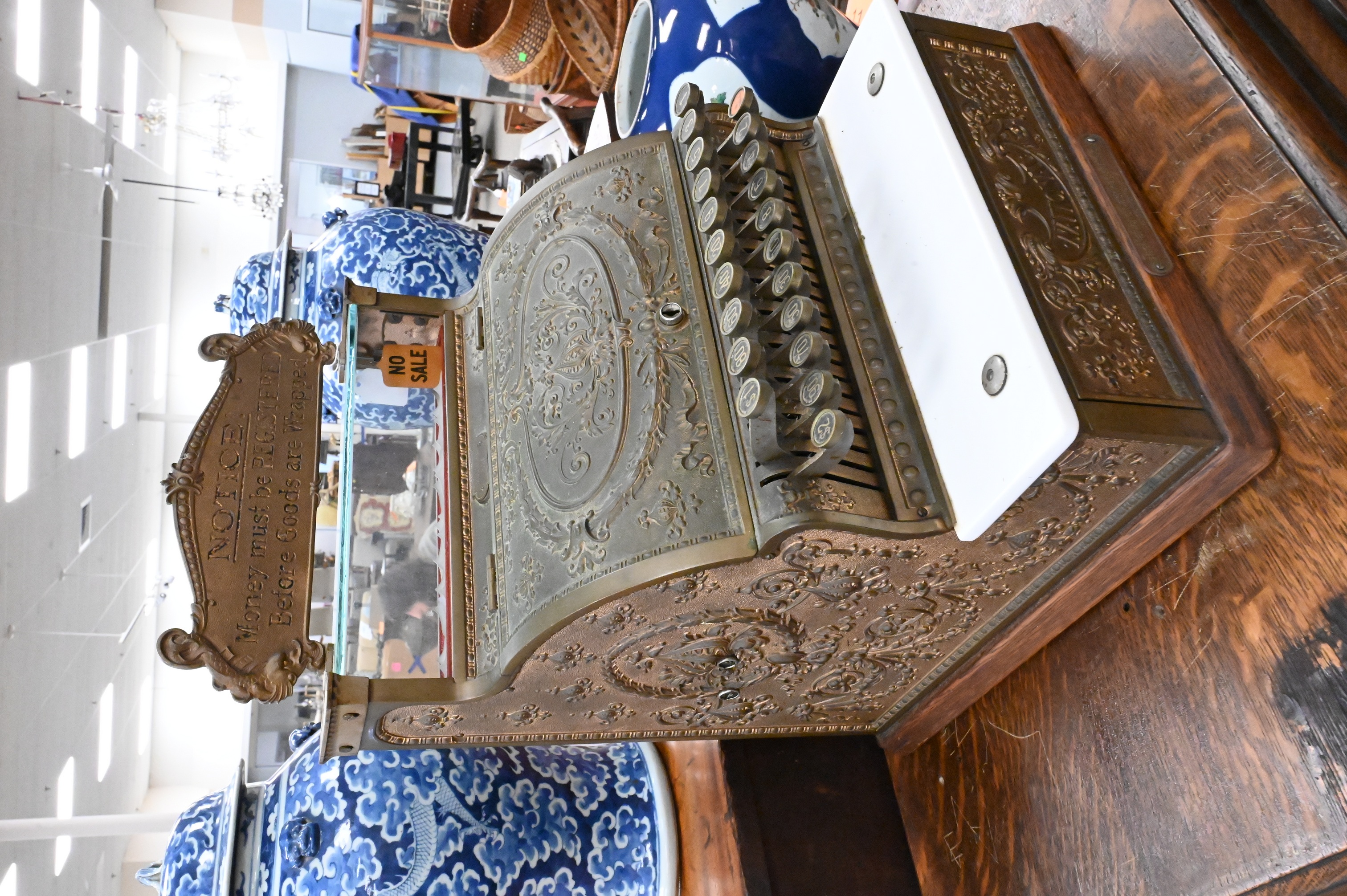 An ornate National brass cash register with scrolling foliate decoration, fitted with a row of numbered keys and original glass sales sign inscribed “NOTICE! Money must be REGISTERED before Goods are Wrapped.” White glass slab above drawer front embossed National. Retains back plate stamped The National Cash Register Co., Dayton, Ohio, U.S.A.