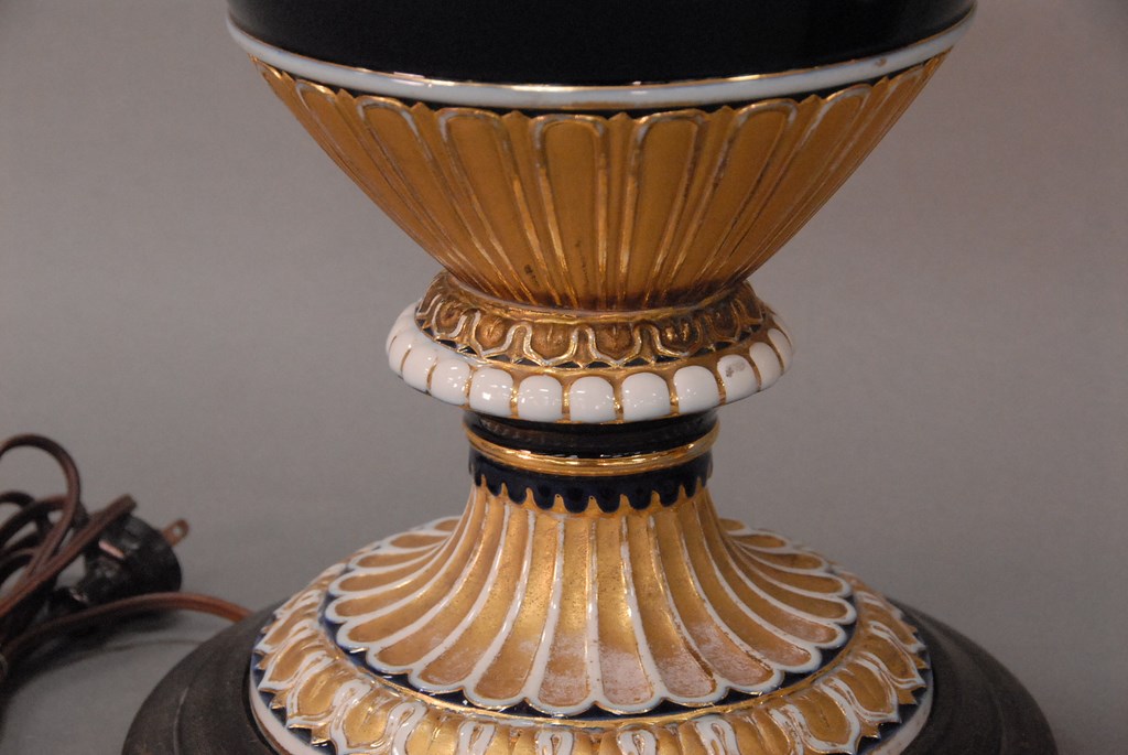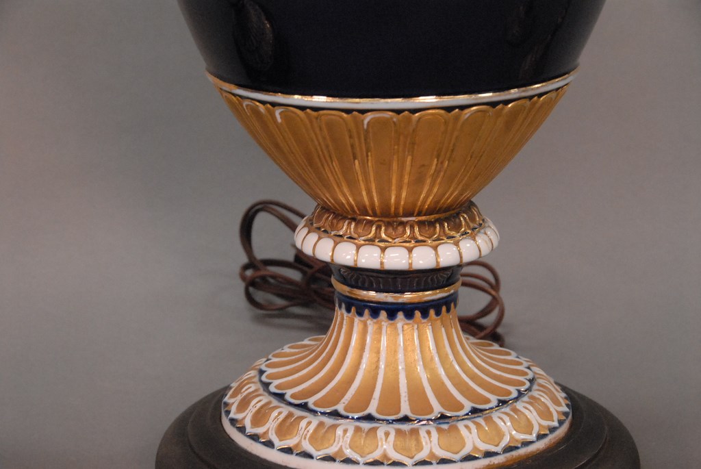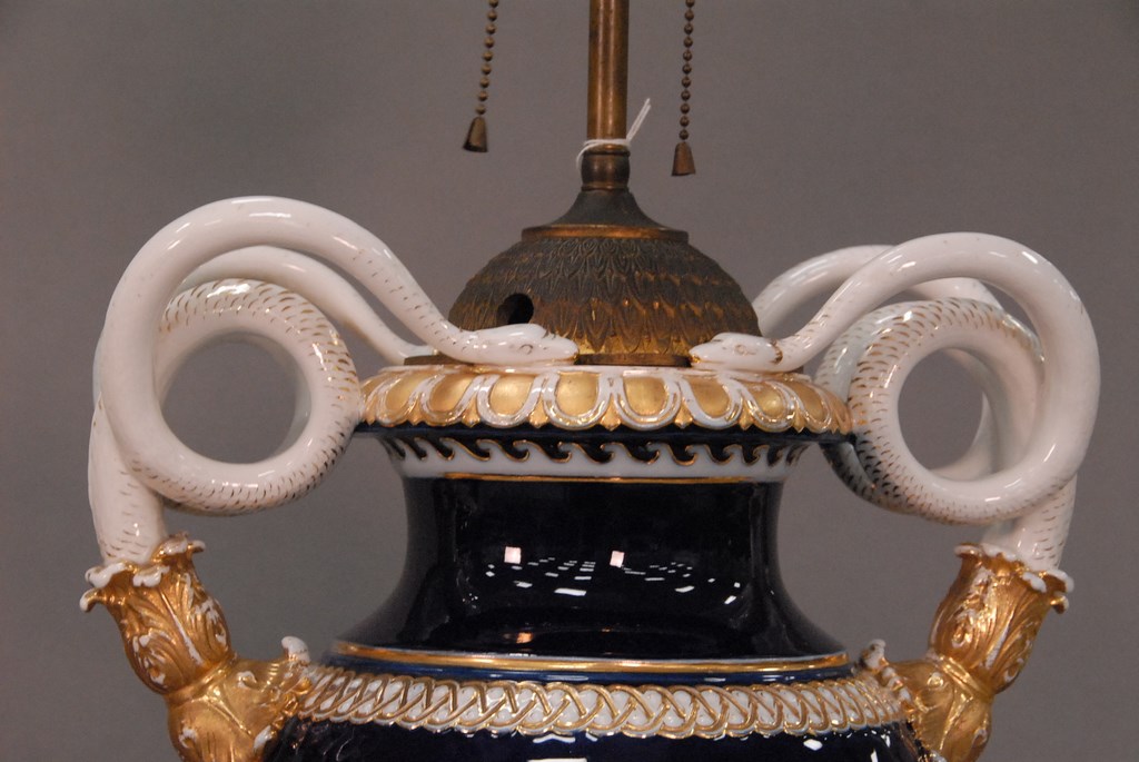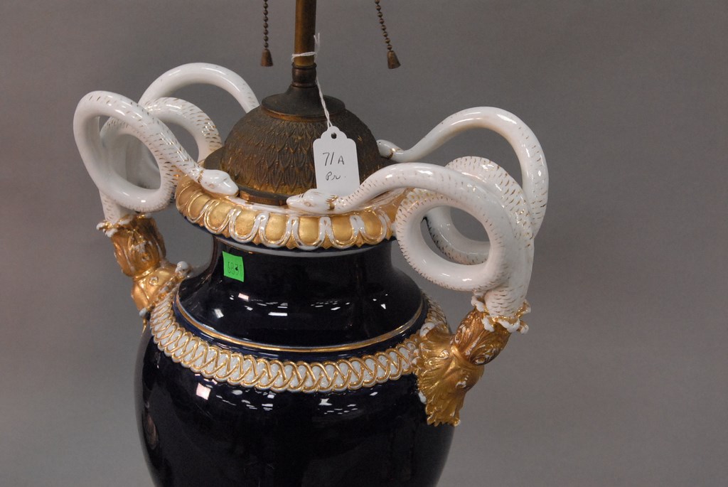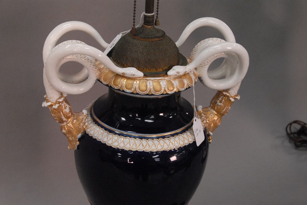 Lot 38: Pair of Meissen porcelain urns made into table lamps, each with entwined snake handles, cobalt bodies with white trim and gilt decor…