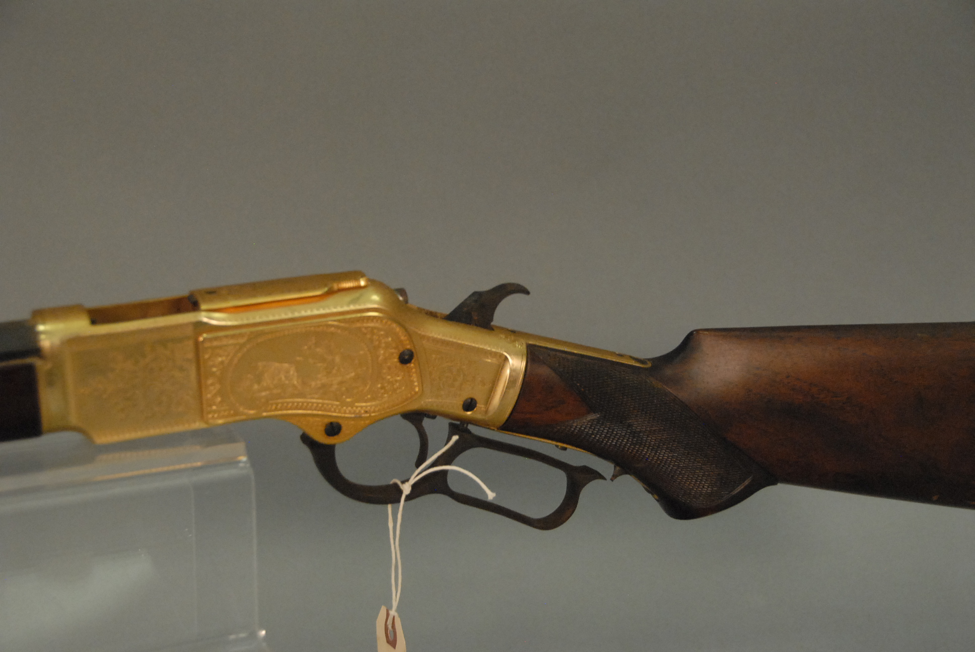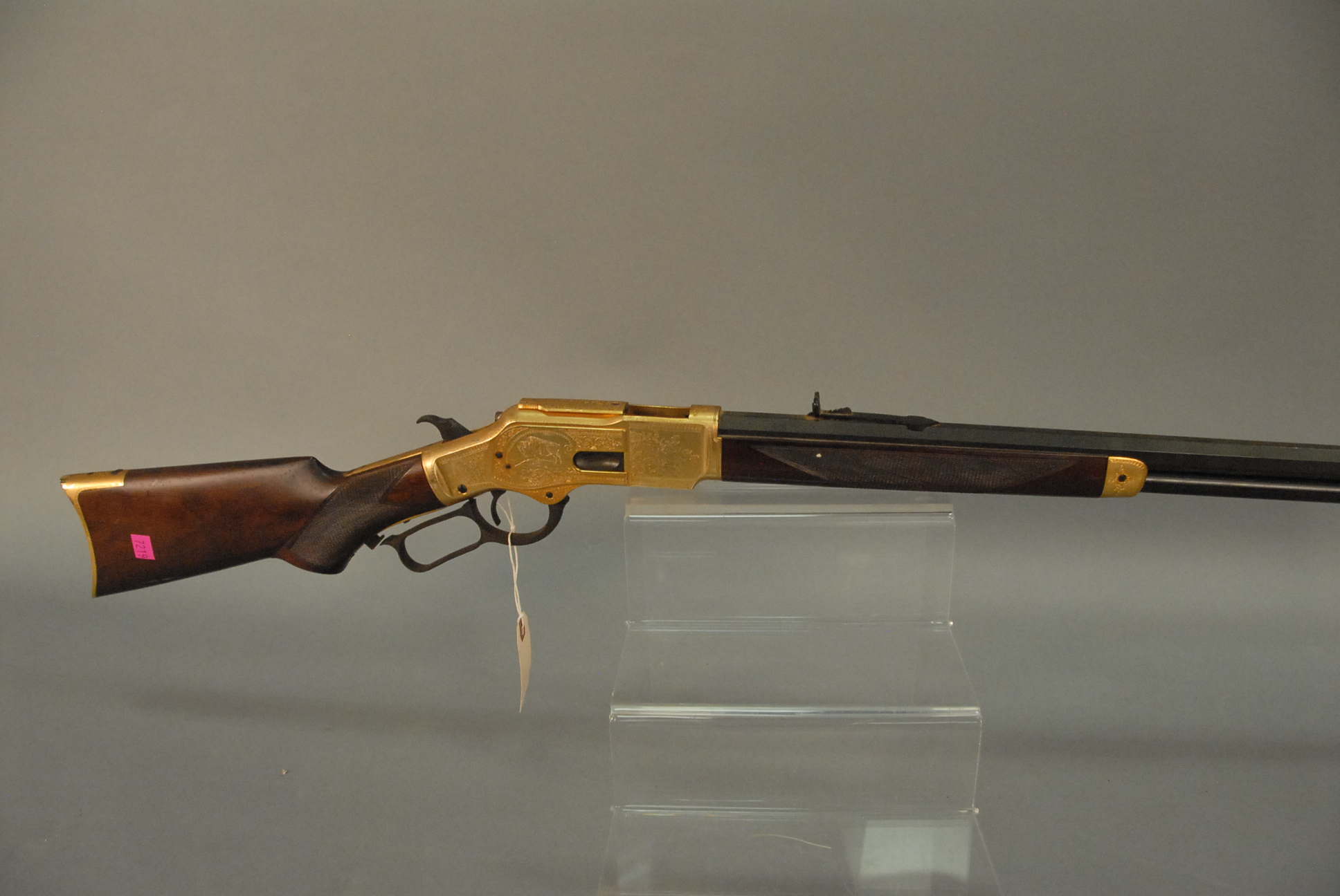 Replica of a Winchester 1873 rifle, 44 caliber with octagon filled barrel and gold plated receiver this is not a rifle, no s/n.