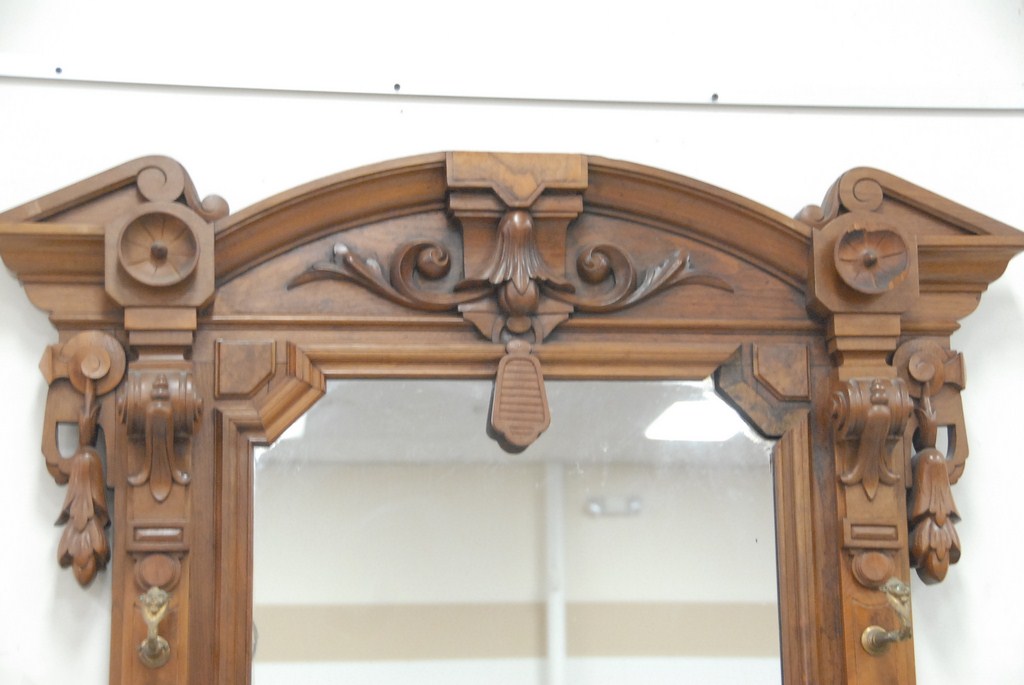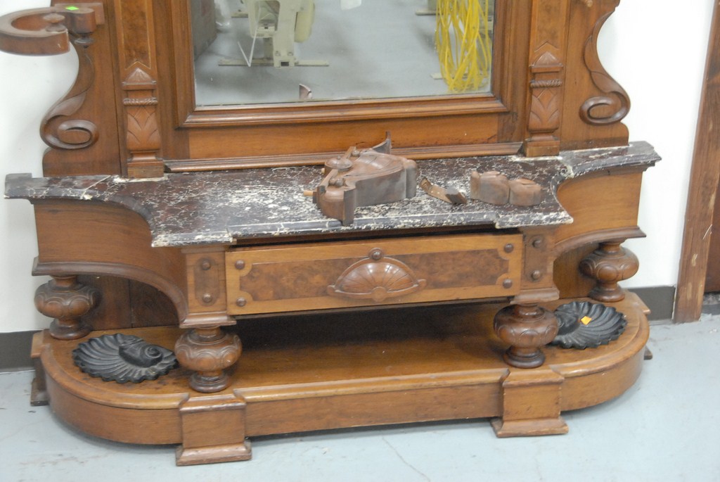 Lot 38: Walnut Victorian mirrored hall rack with marble shelf, drawer, and umbrella drop pans marble has two breaks and miscellaneous moldi…