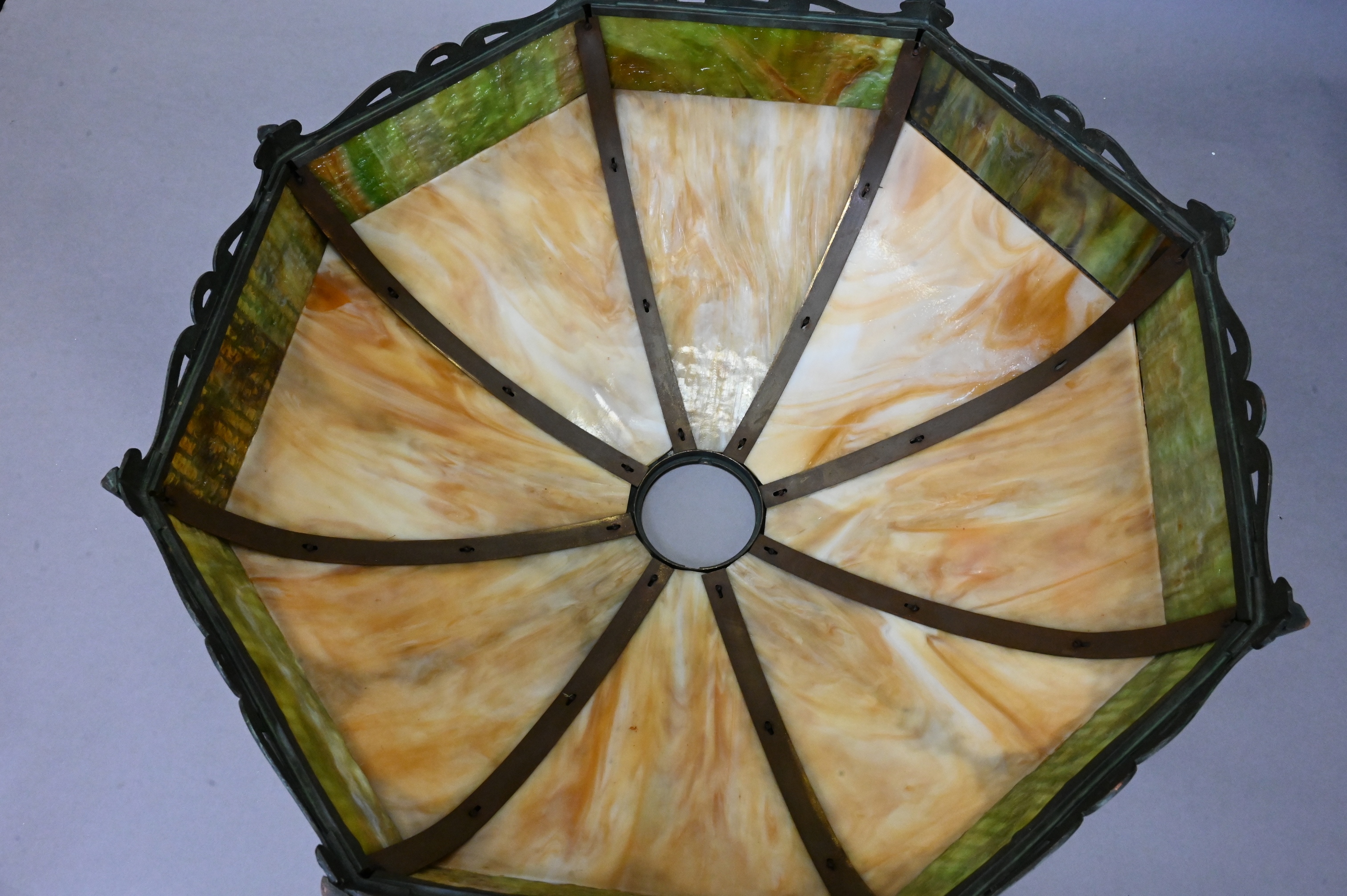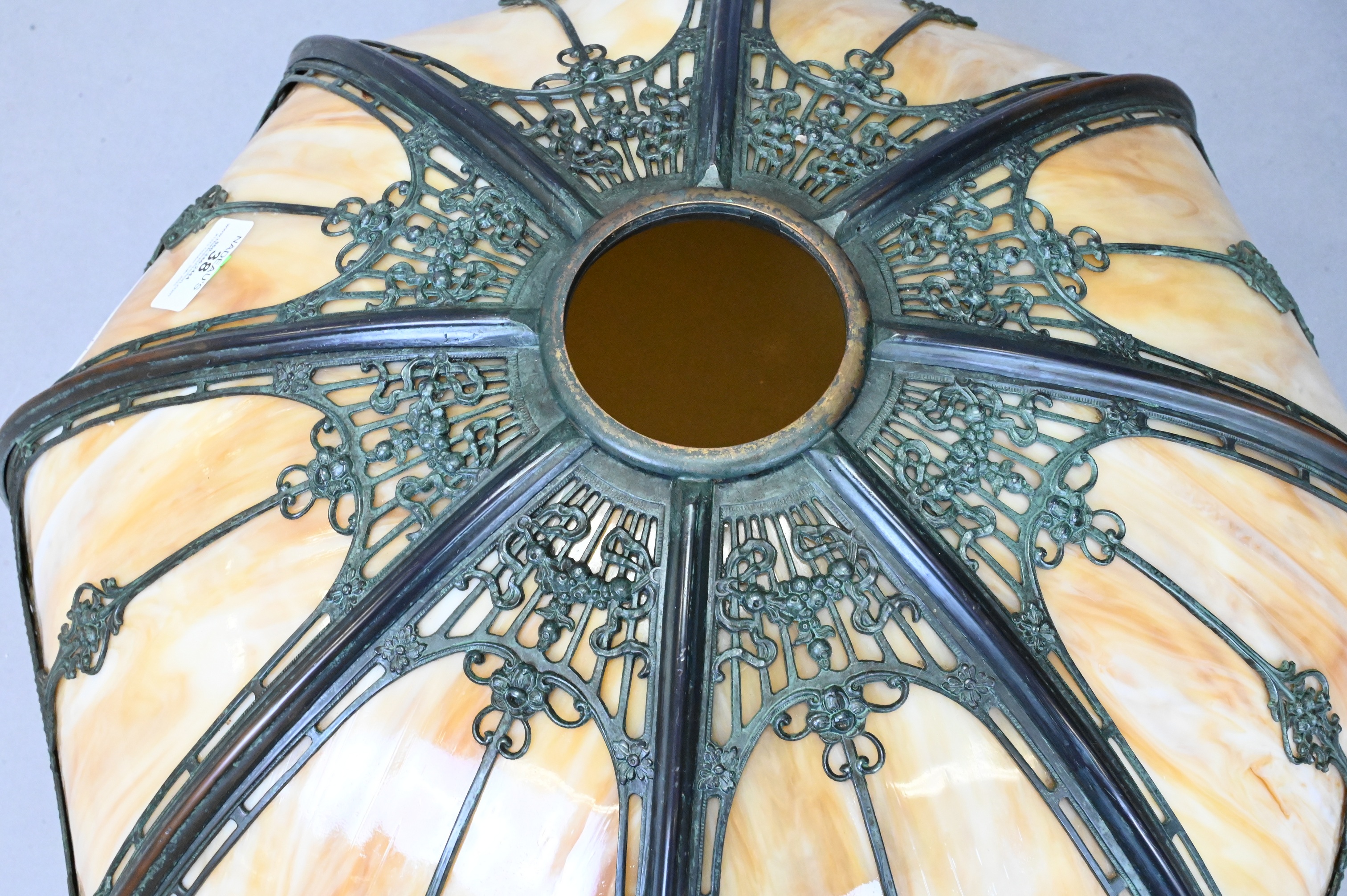 camel colored glass set in metal overlay with swags and garlands