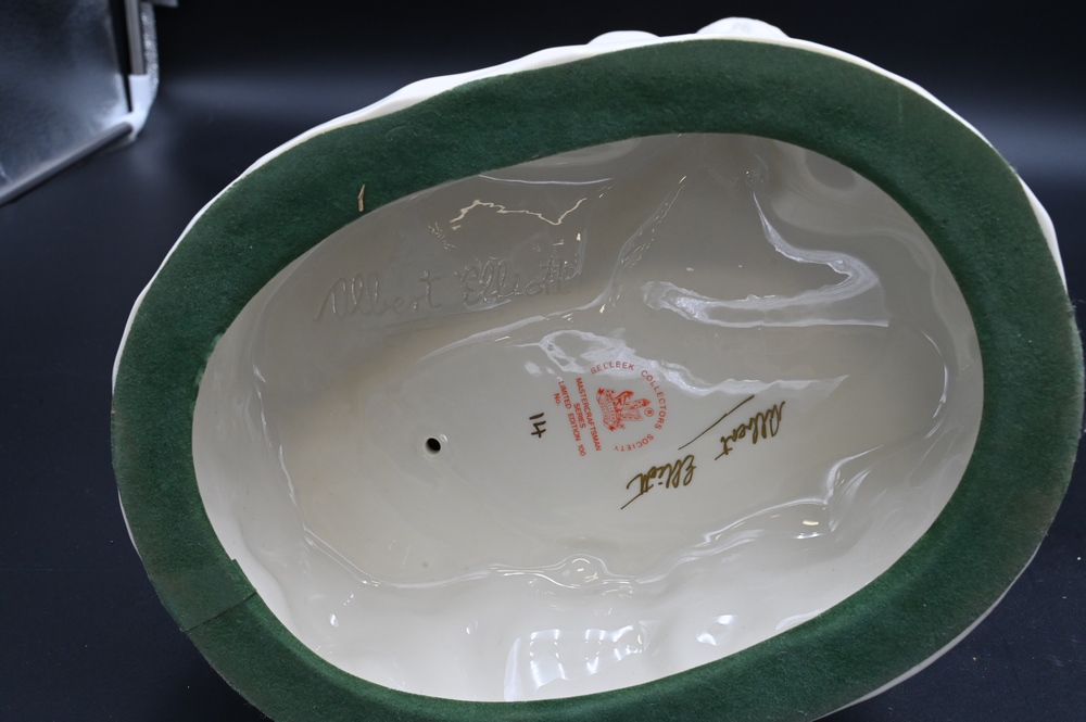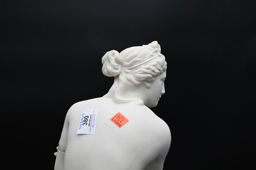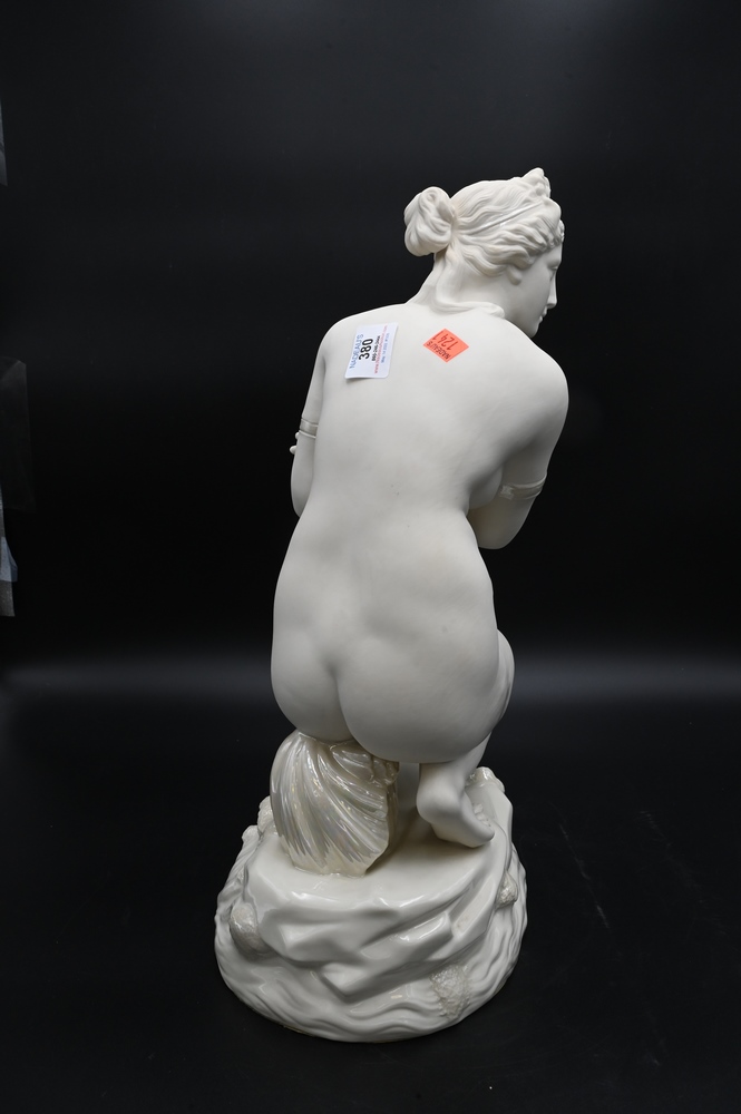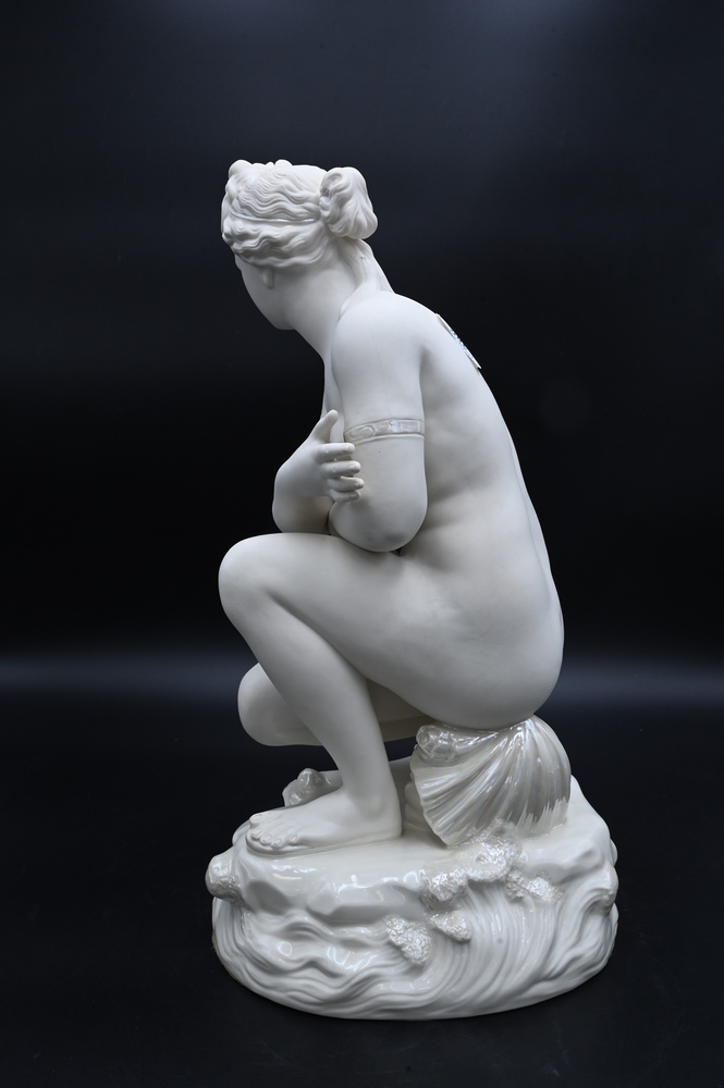Lot 380: Belleek Porcelain Crouching Venus Figure, crouching on wave form base, signed Albert Elliott, having Belleek Collectors Society mark on bottom, height 18 1/2 inches. Provenance: Collections of Norma Reilly, New Jersey.