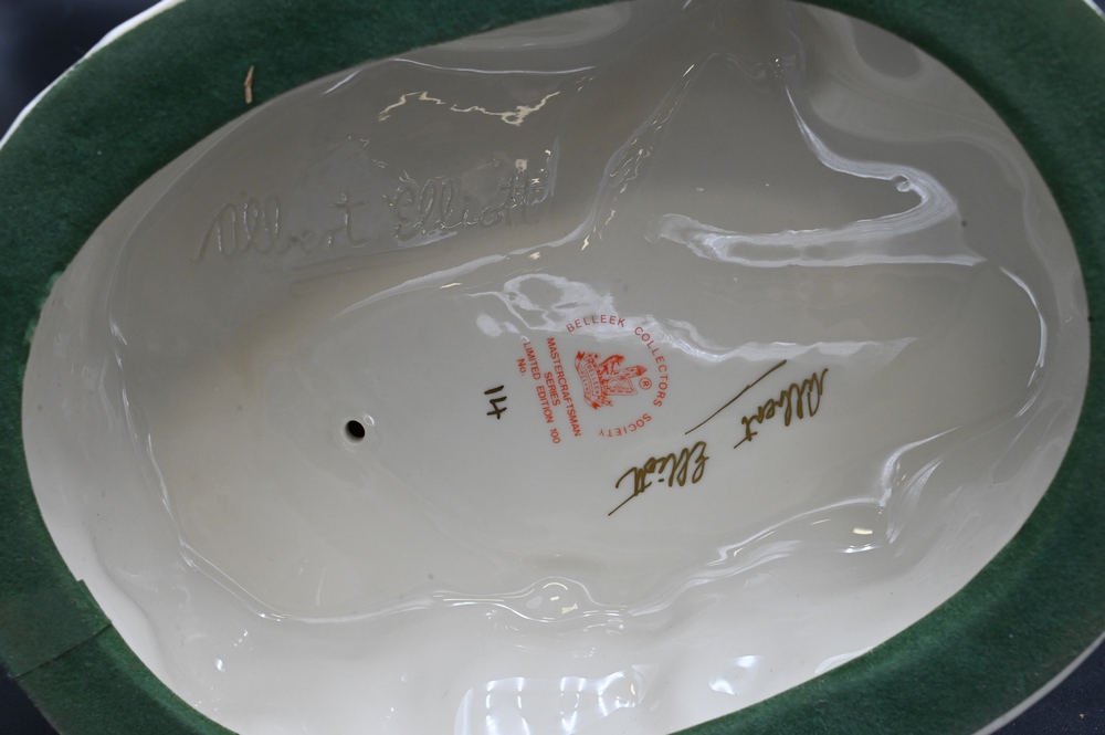 Belleek Porcelain Crouching Venus Figure, crouching on wave form base, signed Albert Elliott, having Belleek Collectors Society mark on bottom, height 18 1/2 inches. Provenance: Collections of Norma Reilly, New Jersey.
