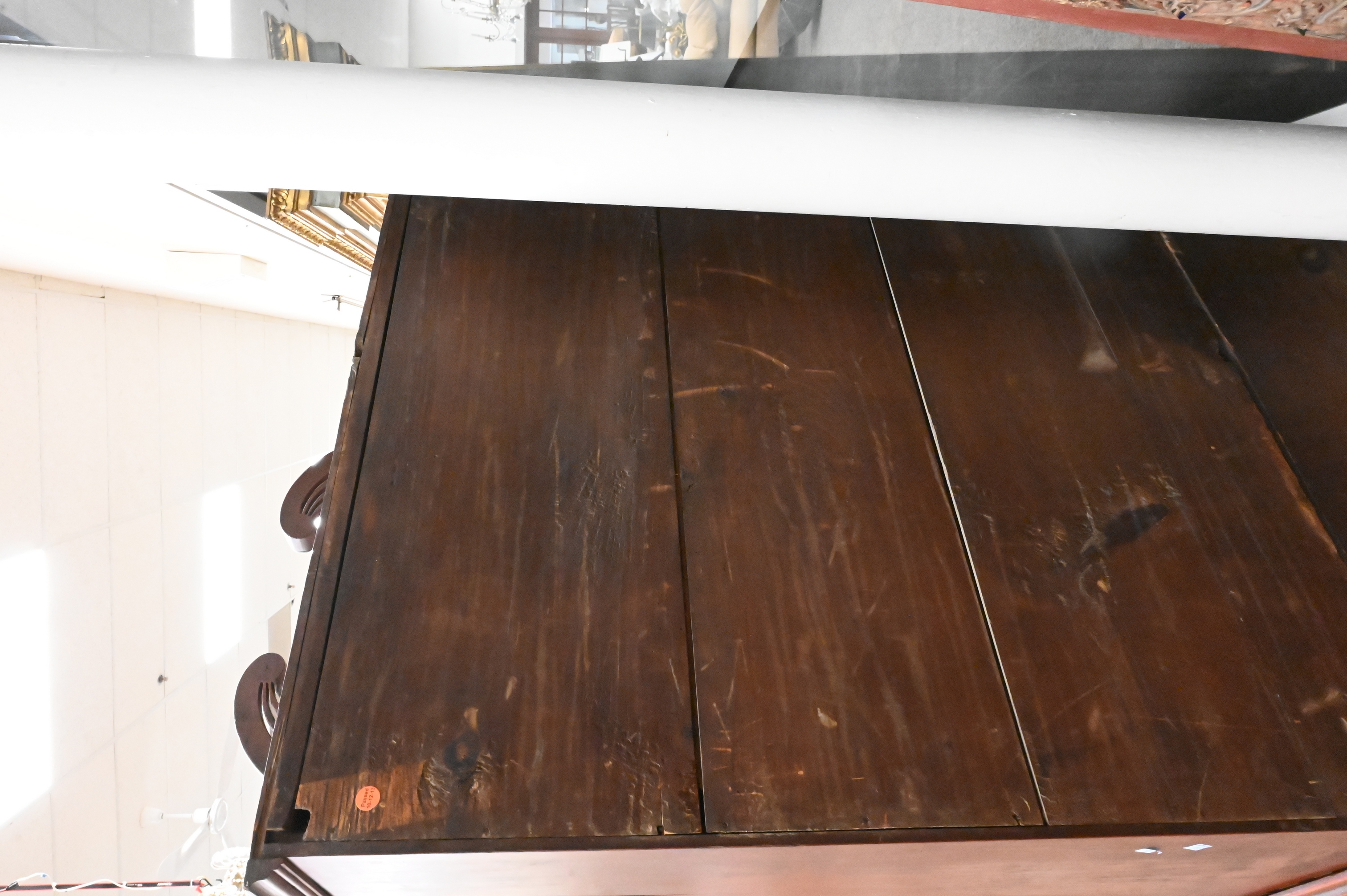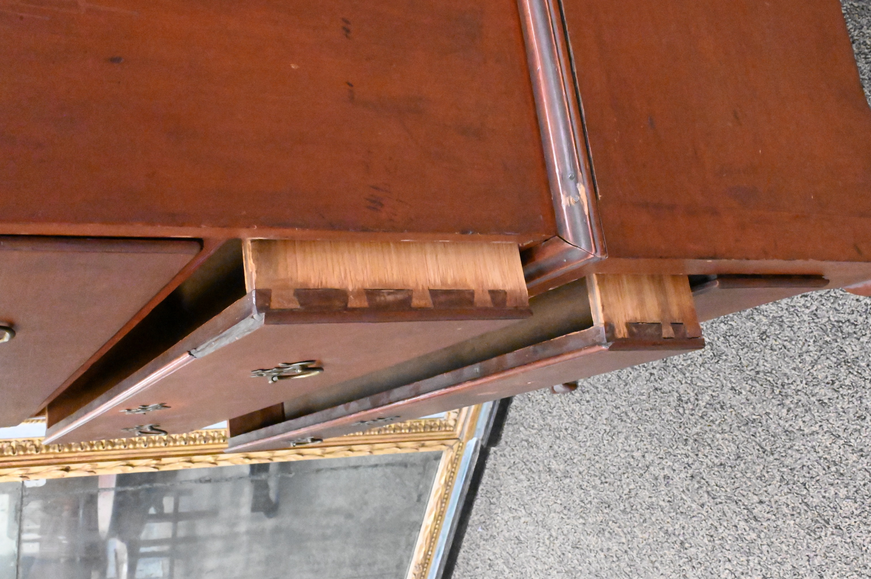 Condition: Three drawers chipped on the right side; one key escutcheon broken off; brasses original; surface wear and age cracks consistent with age and use.