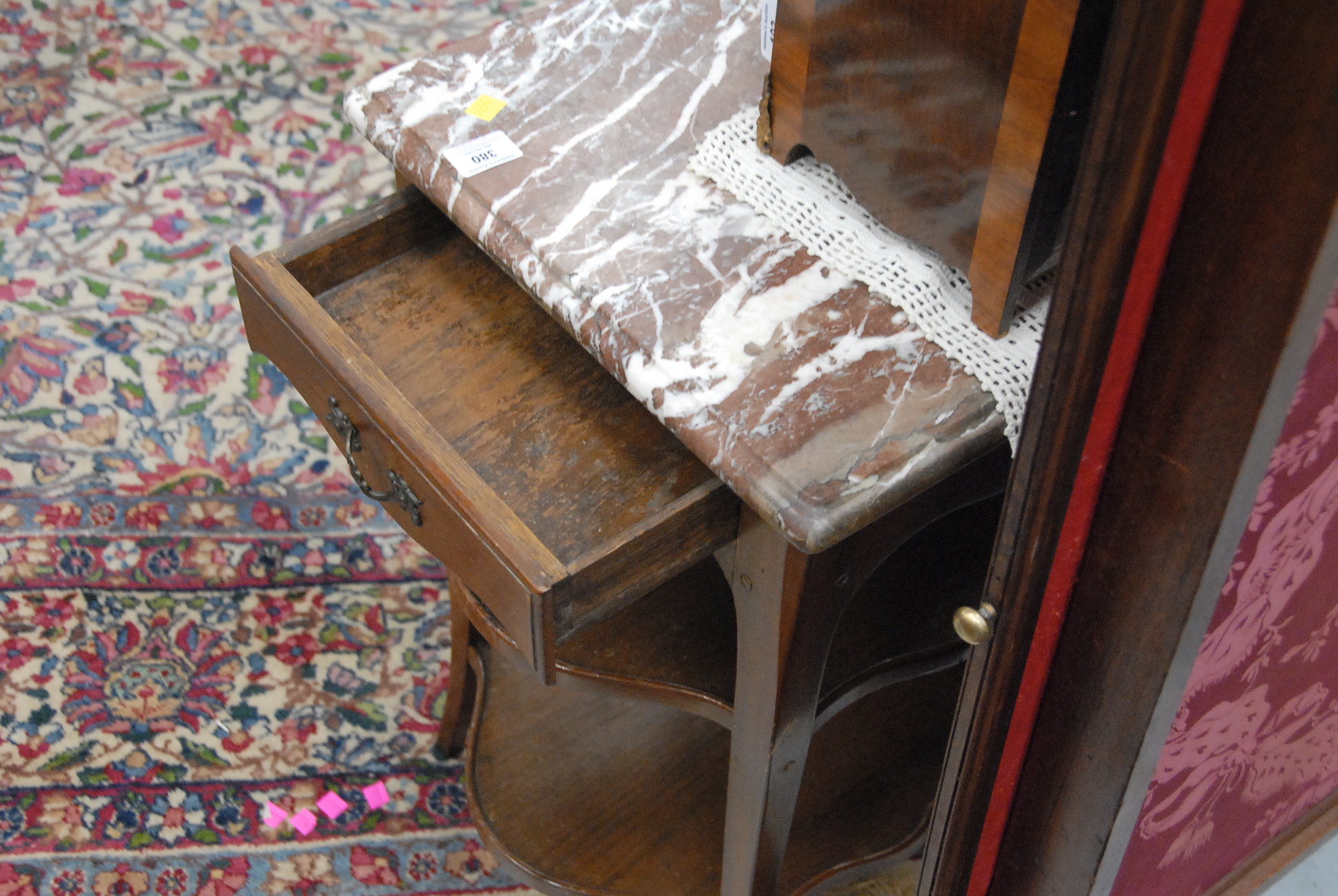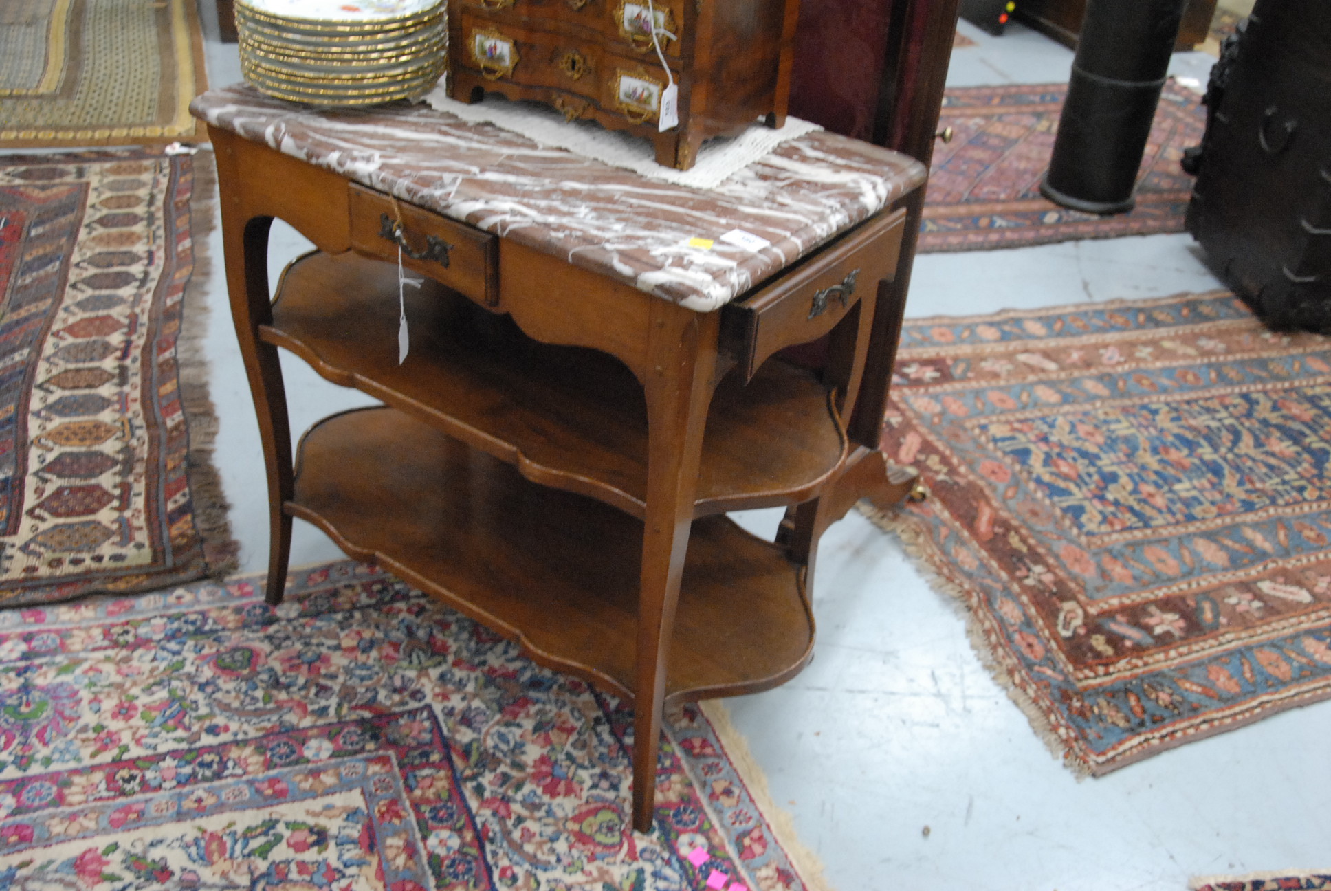 Lot 380: Custom Louis XV style table with marble top and three drawers, one on either end and one in the middle, over two shelves set on cabriole legs. ht. 27in. wd. 26in. 16 1/2in.