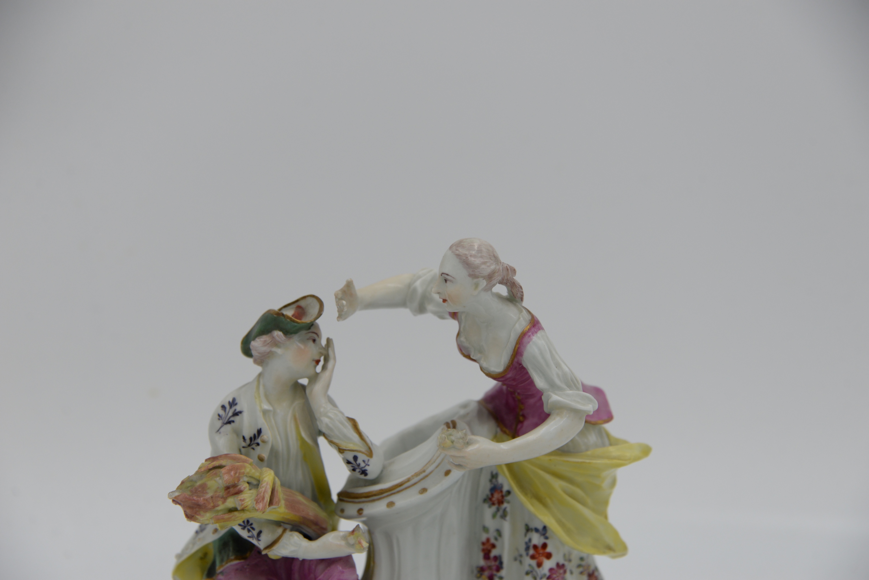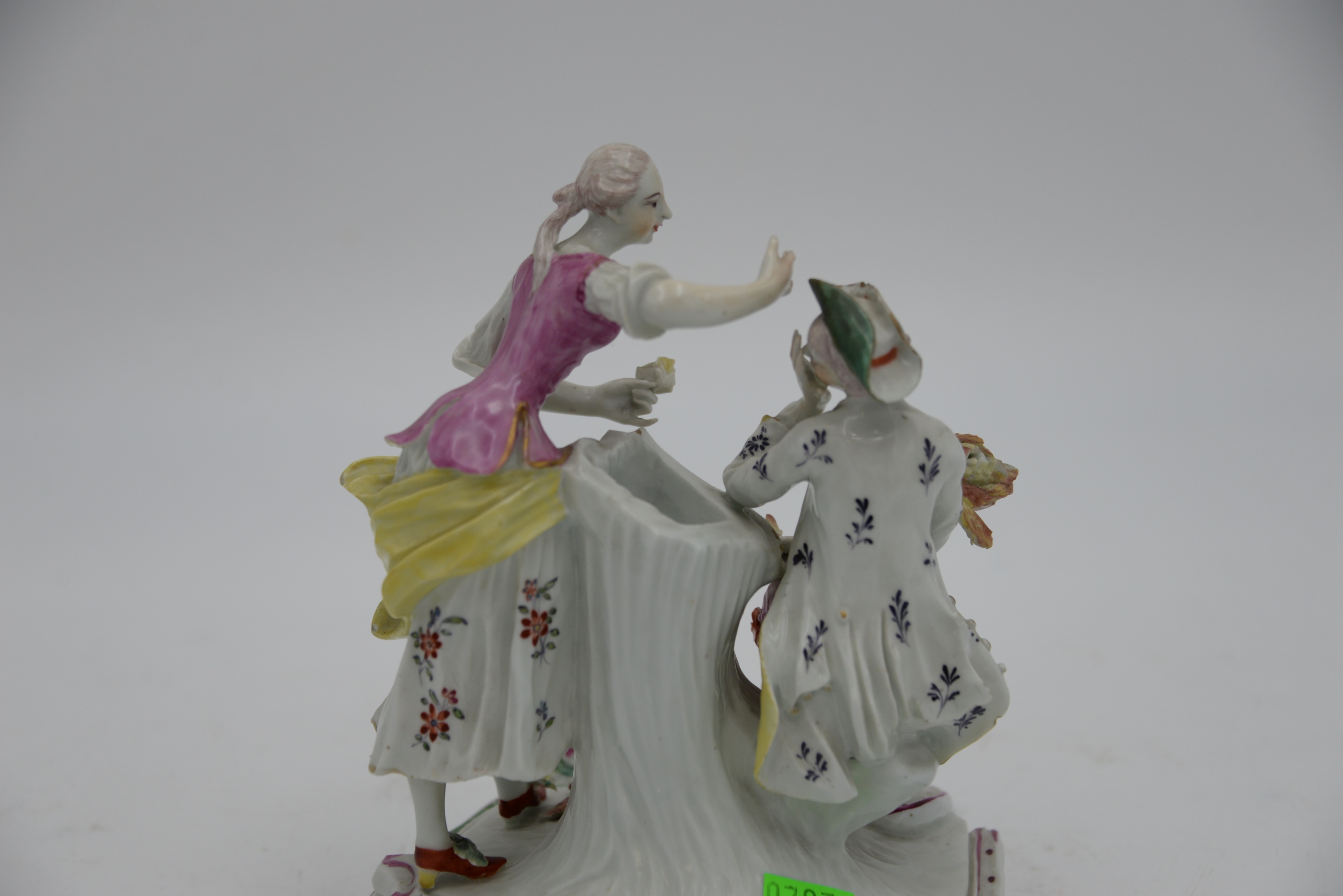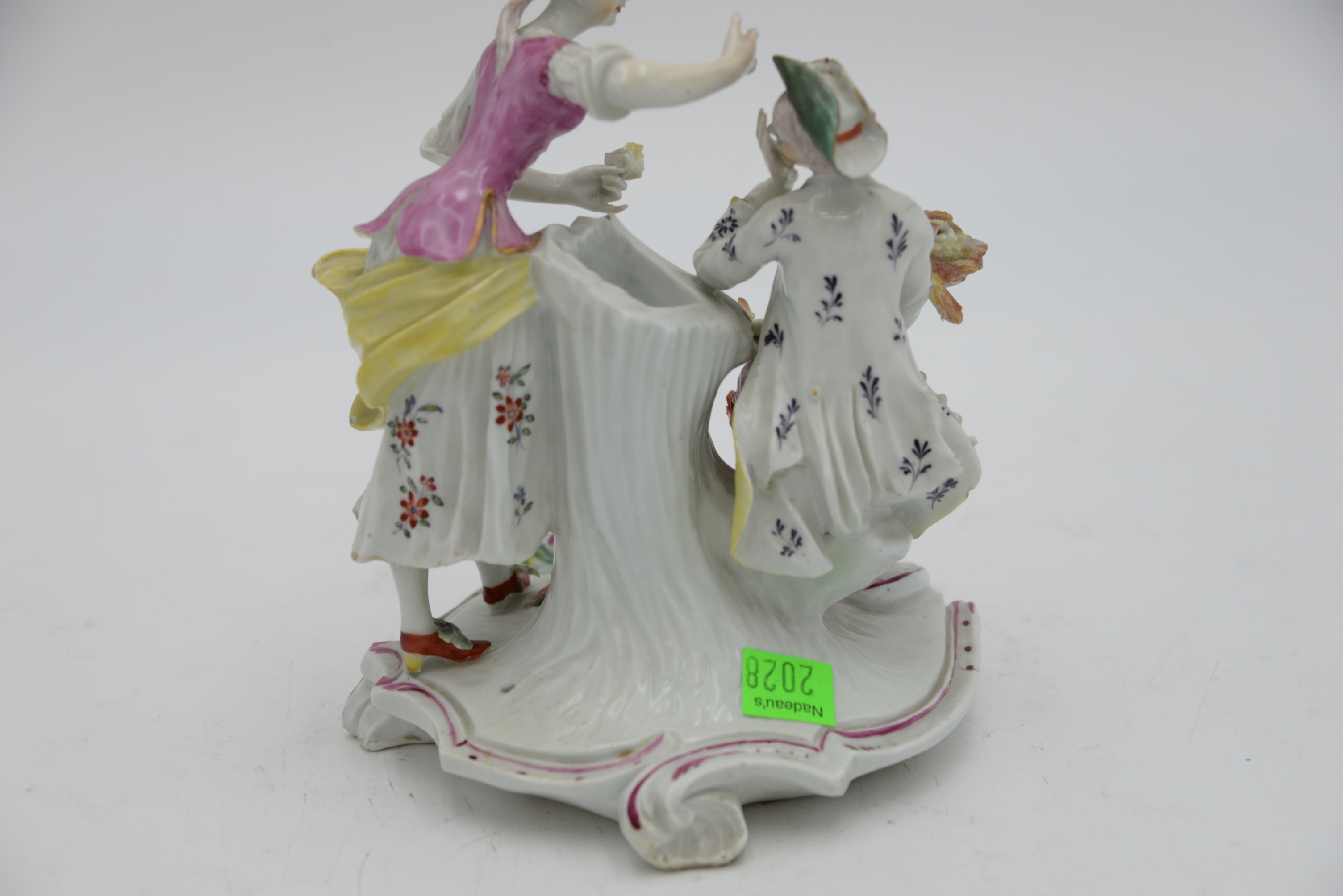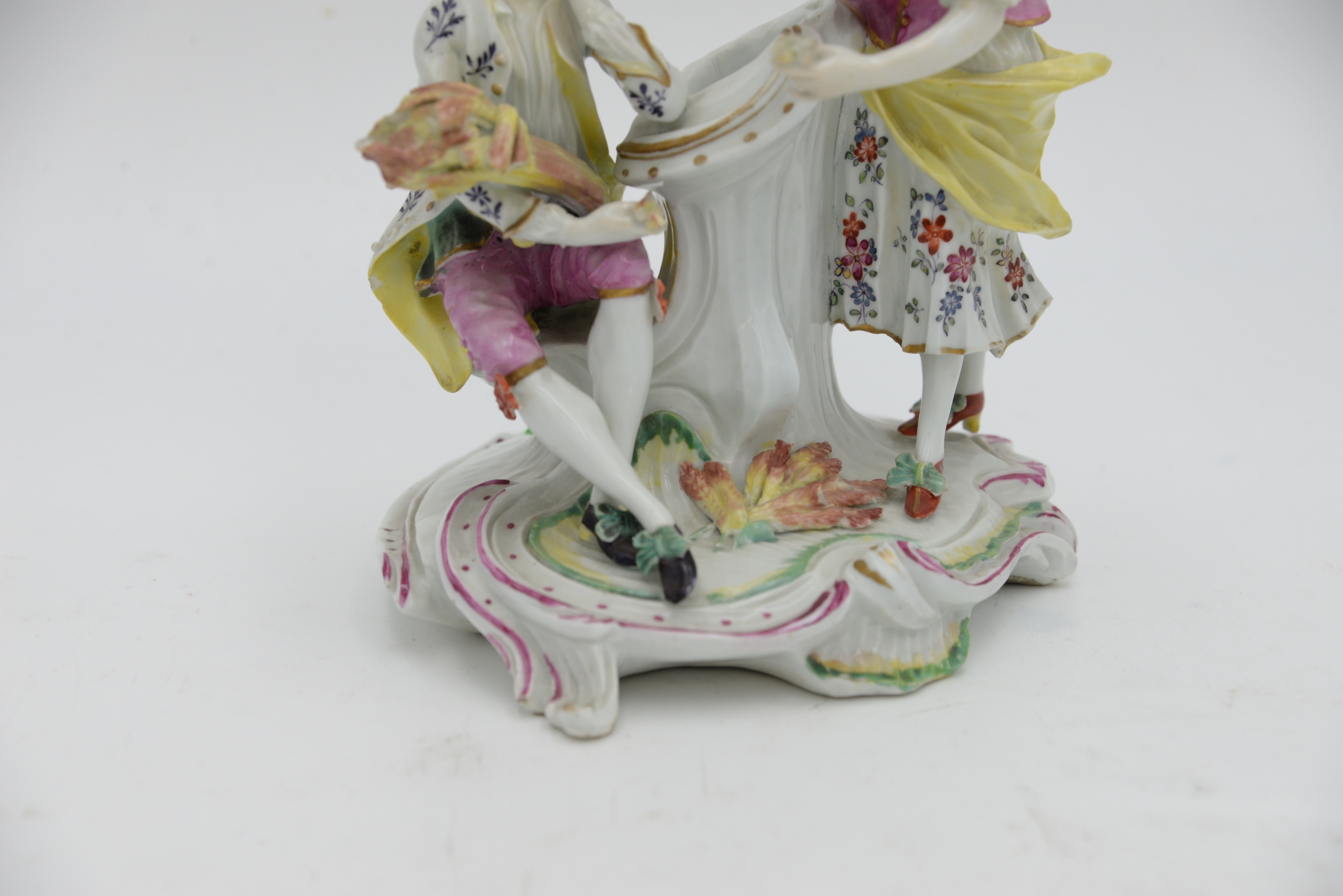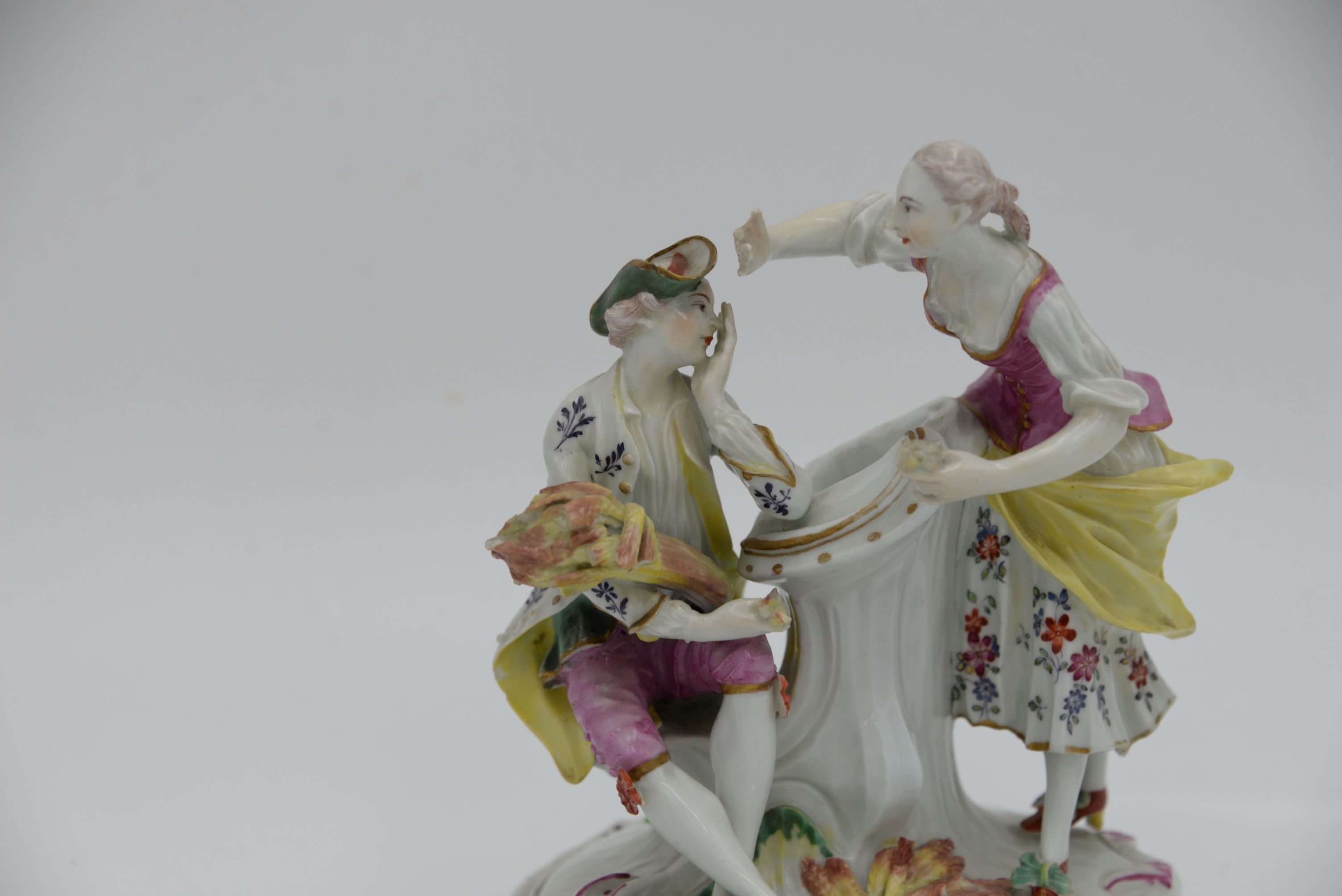 Derby Pale Family Porcelain Group, 18th century, comprising a couple, modelled as a young man in flowered white coat, holding a sheaf of wheat, seated on a tree stump, his companion in puce bodice yellow apron and flowered skirt leaning toward him, on a rococo scroll base enriched with puce, green and yellow, height 7 inches. Provenance: Parke-Bernet Galleries, June 1970 sale, item #49, Julius H Jacobson II a Fifth Avenue Estate.