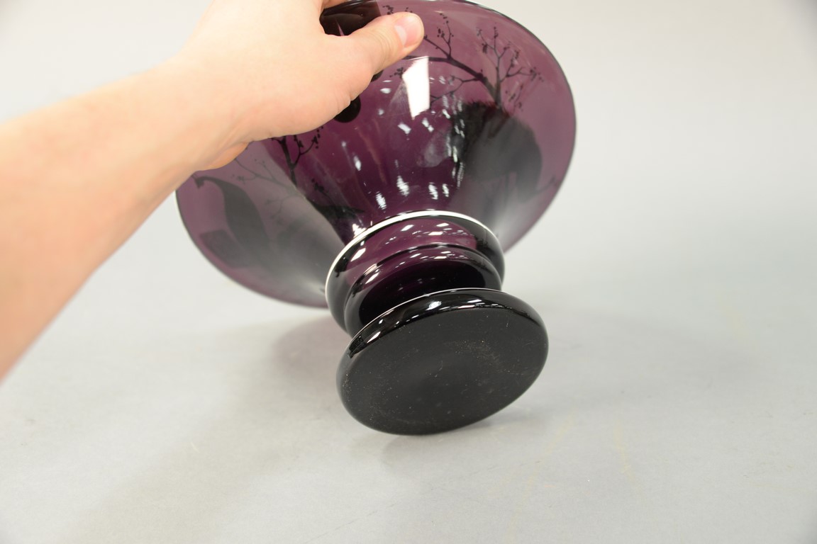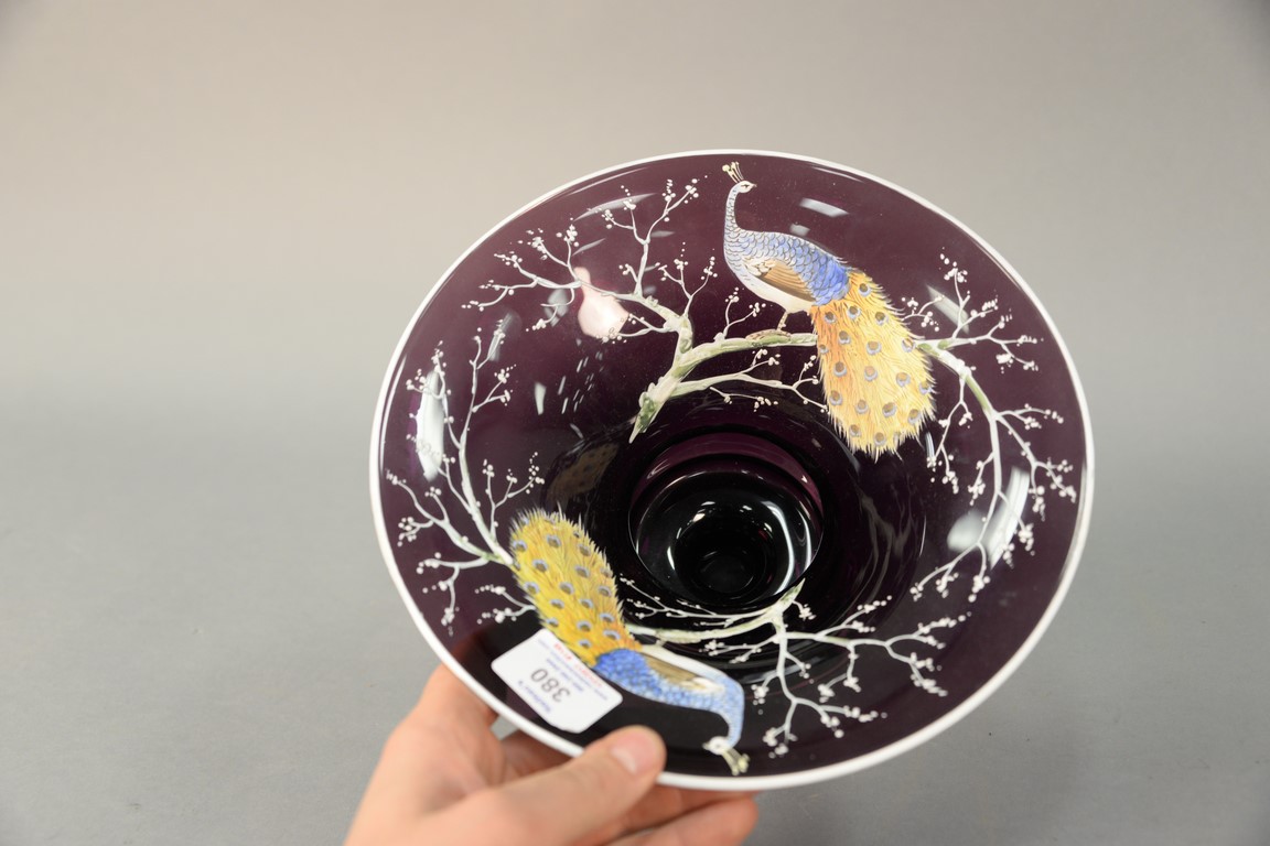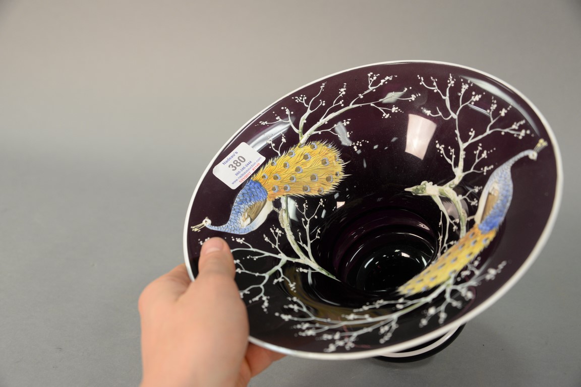 Lot 380: Enameled Amethyst glass vase having two enameled peacocks perched on snowy tree branches, ht. 6 1/4in., dia. 10in.