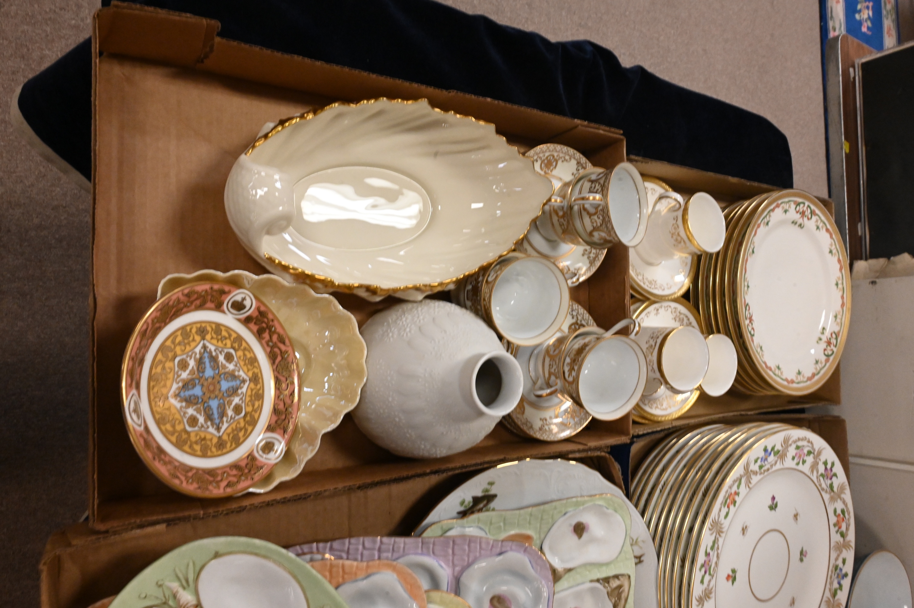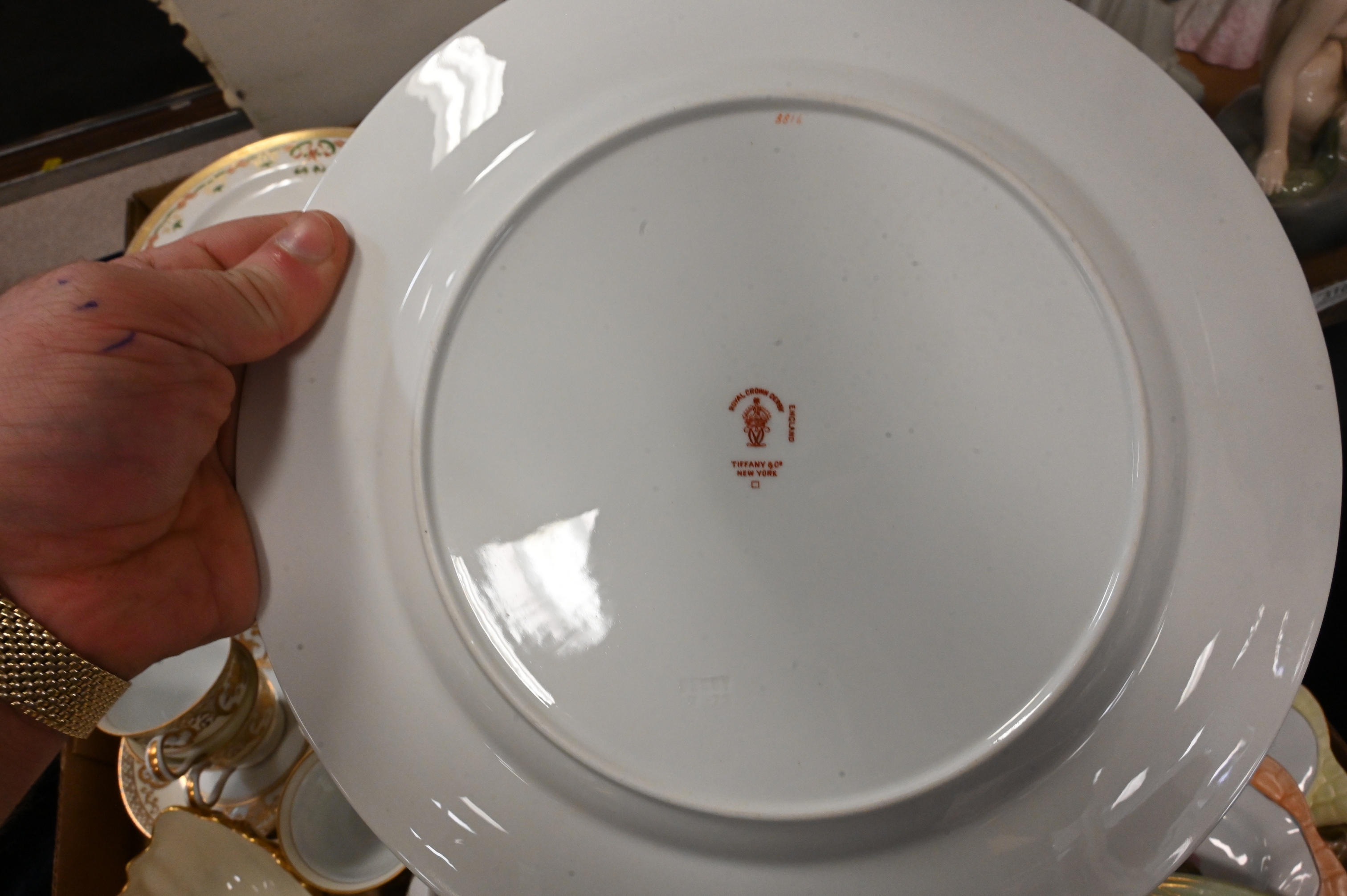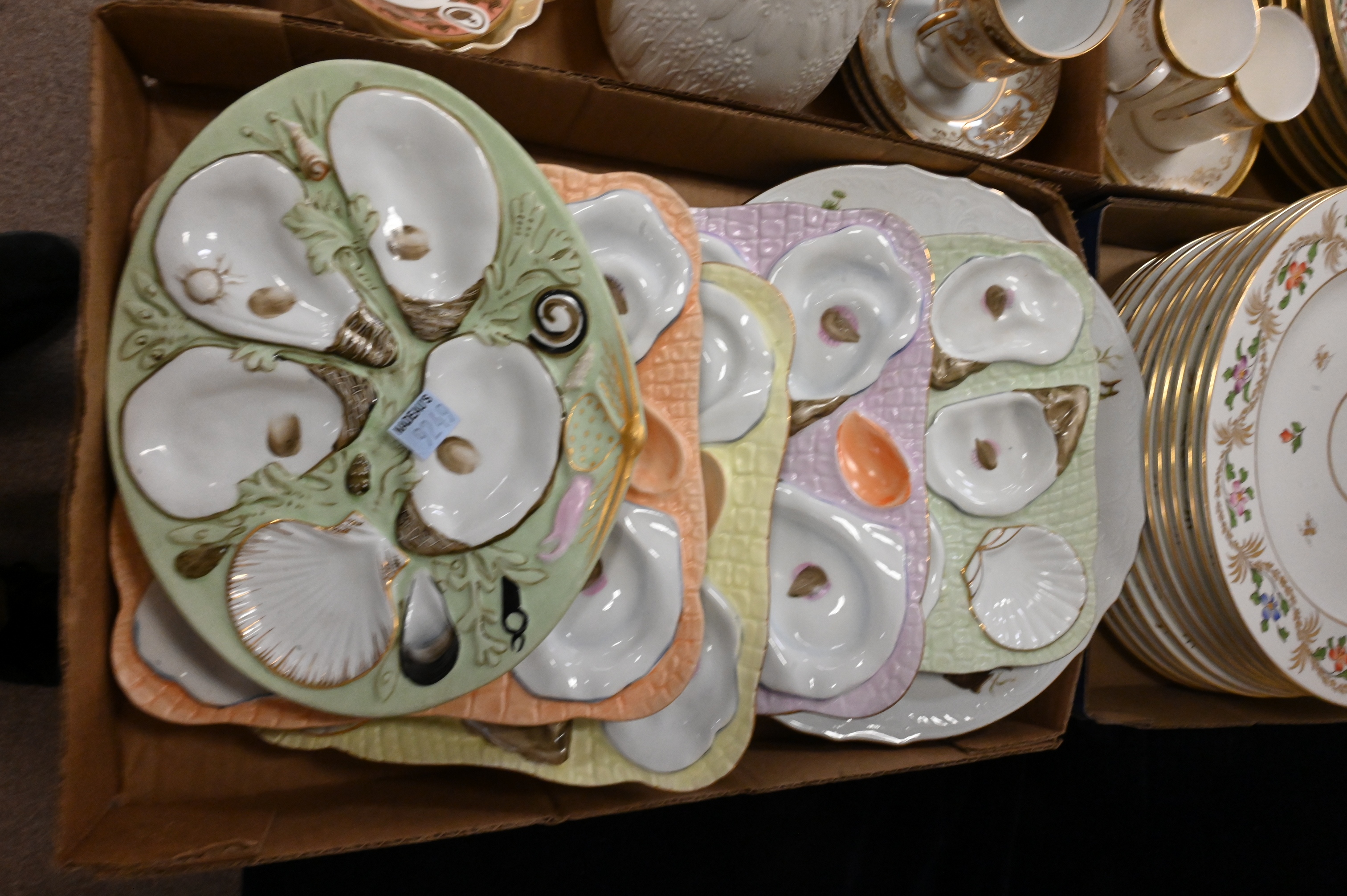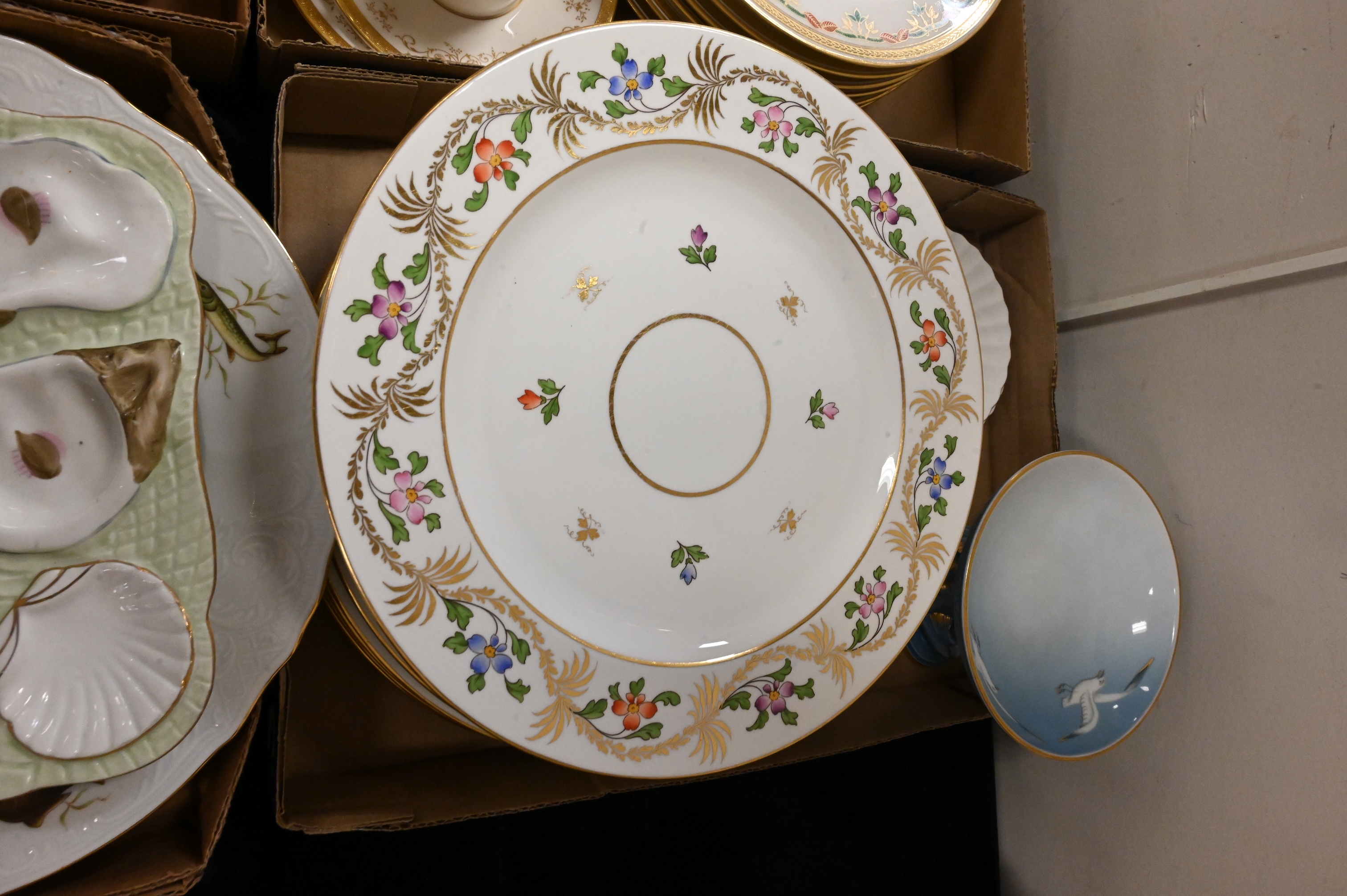 five Union Porcelain Works style contemporary oyster plates, Haviland Limoges luncheon plates, Royal Crown Derby and Tiffany & Co. dinner plates (diameter 10 inches), demitasse cups, saucers, Denmark dolphin pedestal dish etc…