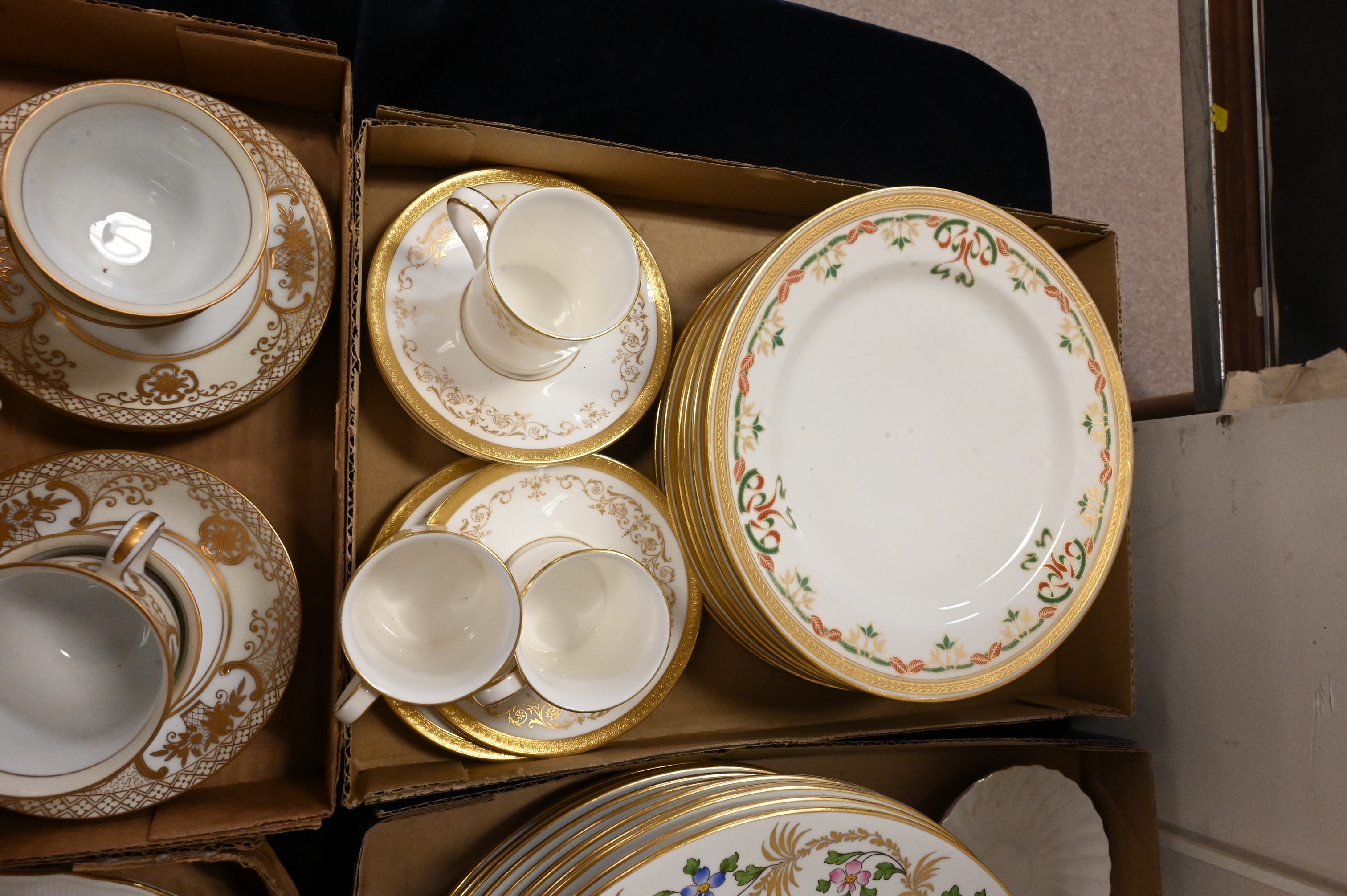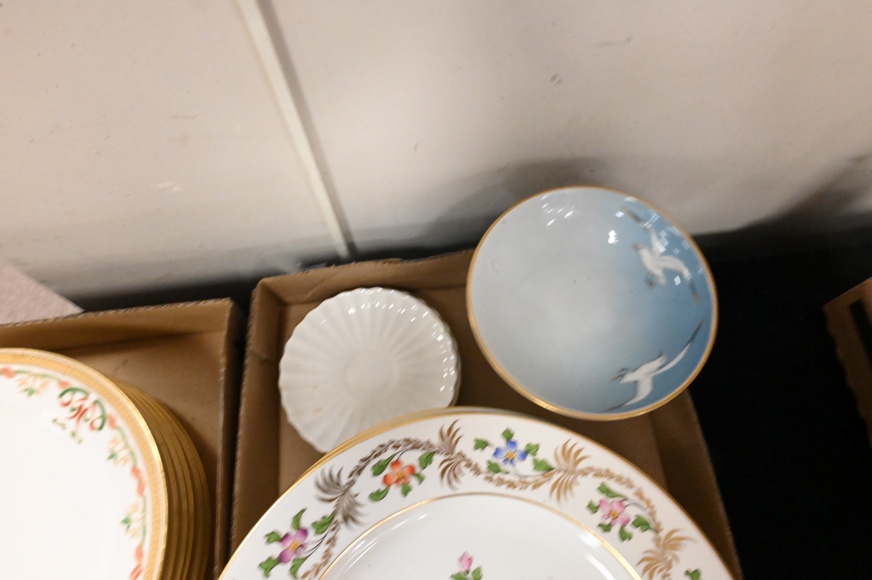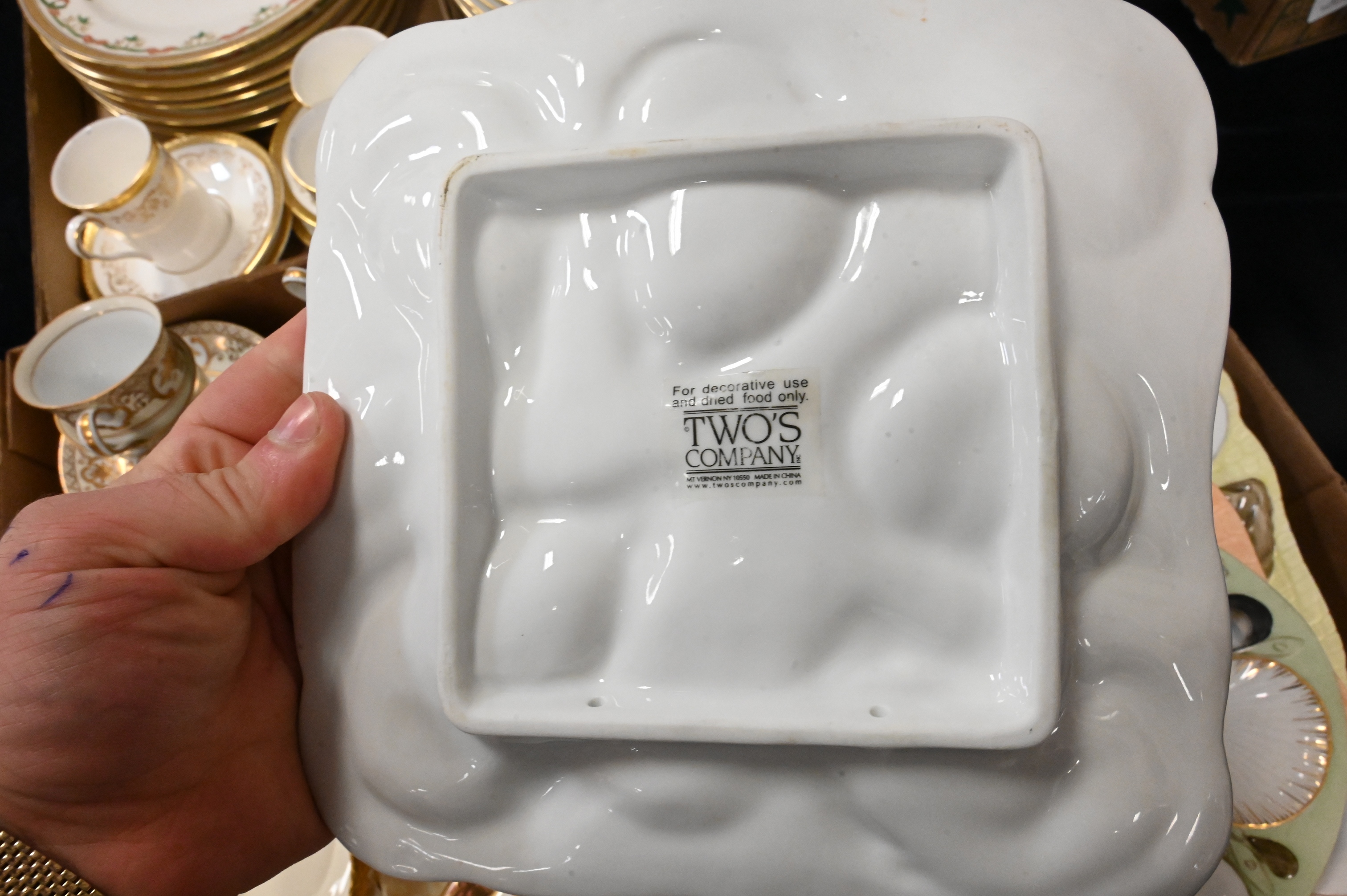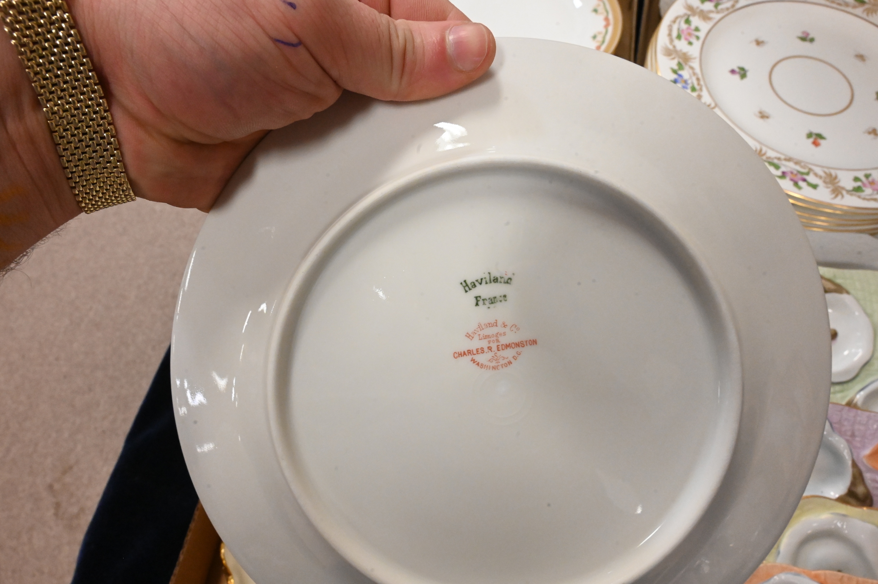 five Union Porcelain Works style contemporary oyster plates, Haviland Limoges luncheon plates, Royal Crown Derby and Tiffany & Co. dinner plates (diameter 10 inches), demitasse cups, saucers, Denmark dolphin pedestal dish etc…