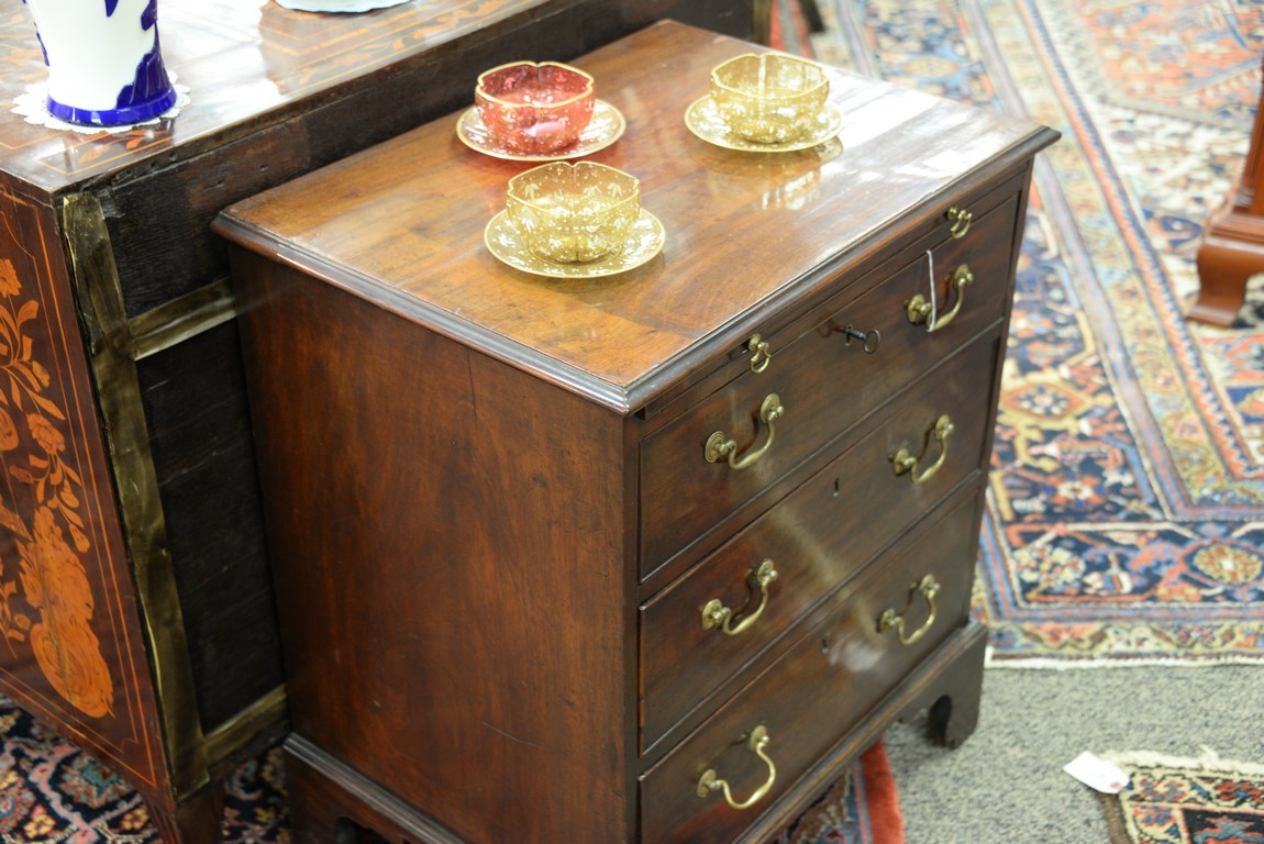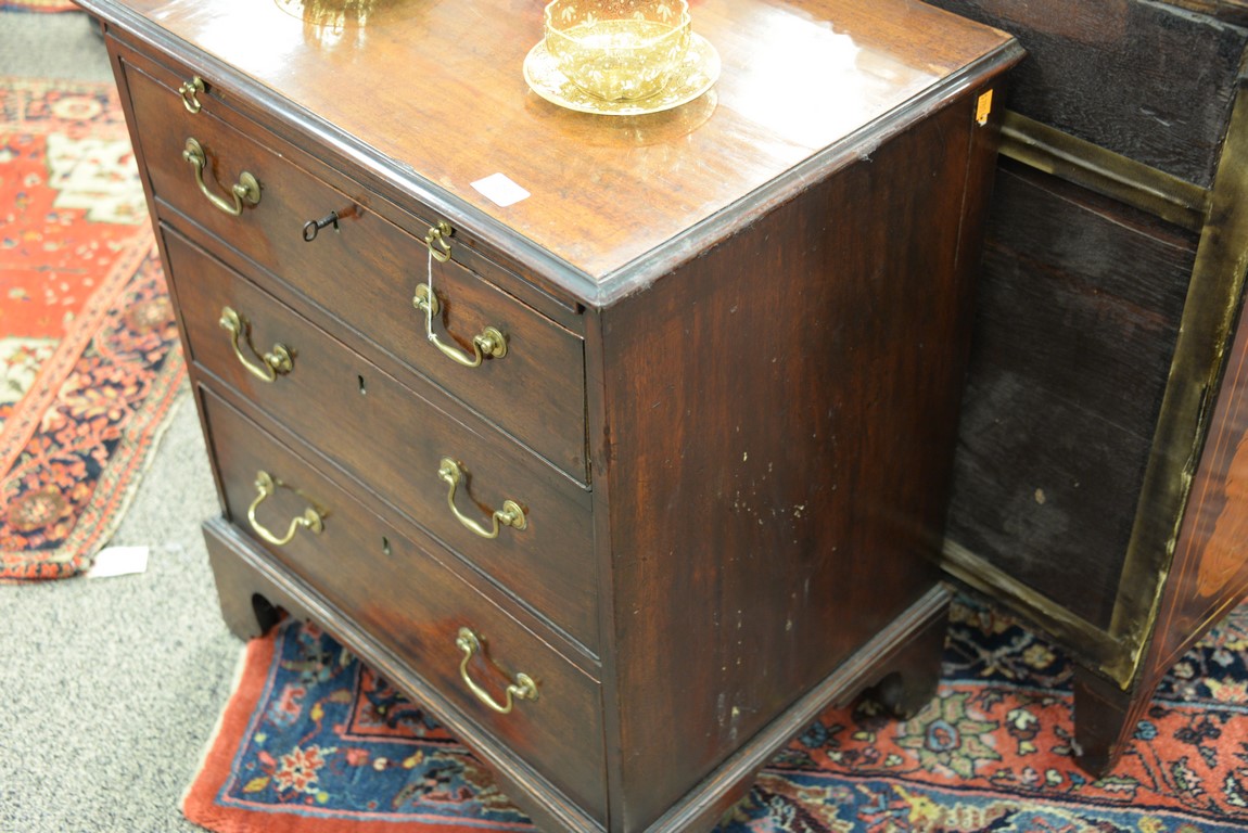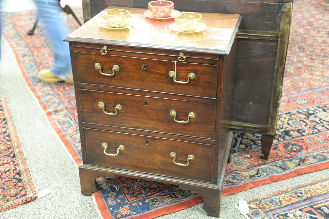 Lot 380: George III mahogany bachelors chest having pull out slide over three drawers all set on bracket base, 19th century. ht. 30 in. wd…