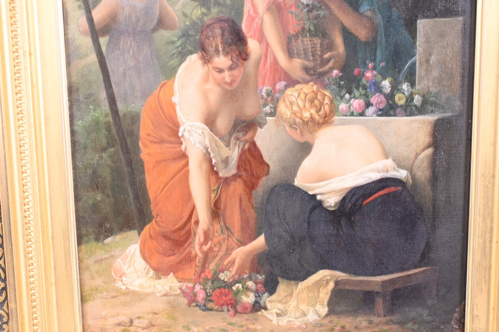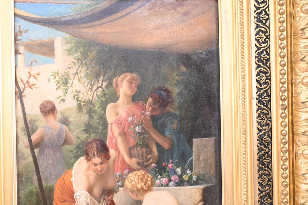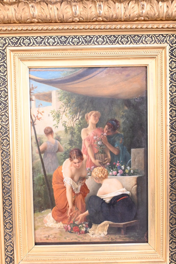 Lot 380: Gustave Clarence Rodolphe Boulanger (1824 – 1888), depicting four women with flowers having Orientalist style house in background, o…