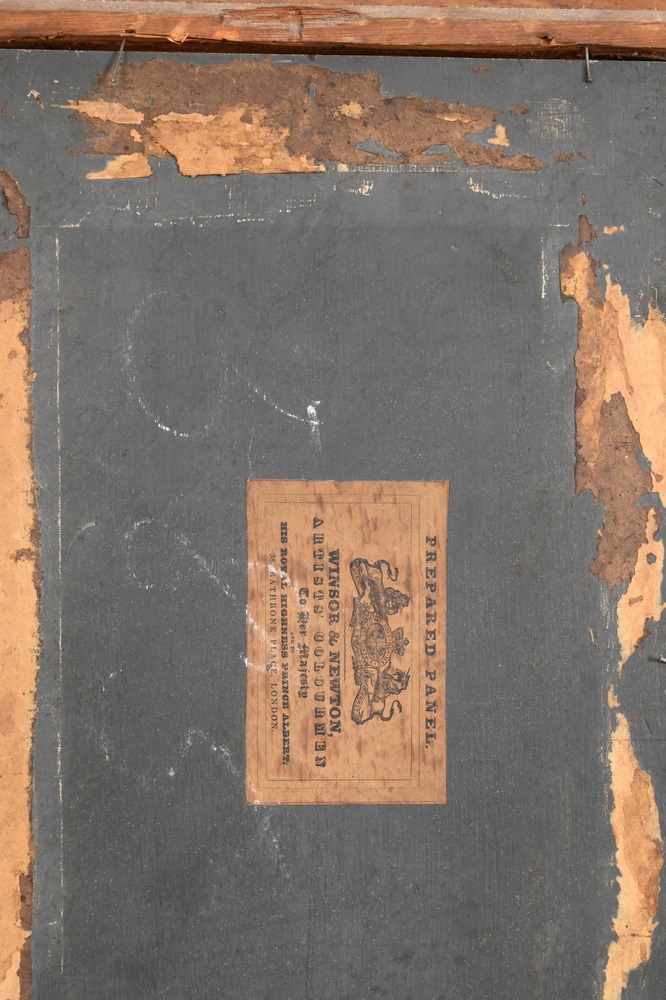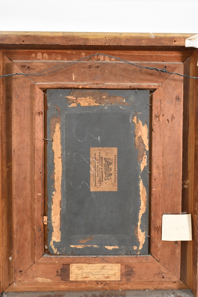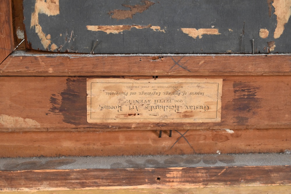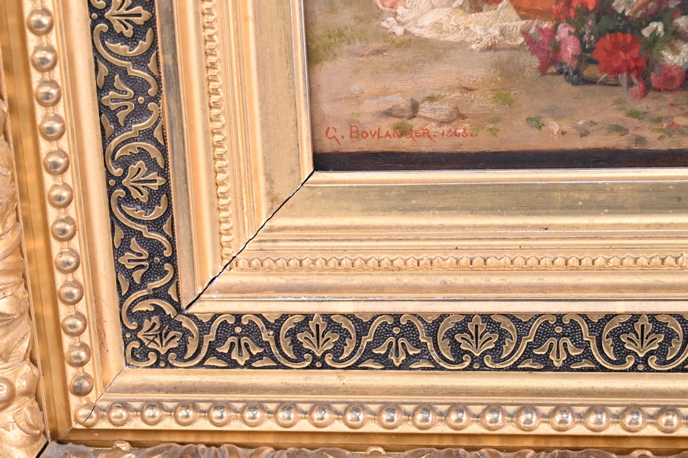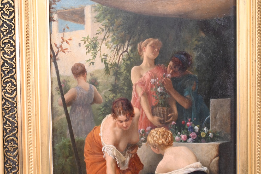 Gustave Clarence Rodolphe Boulanger (1824 – 1888), depicting four women with flowers having Orientalist style house in background, oil on panel, signed and dated lower left G. Boulanger 1868, in 19th century gilt frame, 16″ x 10″. Gustav Reichard’s Art Rooms label and Winsor & Newton Artists Colourmen label on back.
