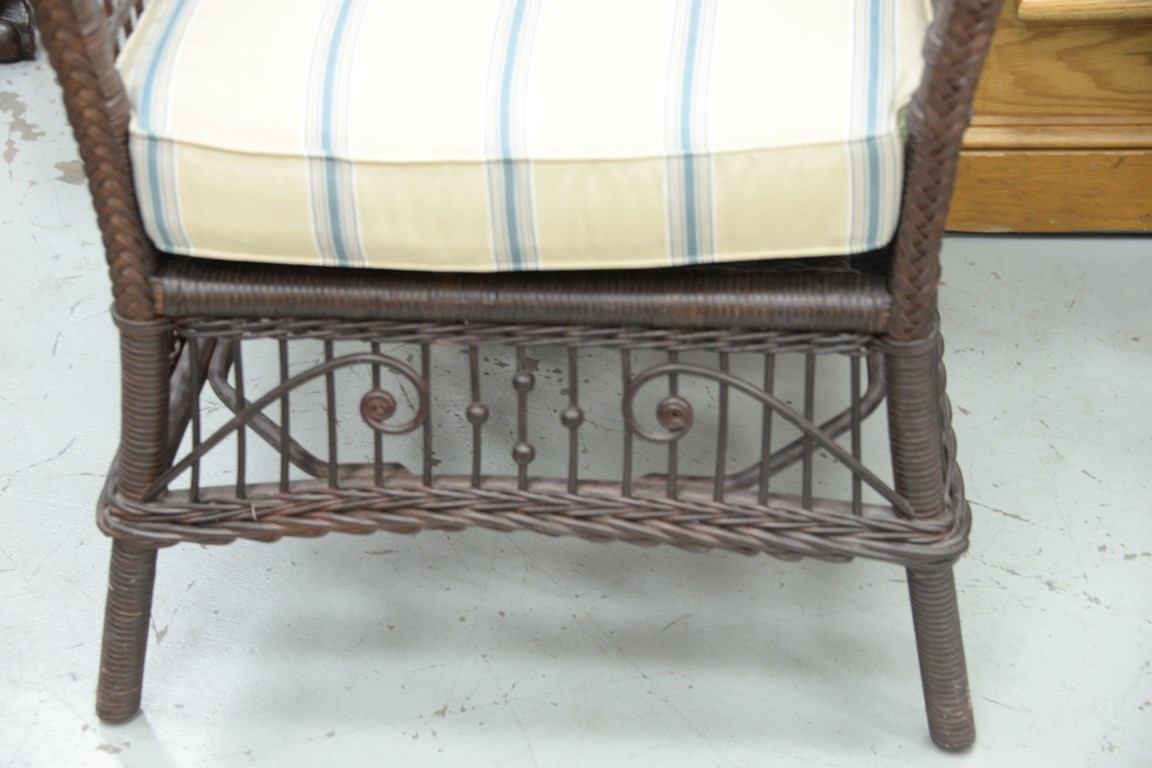 Hickory wicker chair with cushions. ht. 45 1/2 in. wd. 23 in.