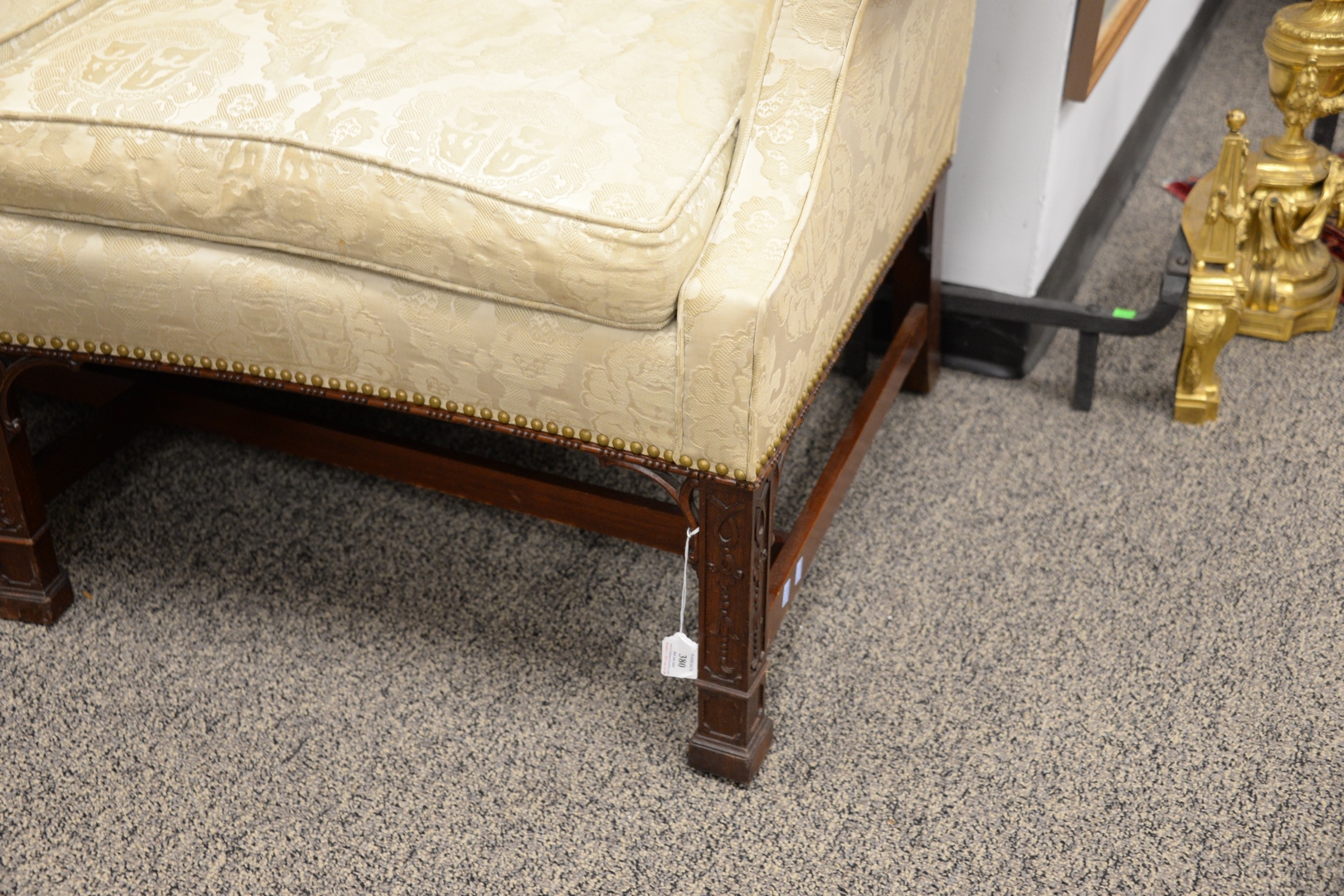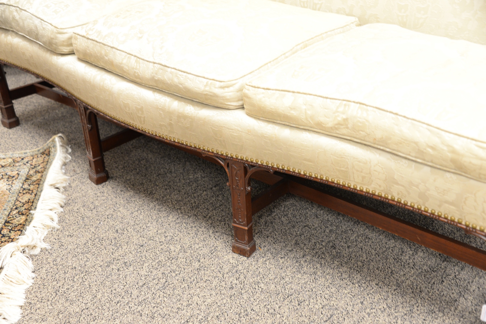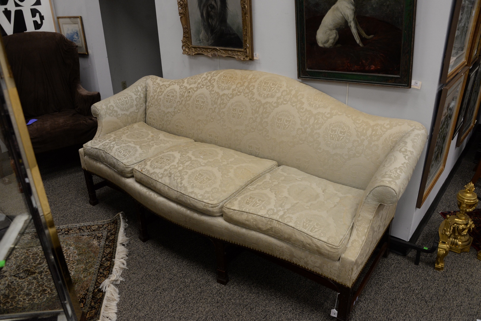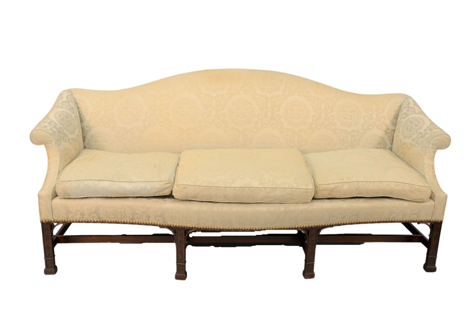 Lot 380: Margolis Chinese Chippendale Style Sofa with camelback and rolled arms, with blind carved legs height 37 inches, length 84 inches Pr…