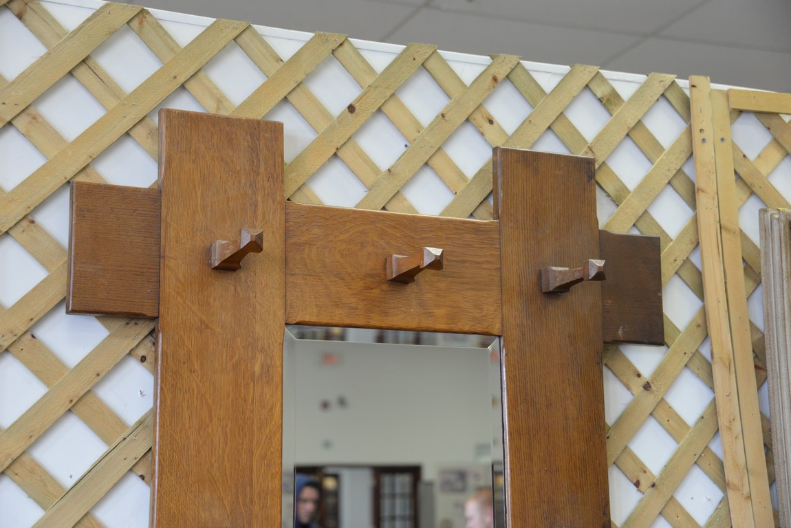 Mission oak style hall mirror with wood hat hooks. 43 1/2 x 36 1/2