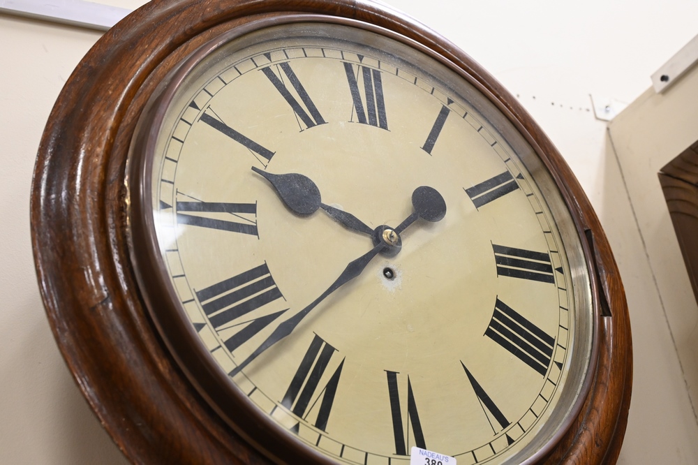 Lot 380: Oak Schoolhouse Clock, having brass works and pendulum, diameter 23 inches, Provenance: Connecticut Personal Collection of American Antiques and Oriental Rugs.