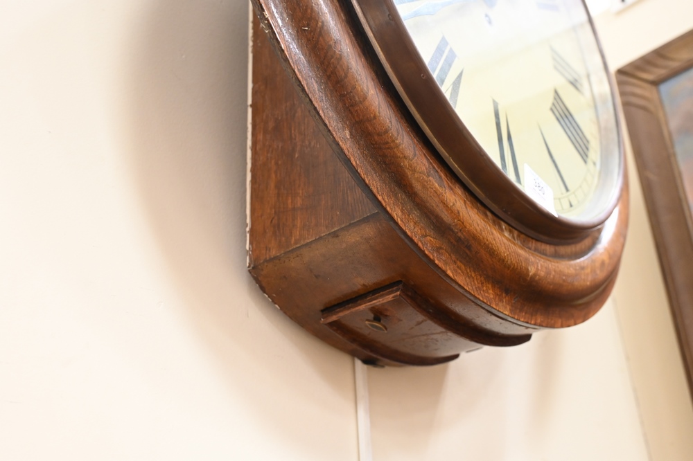 Oak Schoolhouse Clock, having brass works and pendulum, diameter 23 inches, Provenance: Connecticut Personal Collection of American Antiques and Oriental Rugs.