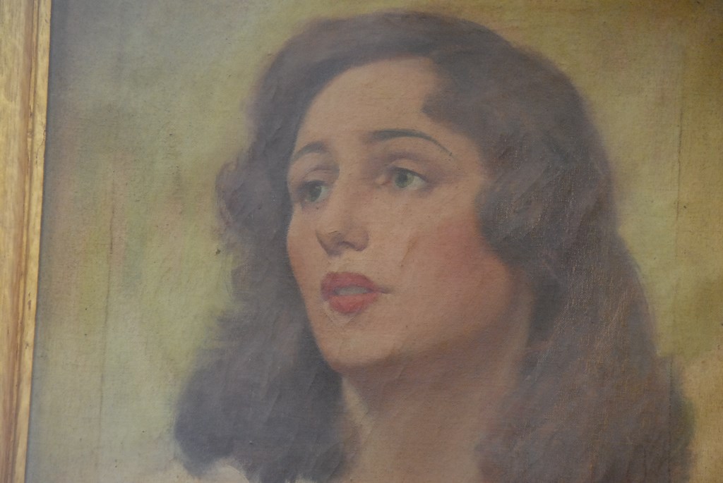 Oil on canvas bust of woman in gold frame initialed lower right in gold frame.