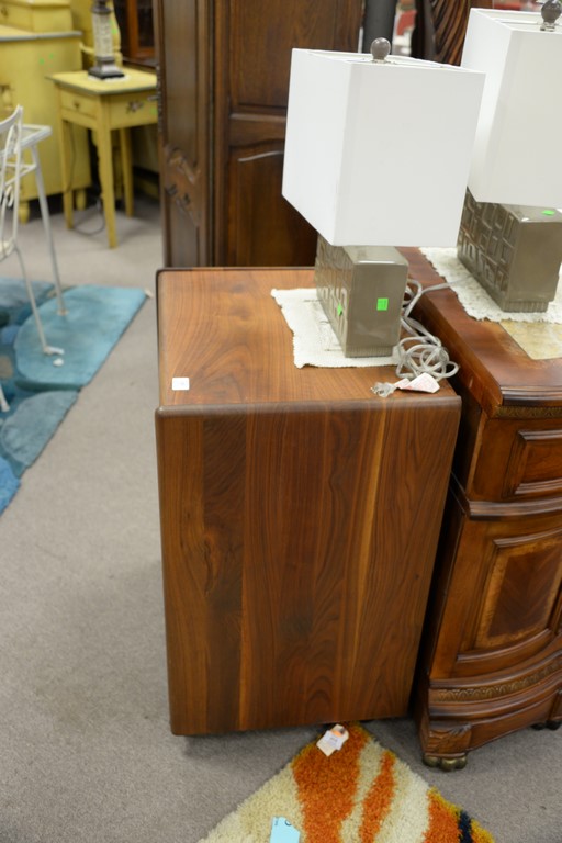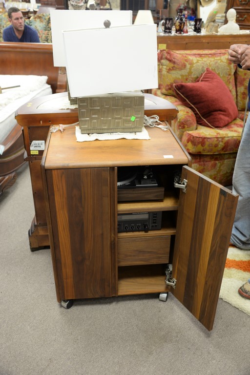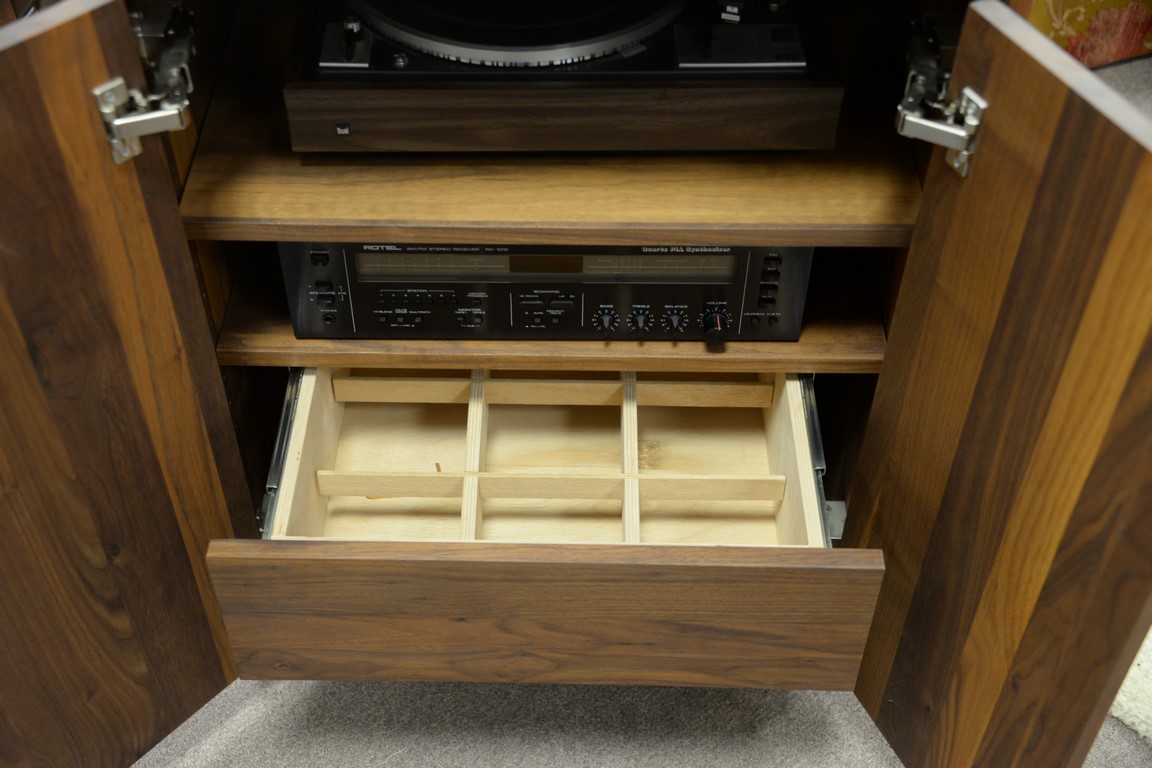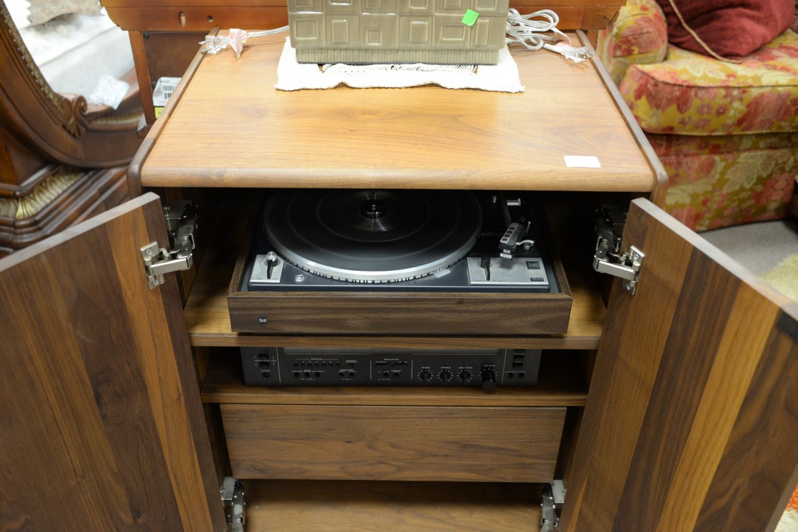 Teak music cabinet with dual turntable and Rotel AM/FM receiver.