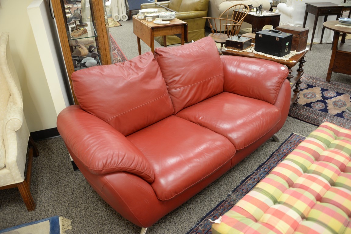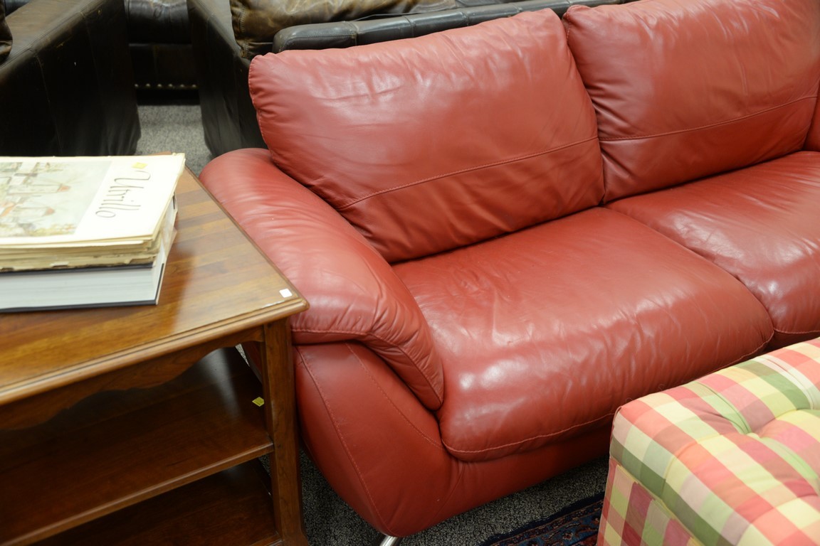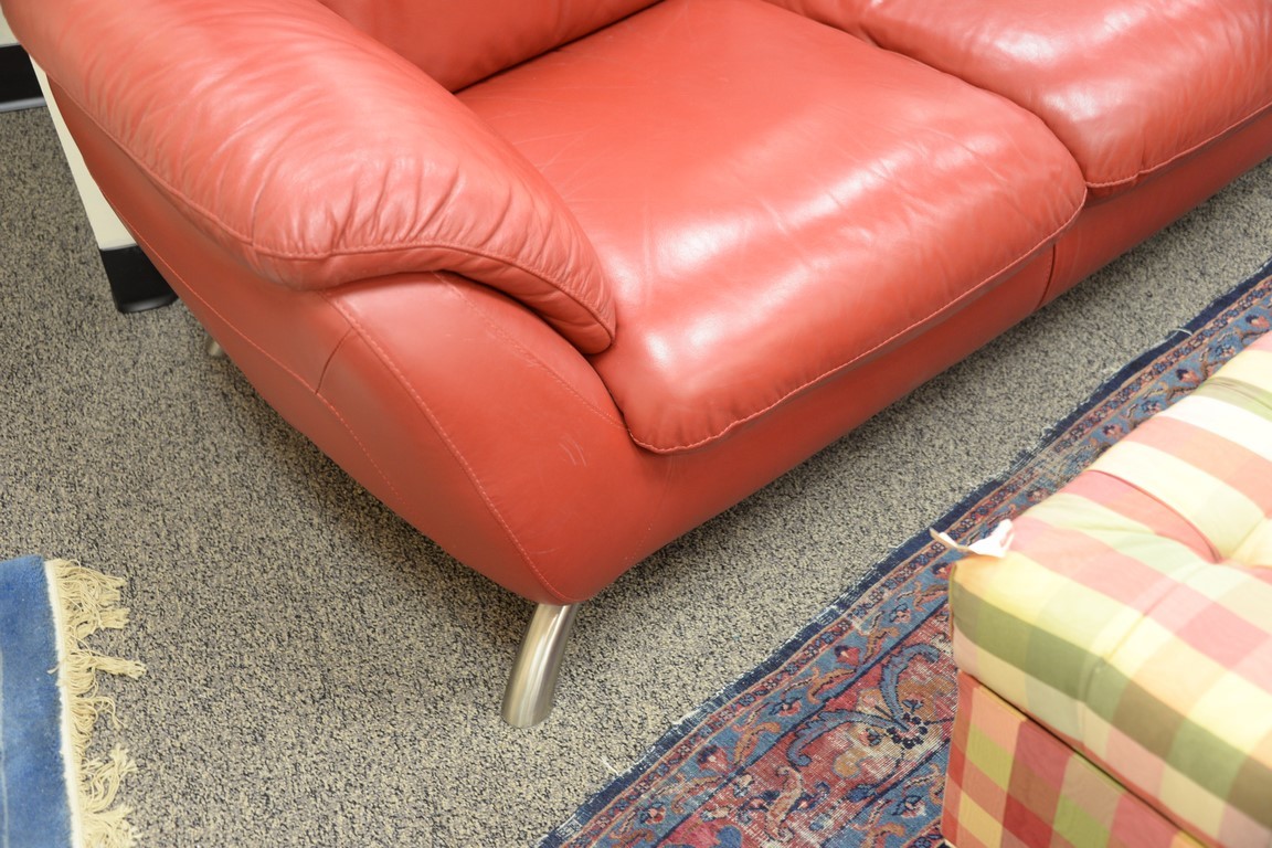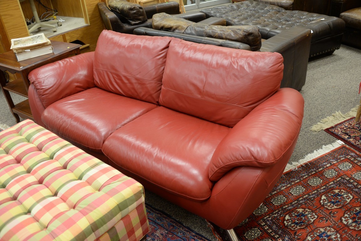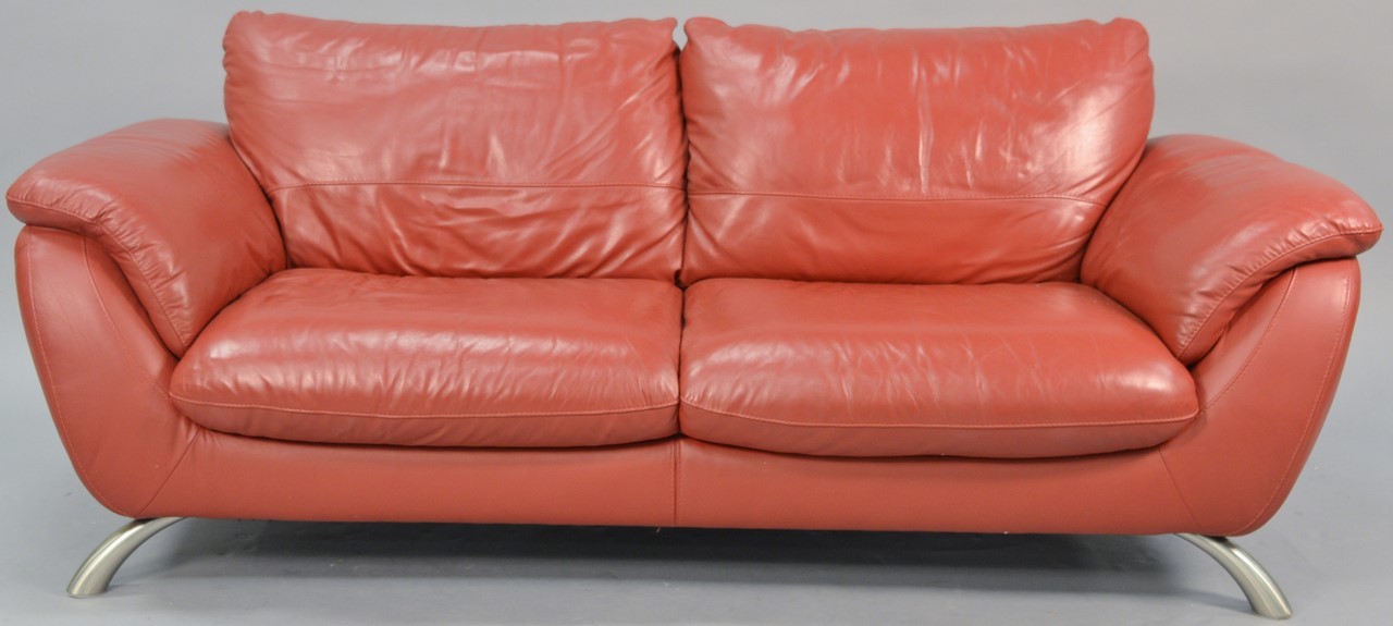Two matching Contemporary Italsofa red leather sofas with brushed steel legs. lg. 70 x 82