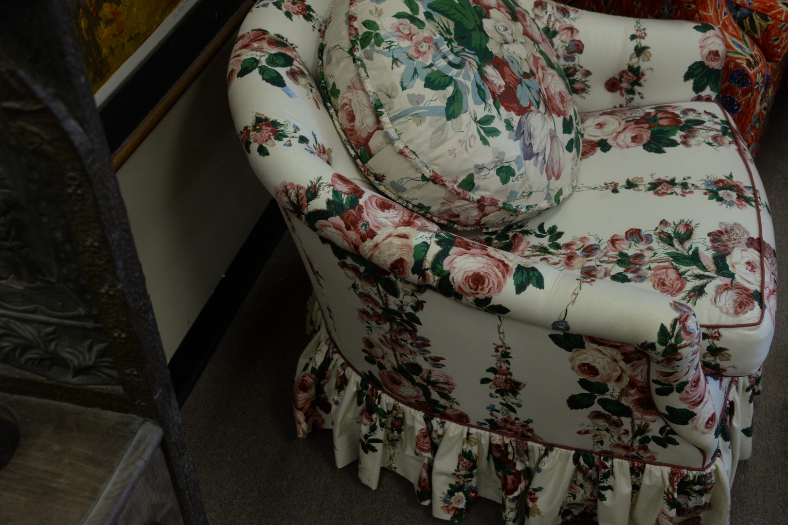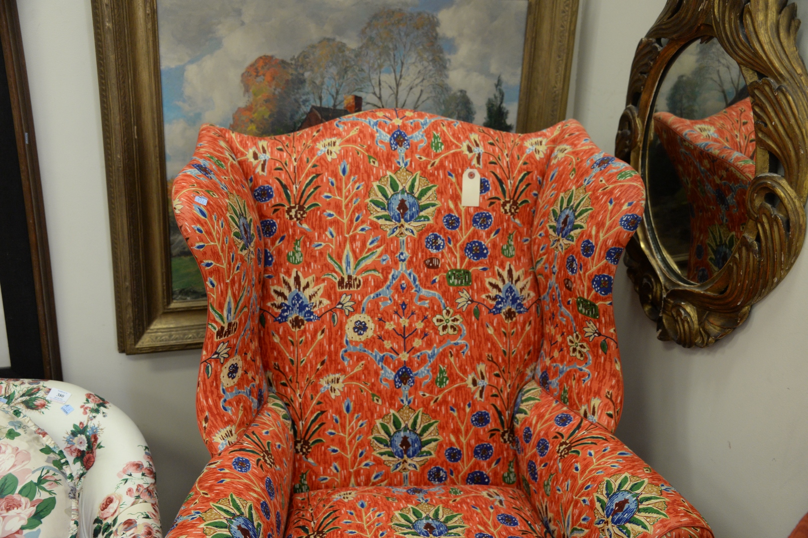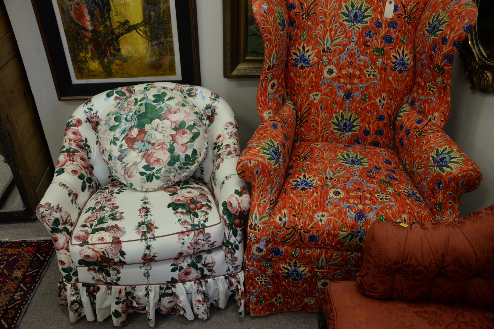 Lot 380: Two Piece Lot, to include custom upholstered swivel chair, along with custom upholstered wing chair, height 45 inches.