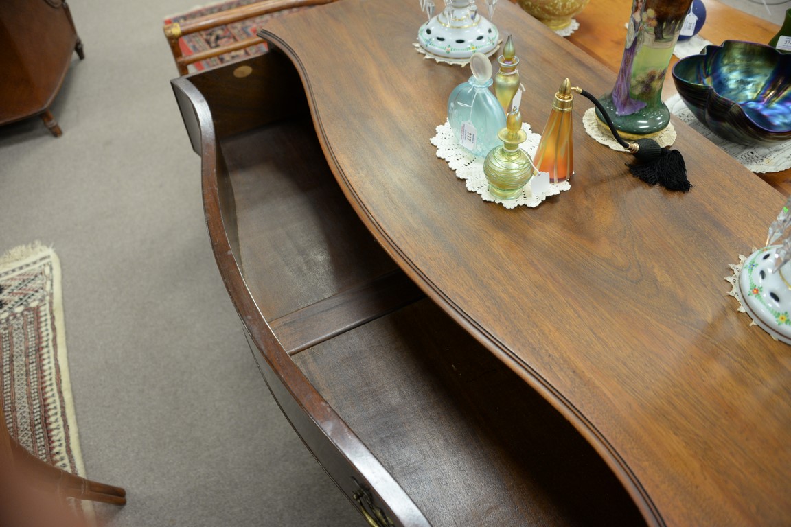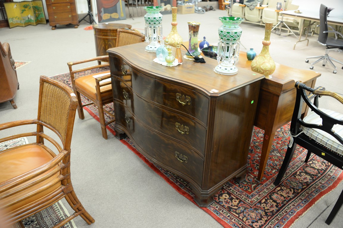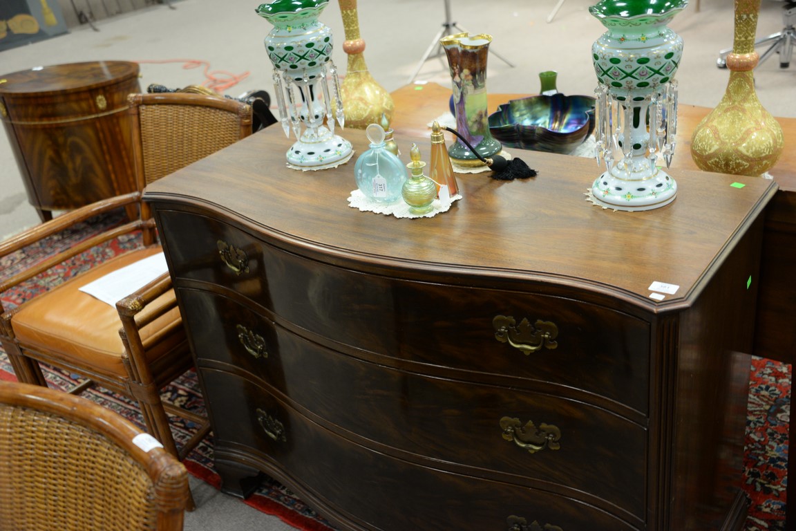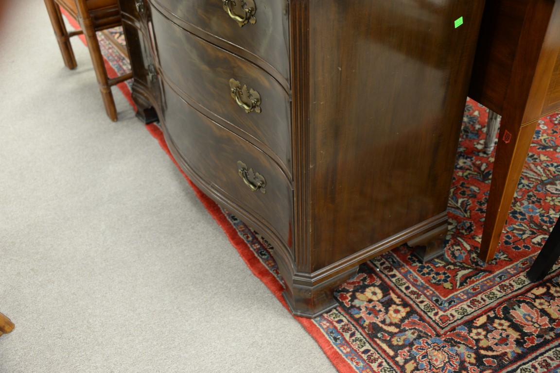 Baker mahogany serpentine front three drawer chest. ht. 34in., wd. 47in., dp. 21in.