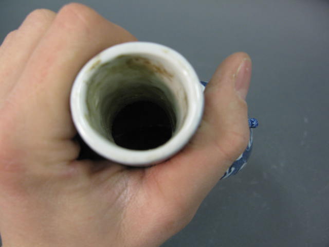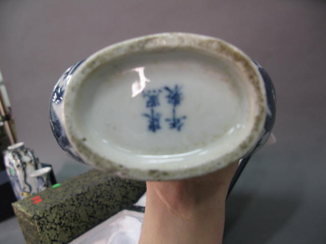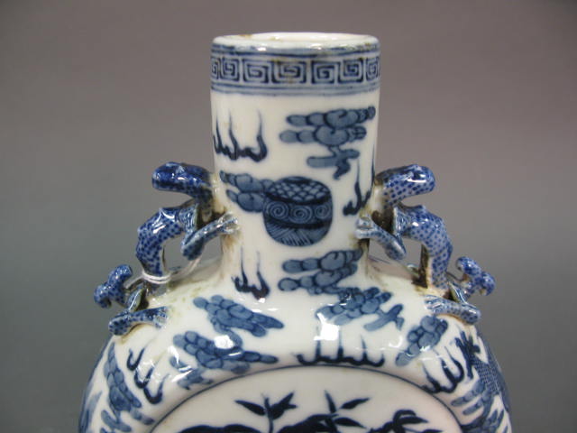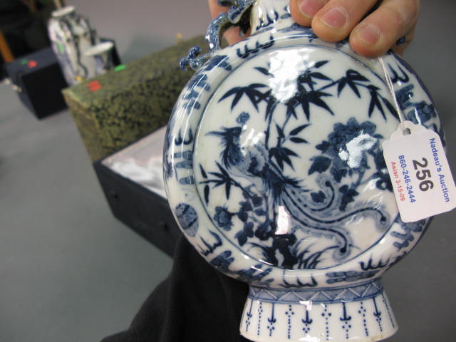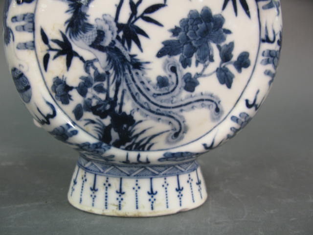 Blue and white phoenix bird moon flask with molded dragon handles, painted phoenix bird panels and Kang Xi mark, in fitted case
