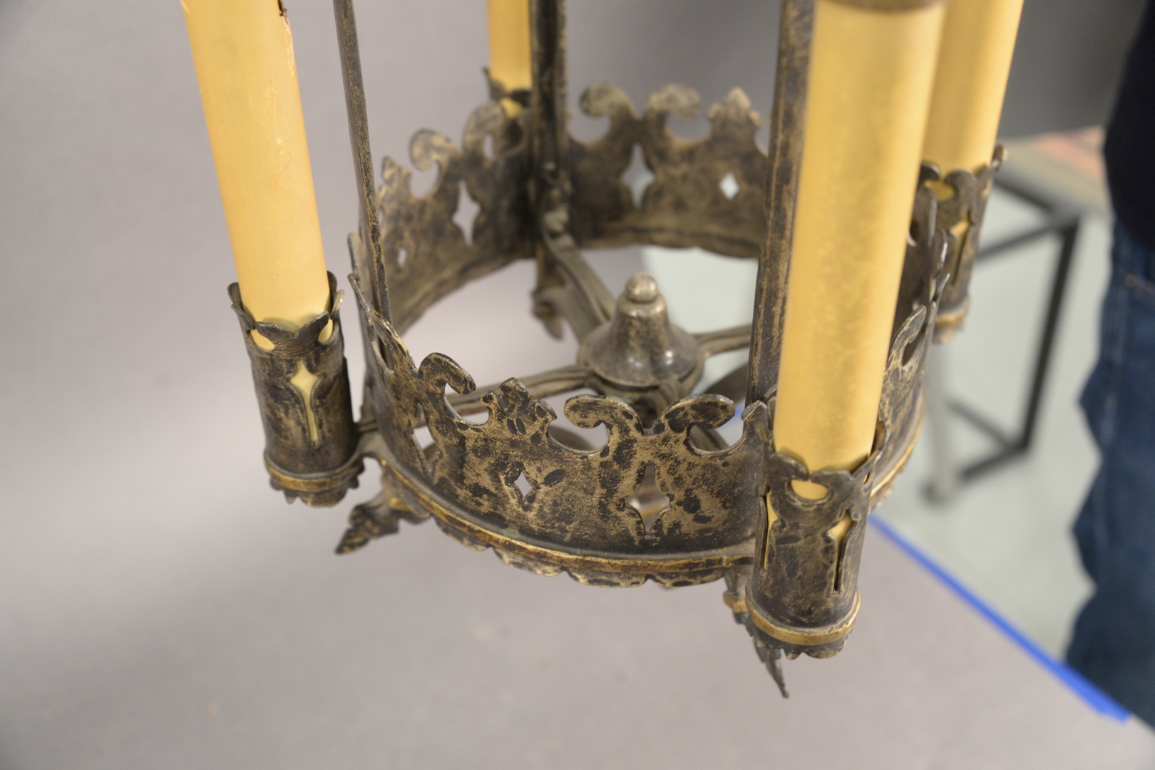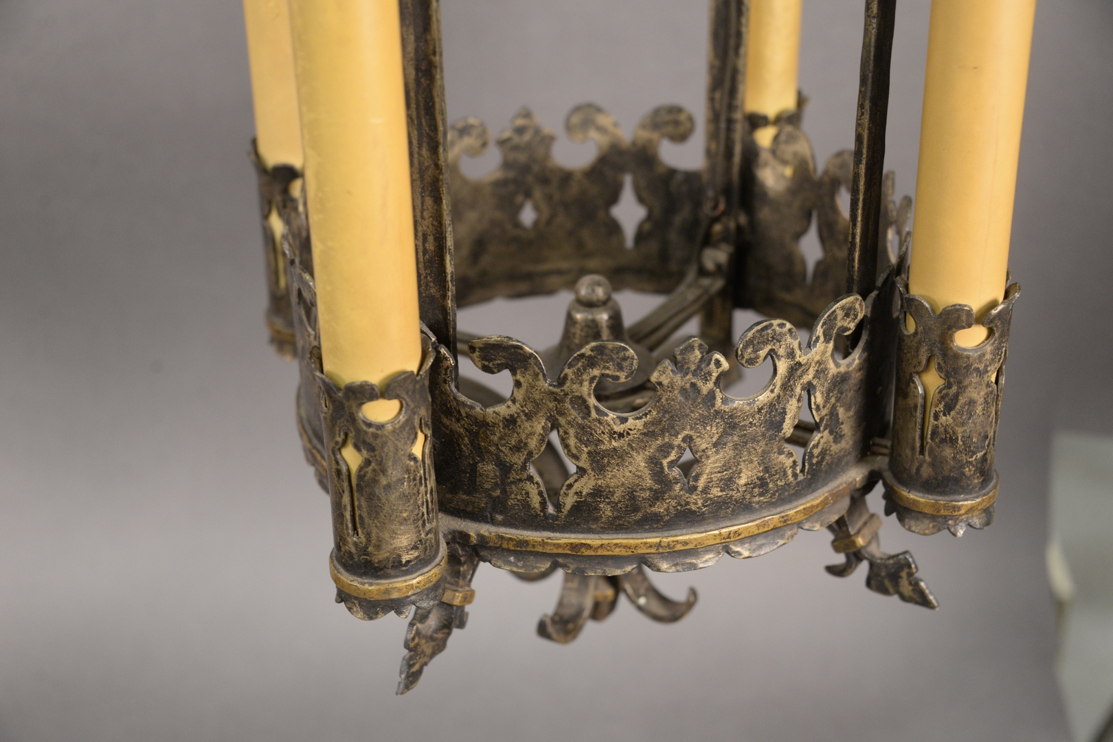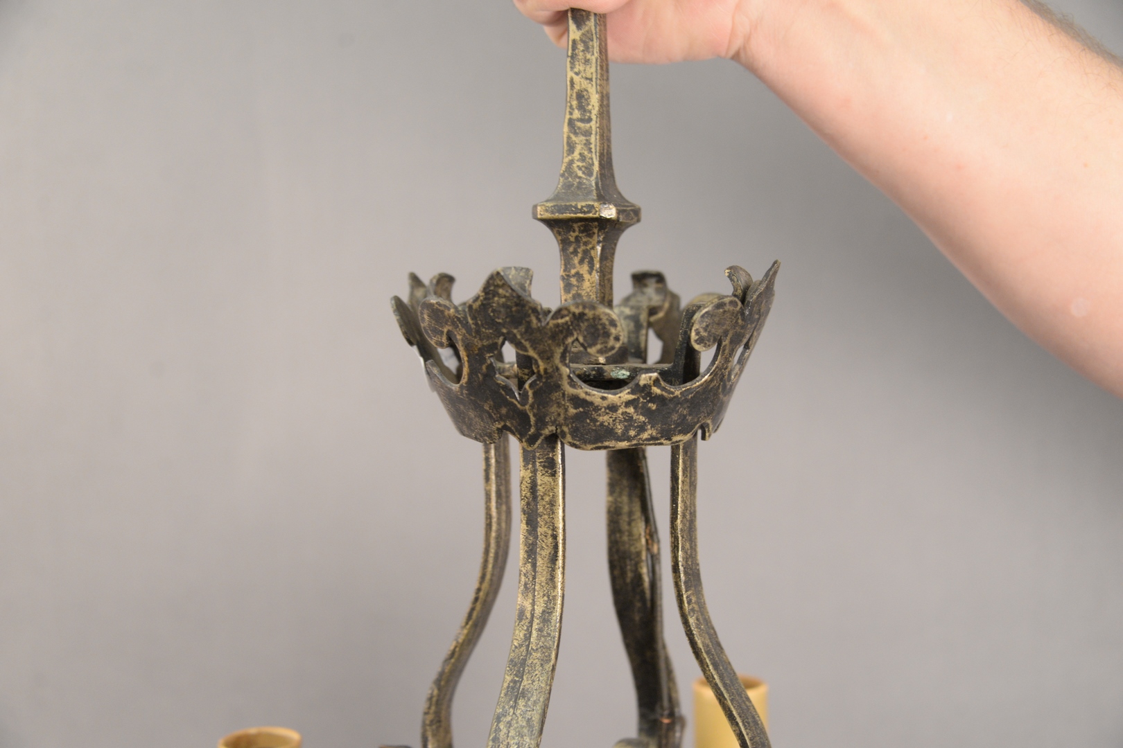 Lot 381: Gothic Style Iron Chandelier, having four lights, length 35 inches, width 9 1/2 inches.