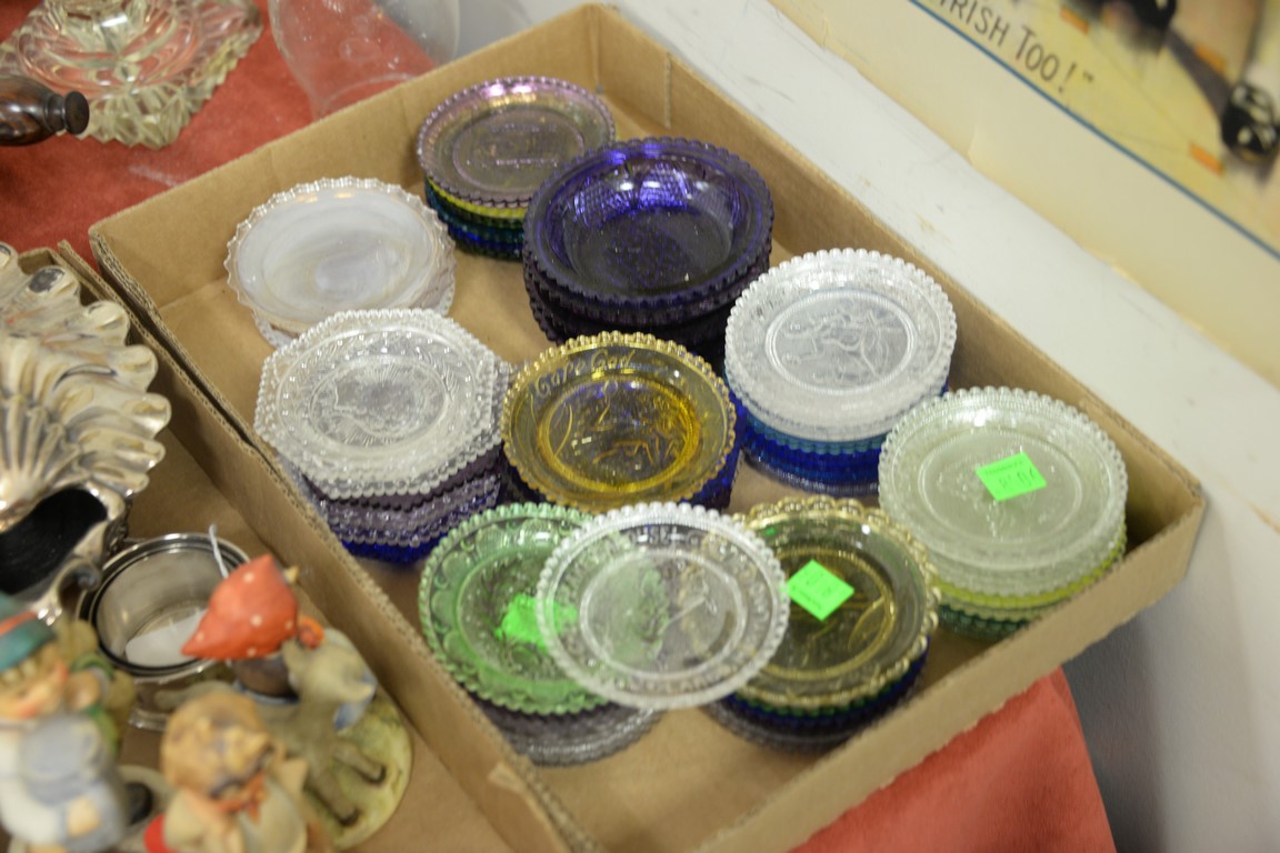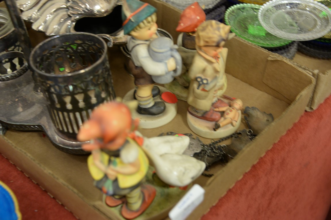 Group lot to include tantalus with 2 crystal bottles, four hummels, silverplate, cake mold, Bewley’s jar, footed crystal bowl, and collection of butter pats.