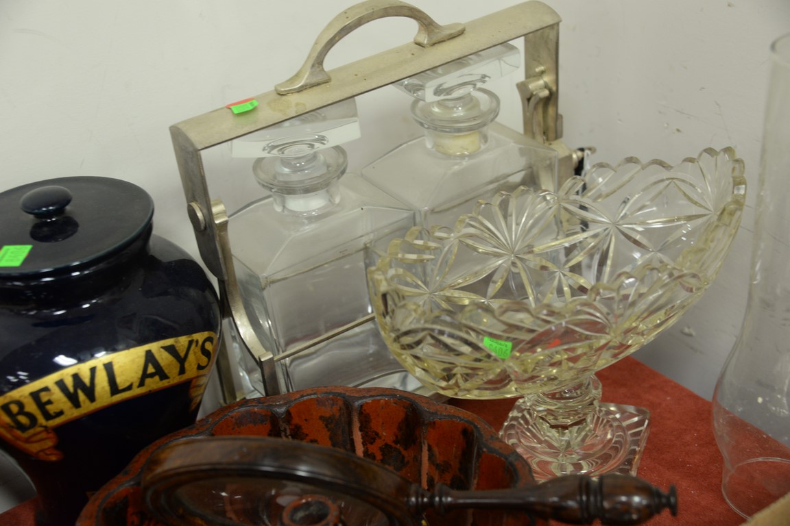 Lot 381: Group lot to include tantalus with 2 crystal bottles, four hummels, silverplate, cake mold, Bewley’s jar, footed crystal bowl, and c…