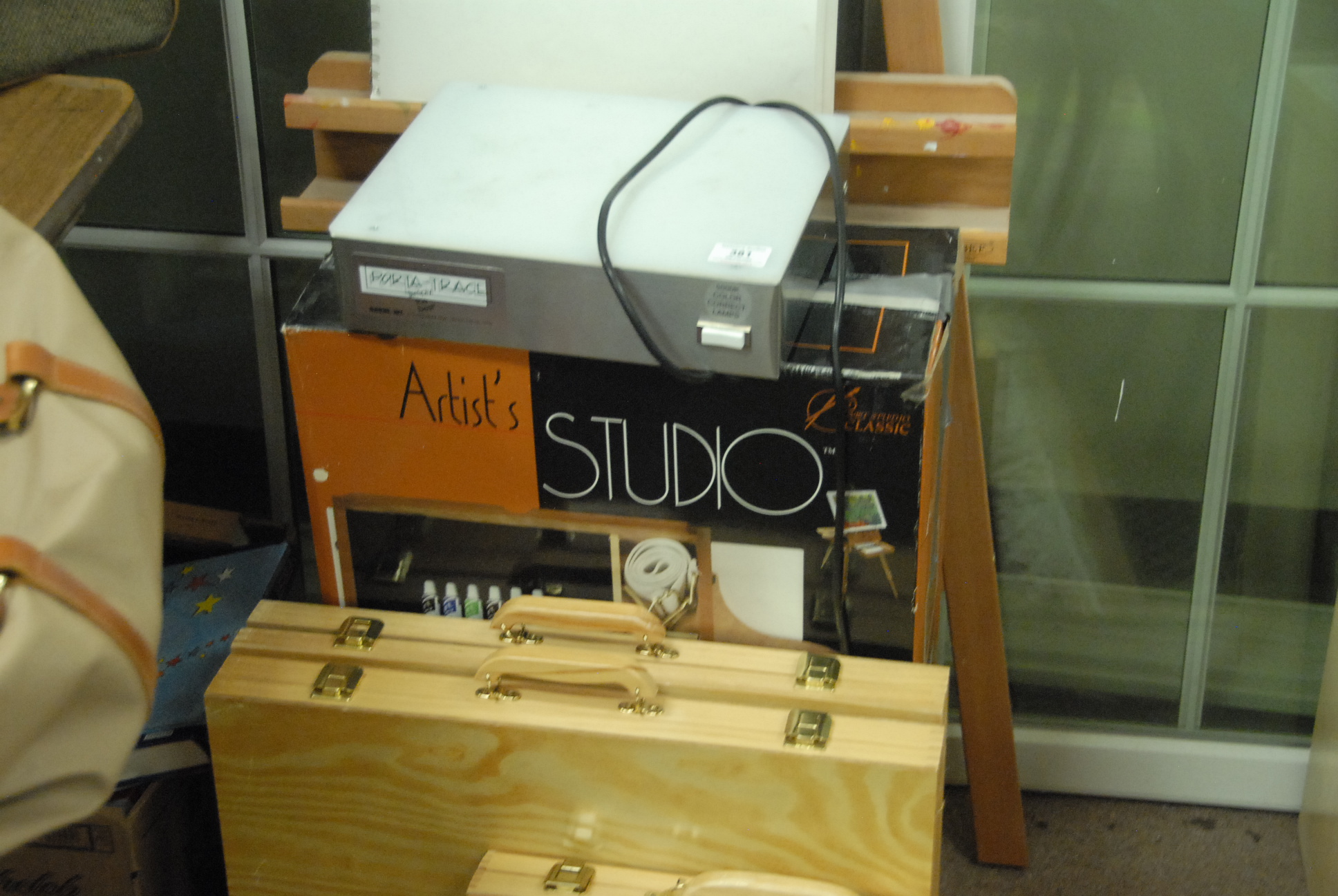 Lot 381: Group of artist items to include an artist’s eisel, porta trace, artist studio paint supplies, etc.