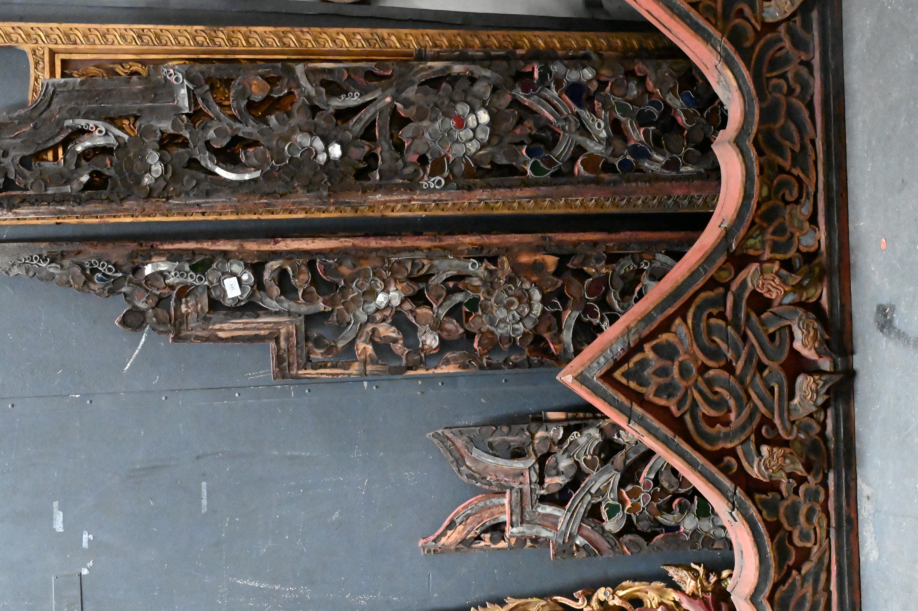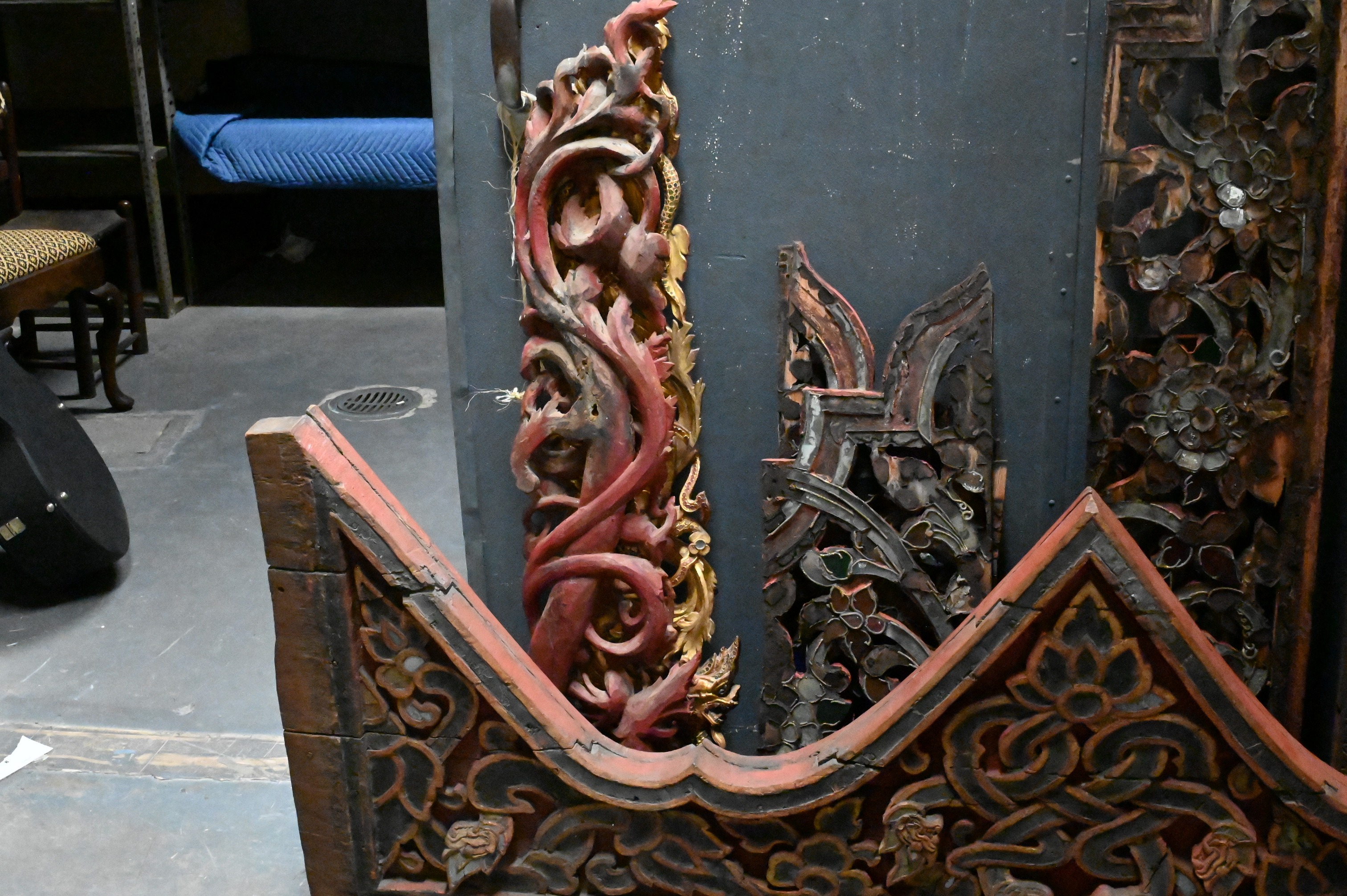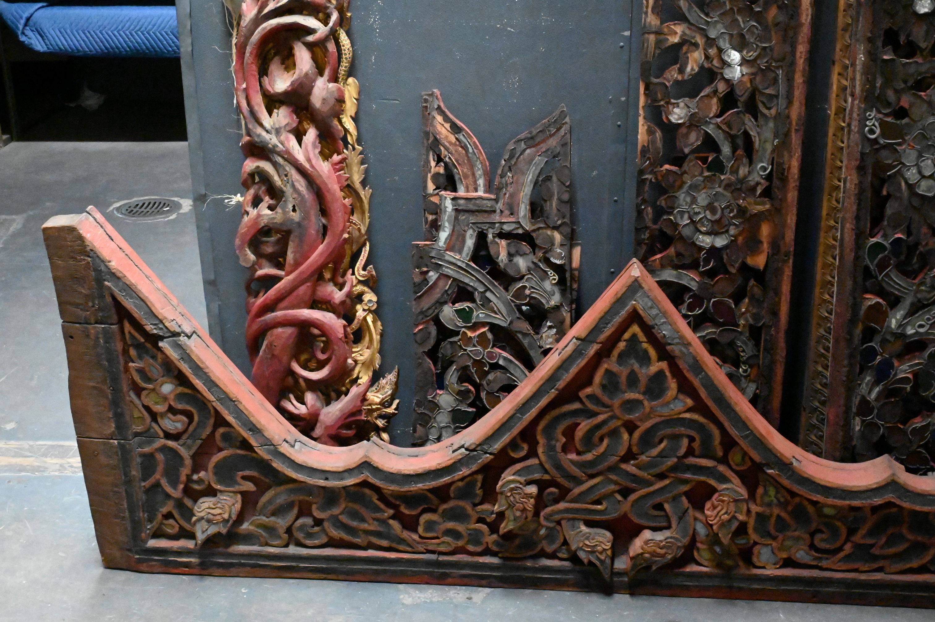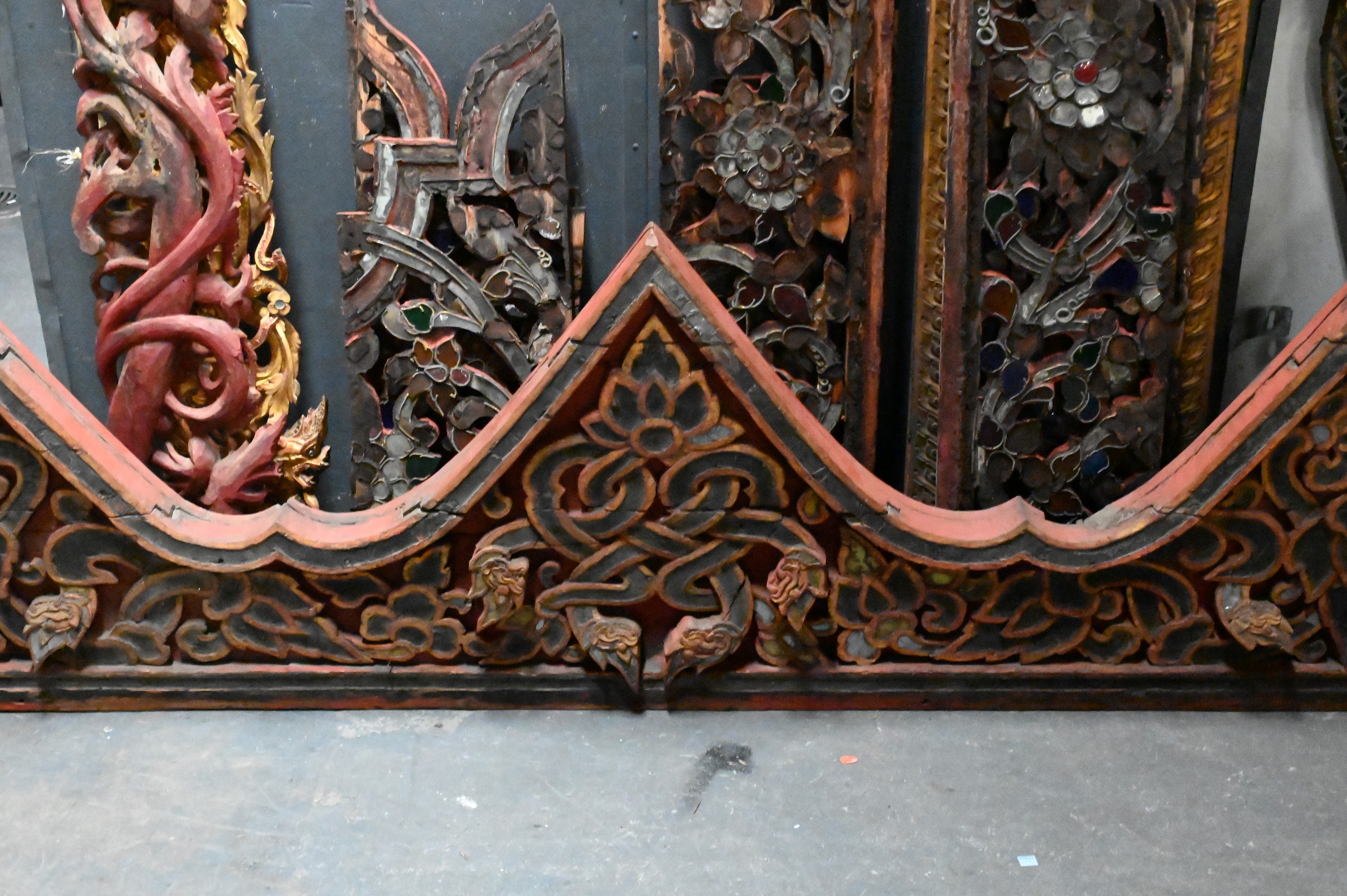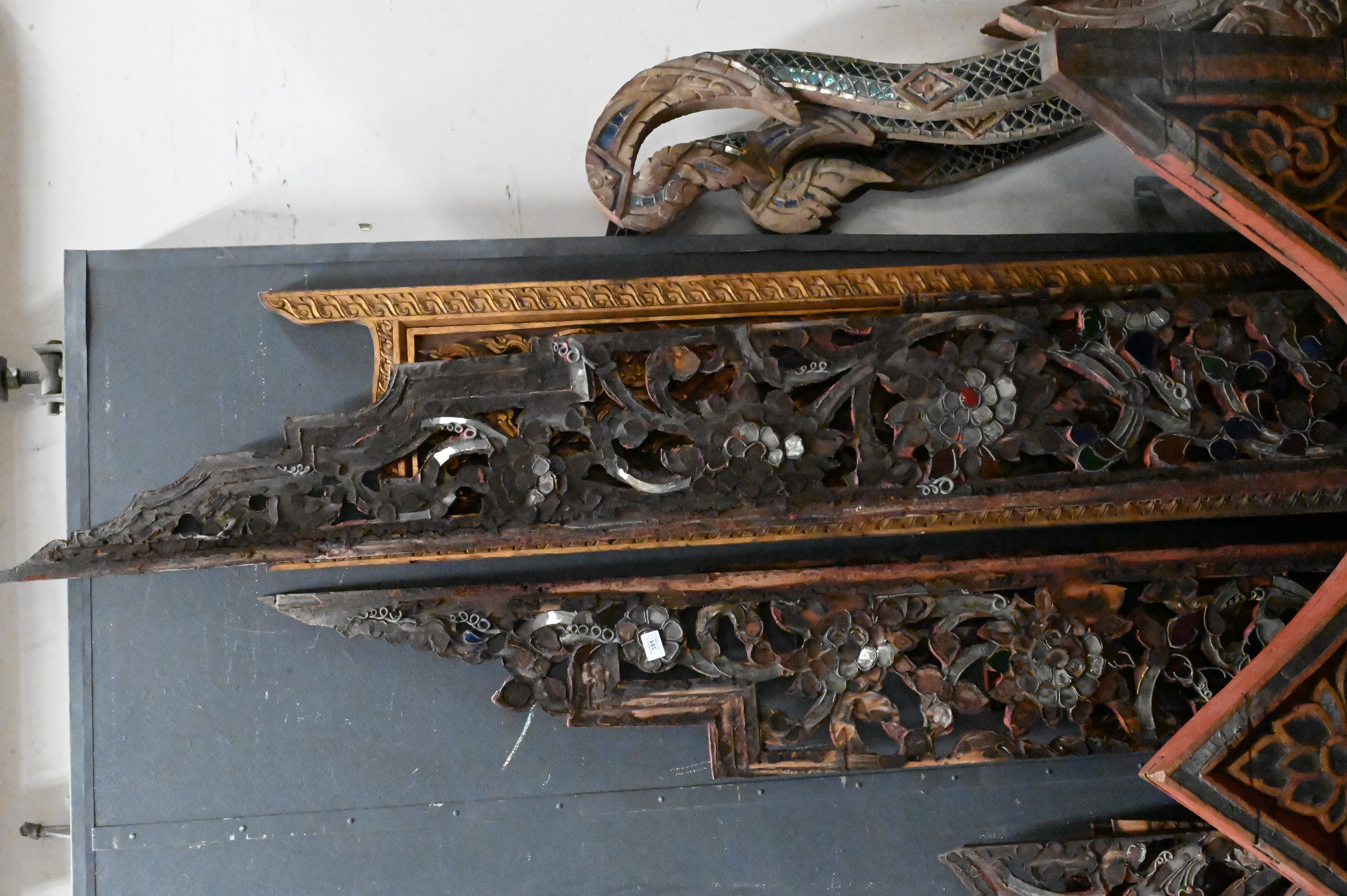 to include set of four scrolling corbels having blue glass insets, Indian carved door panel featuring a goddess, red painted pediment with dragon and flower motif, pair of giltwood dragon panels etc…