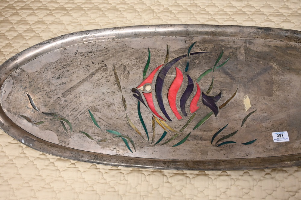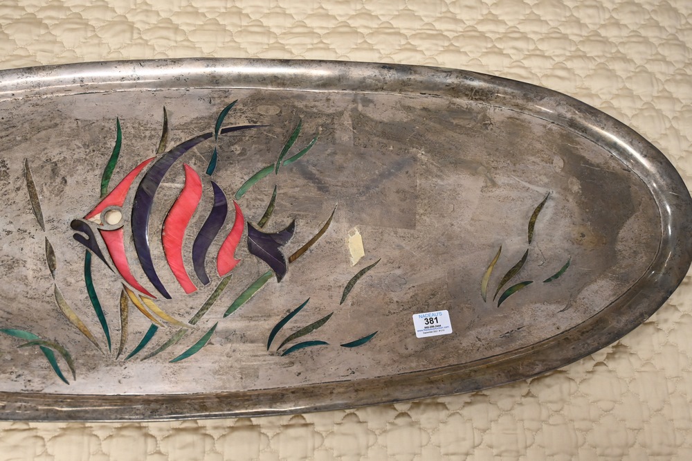 Los Castillos Taxco Sterling Silver Tray, having lacquer inlay creating a fish and seaweed scene (as is), length 42 inches, 179.5 t….