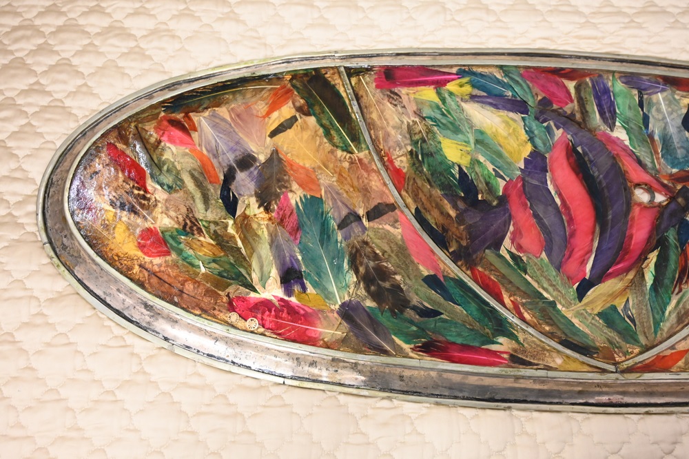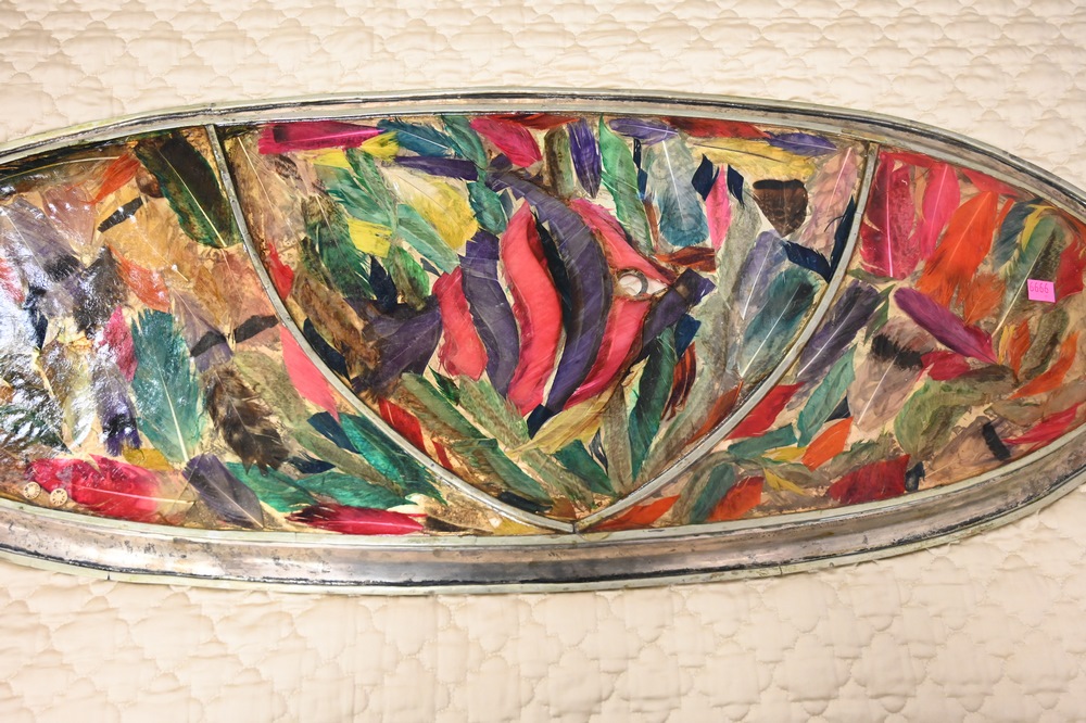 Lot 381: Los Castillos Taxco Sterling Silver Tray, having lacquer inlay creating a fish and seaweed scene (as is), length 42 inches, 179.5 t.oz. total weight (including glass).