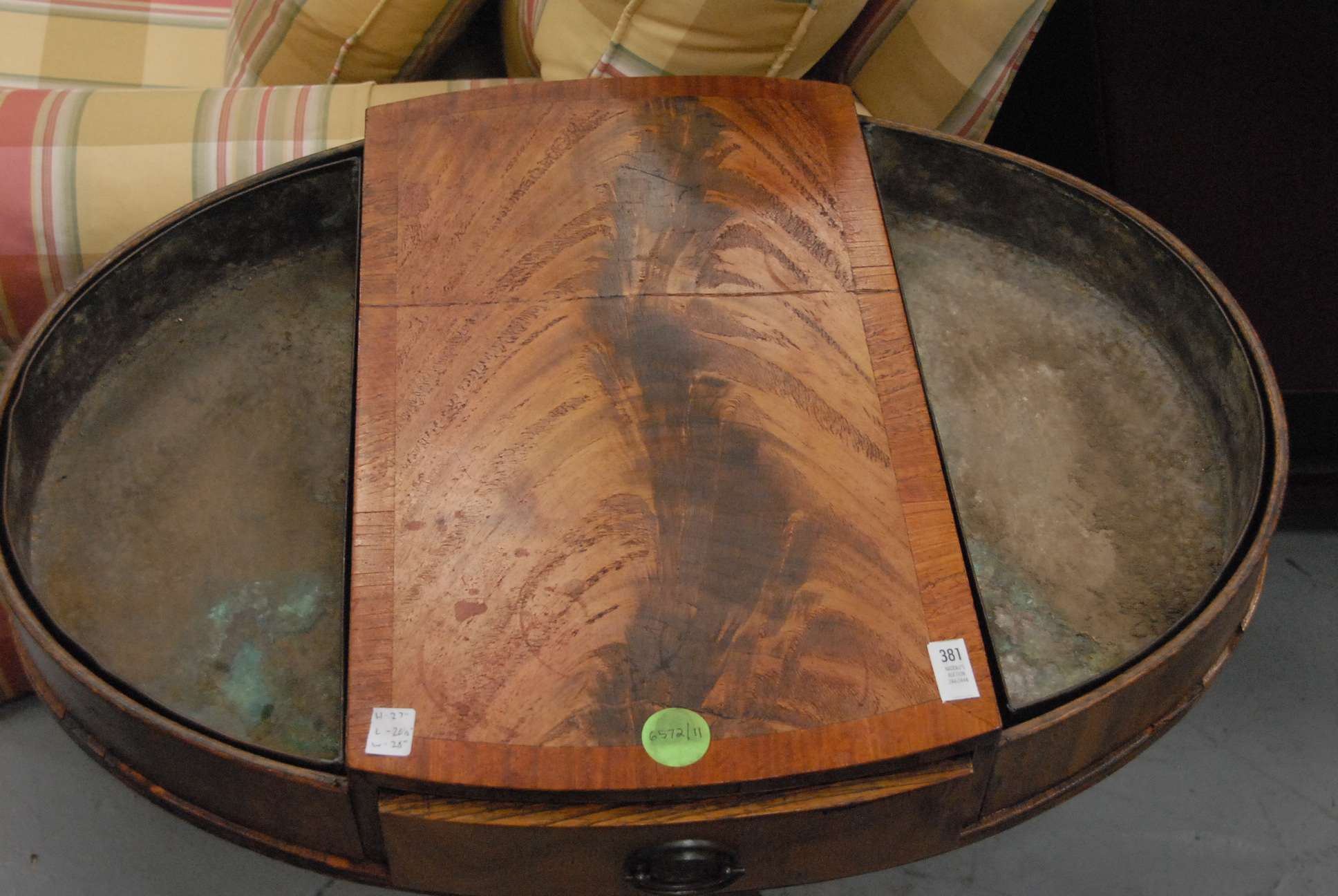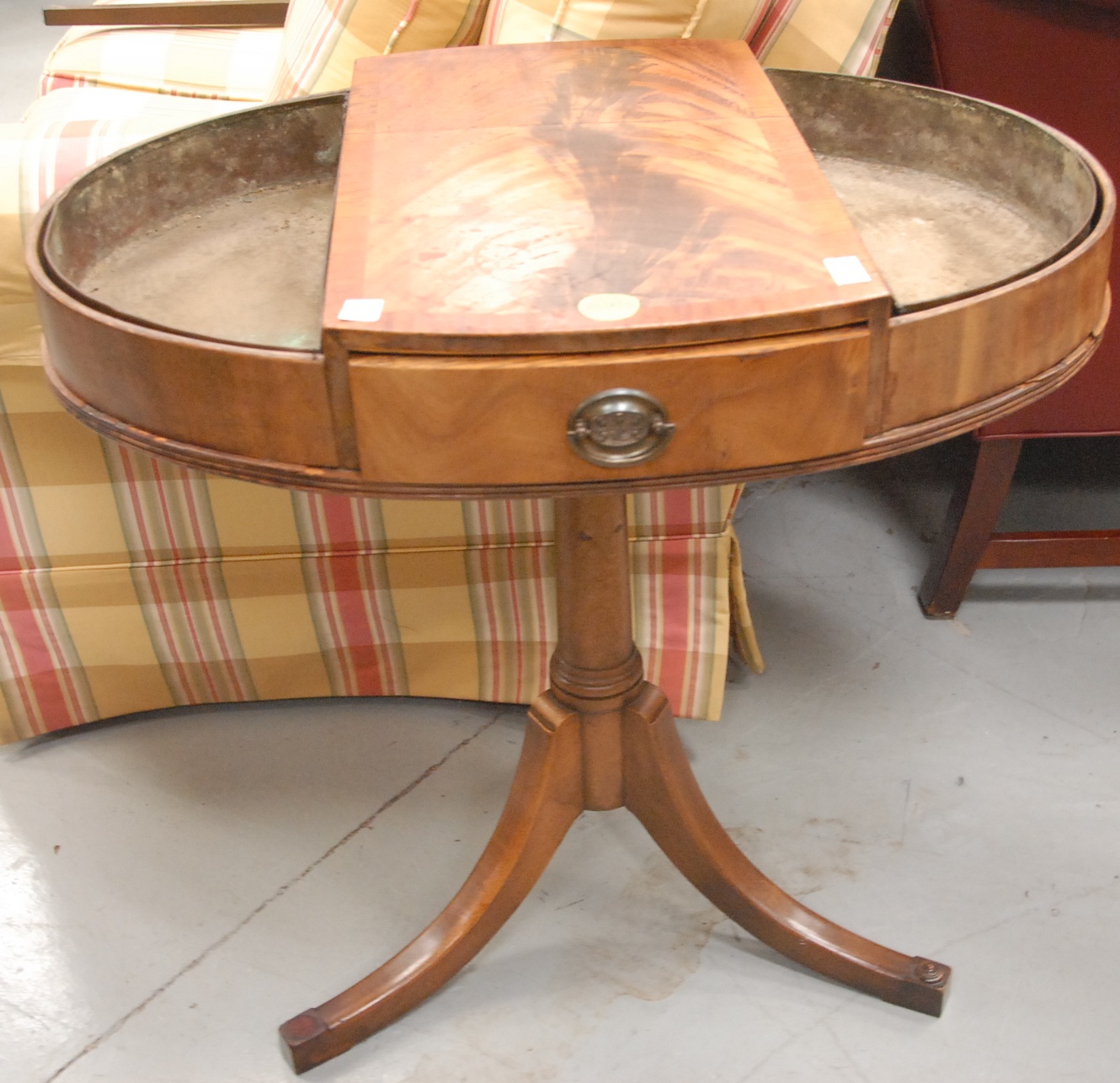 Mahogany one drawer oval top table with planters on either side.