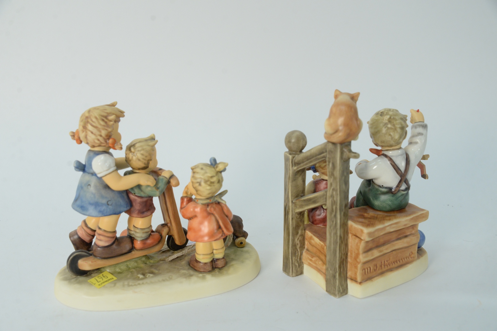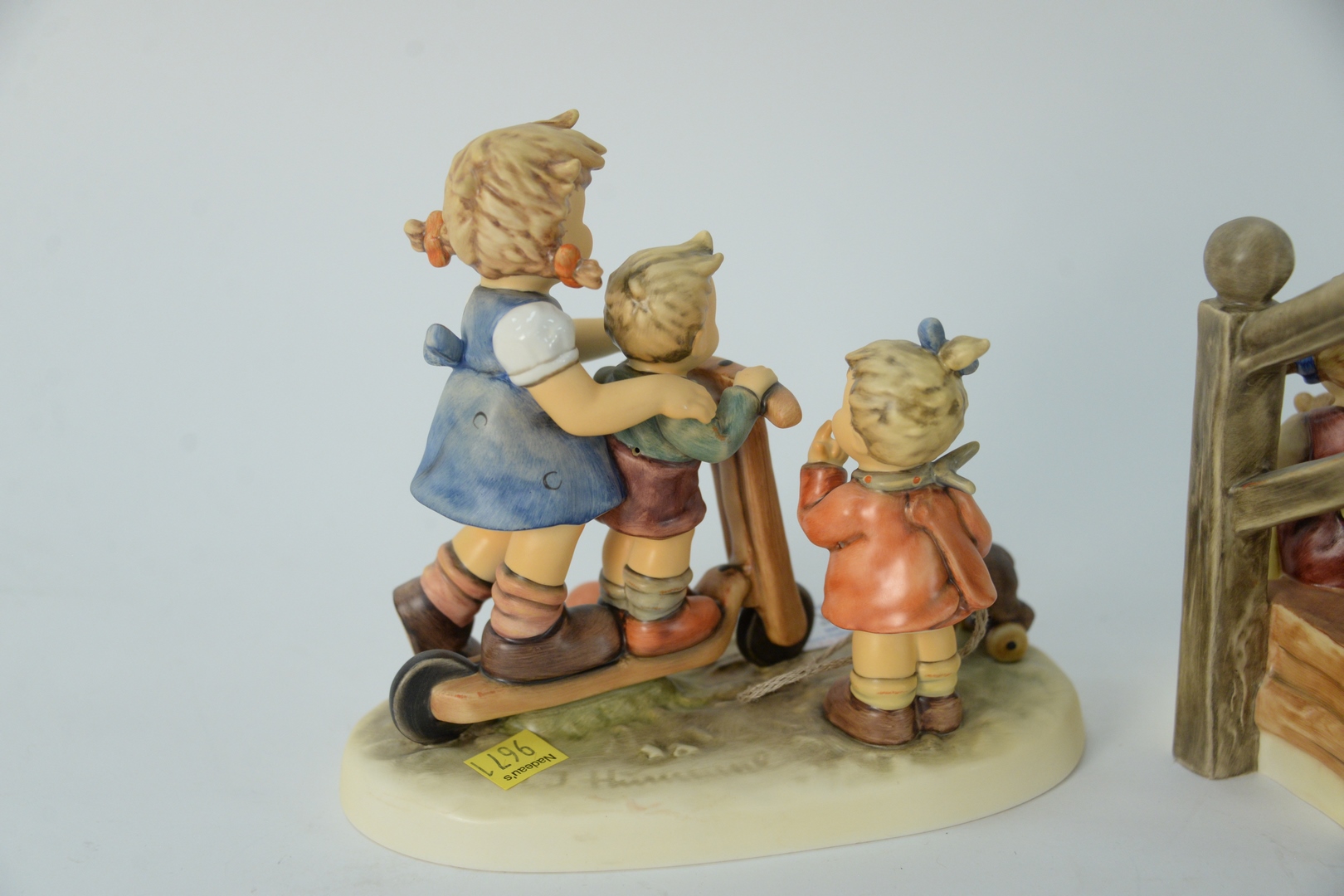 Lot 381: Pair of Hummel’s, to include ‘Wonder of Childhood’ and ‘Scooter Time’, each inscribed along the base and marked to the underside, heights 6 1/2 inches and 7 inches.