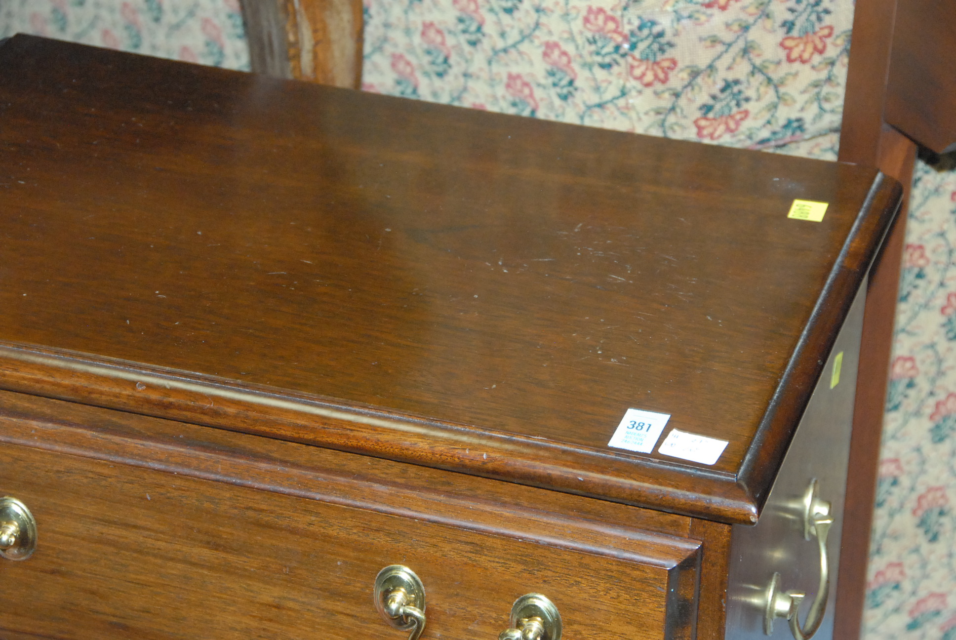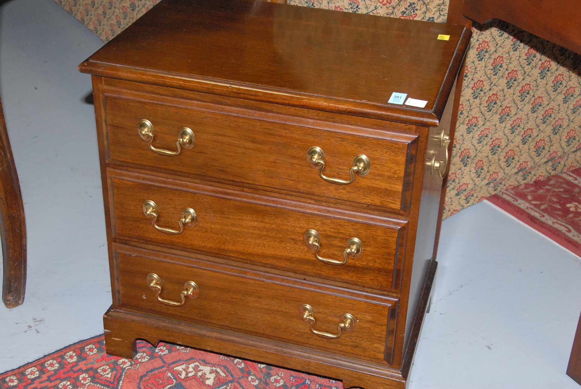 Small mahogany three drawer chest, ht. 21in. wd. 20in. Provenance: Estate of Judy Gengras McDonough of West Hartford, CT.