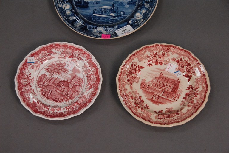 Three Staffordshire plates, two red and white Waterworks Phila, Hancock House, Boston.