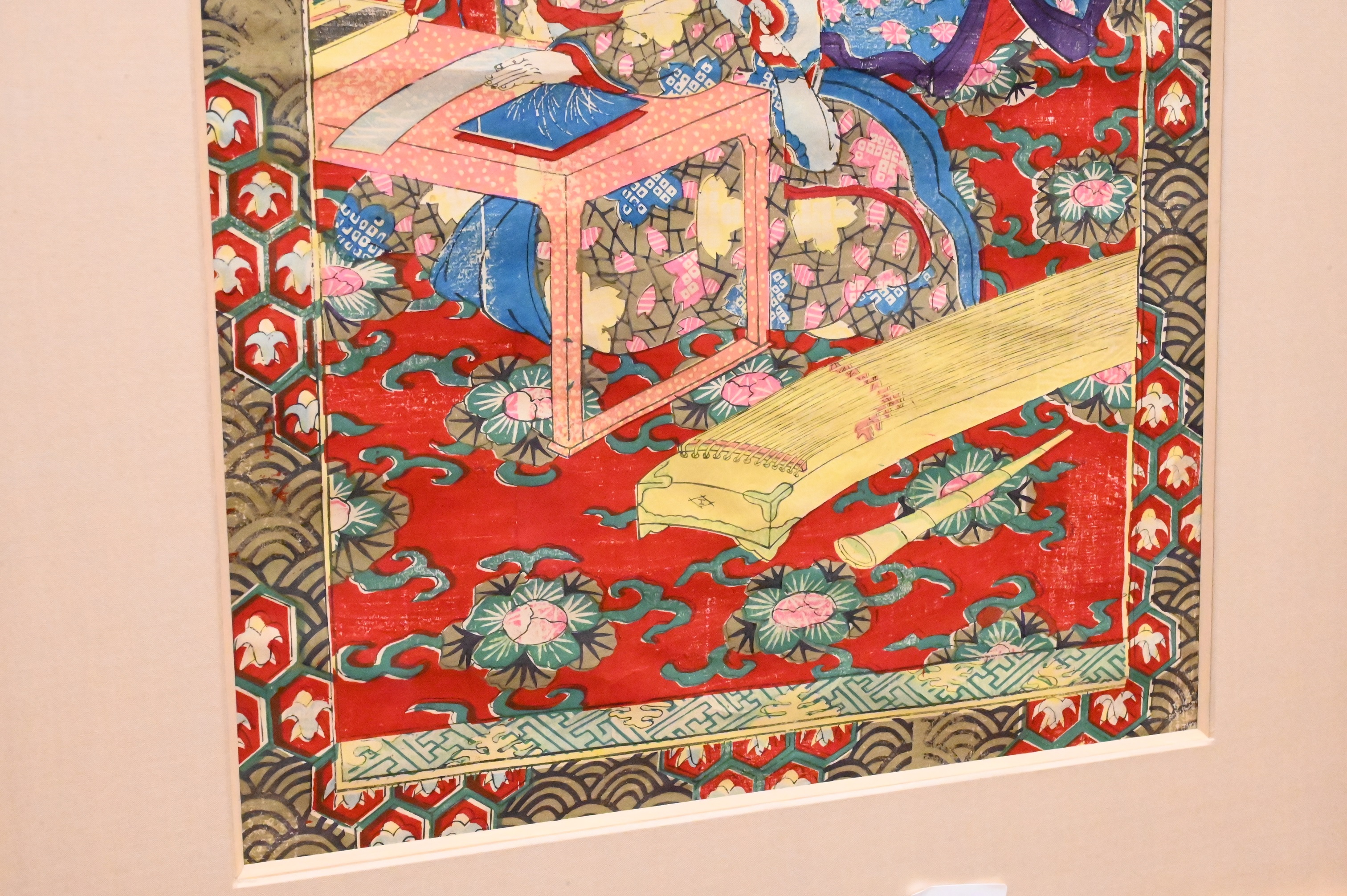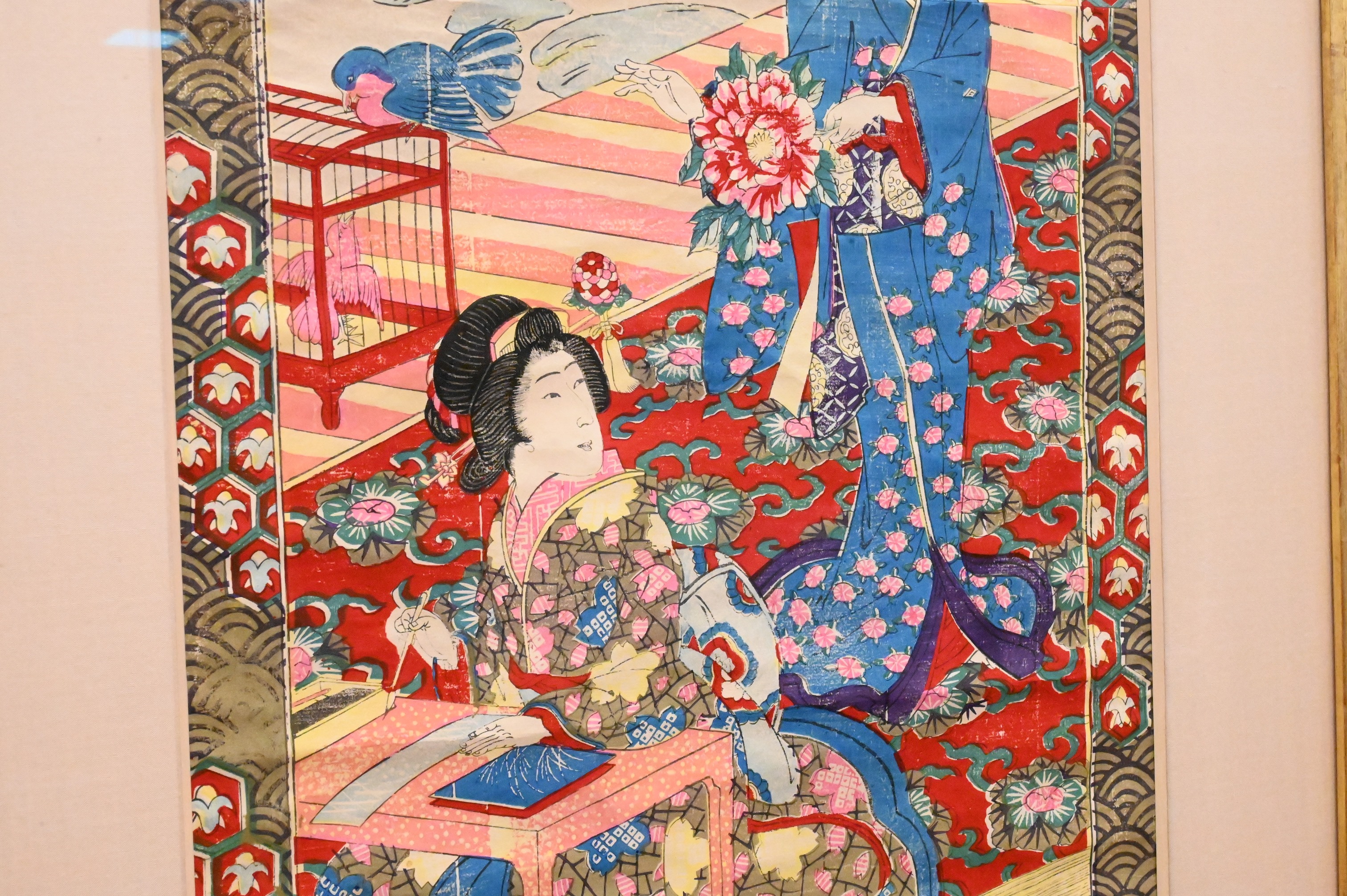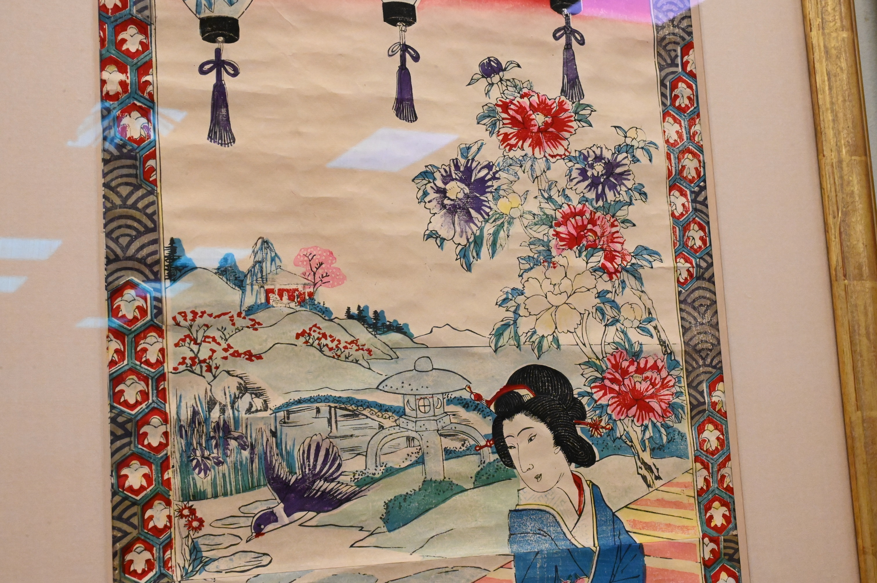 Two Geishas in a garden scene, one doing calligraphy the other holding flowers, printed on two sheets