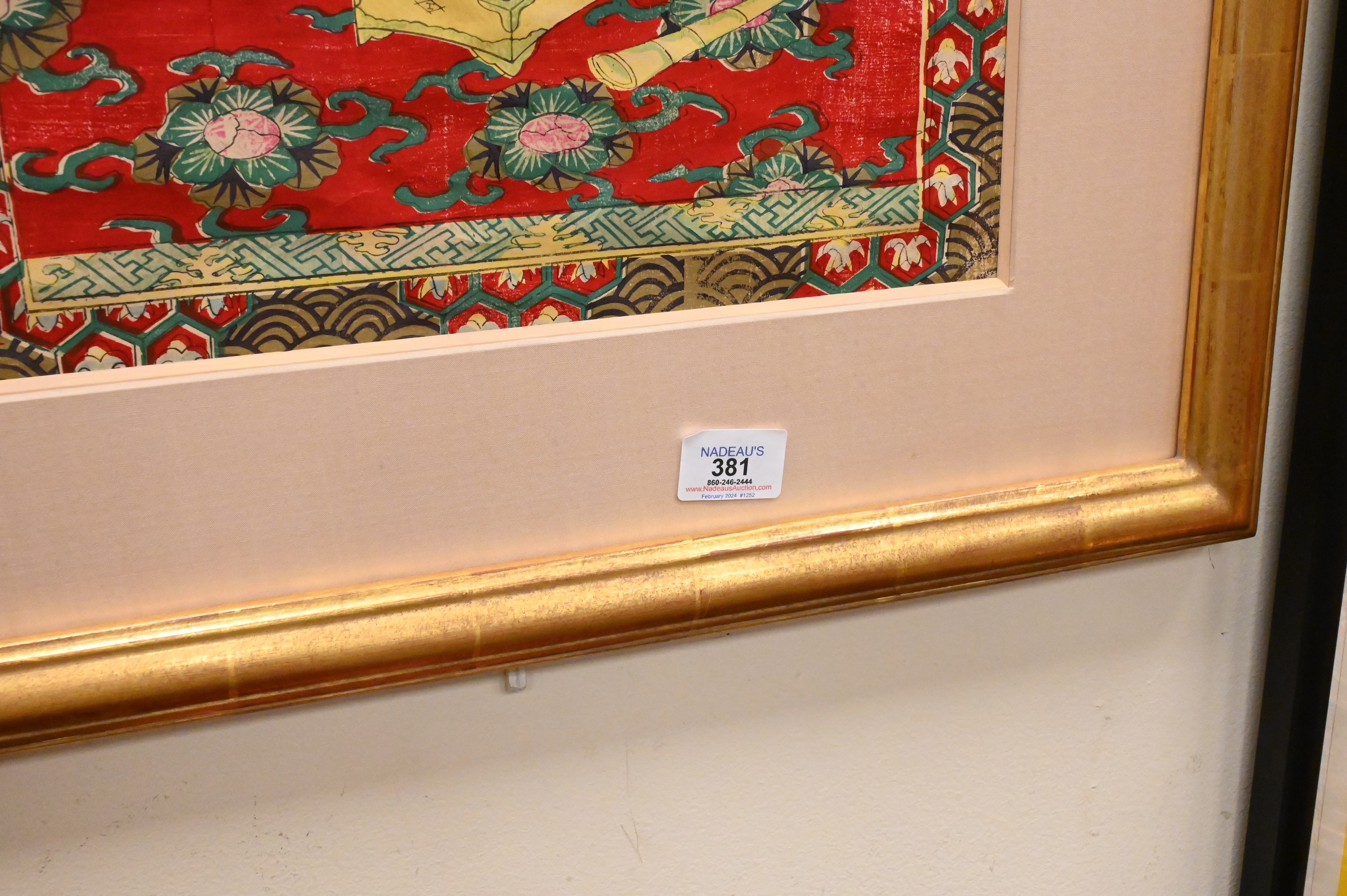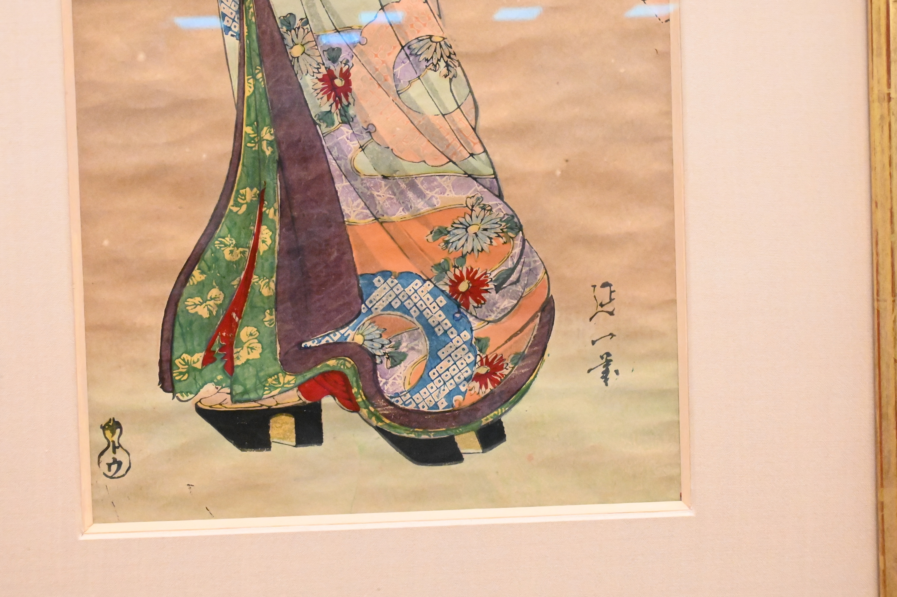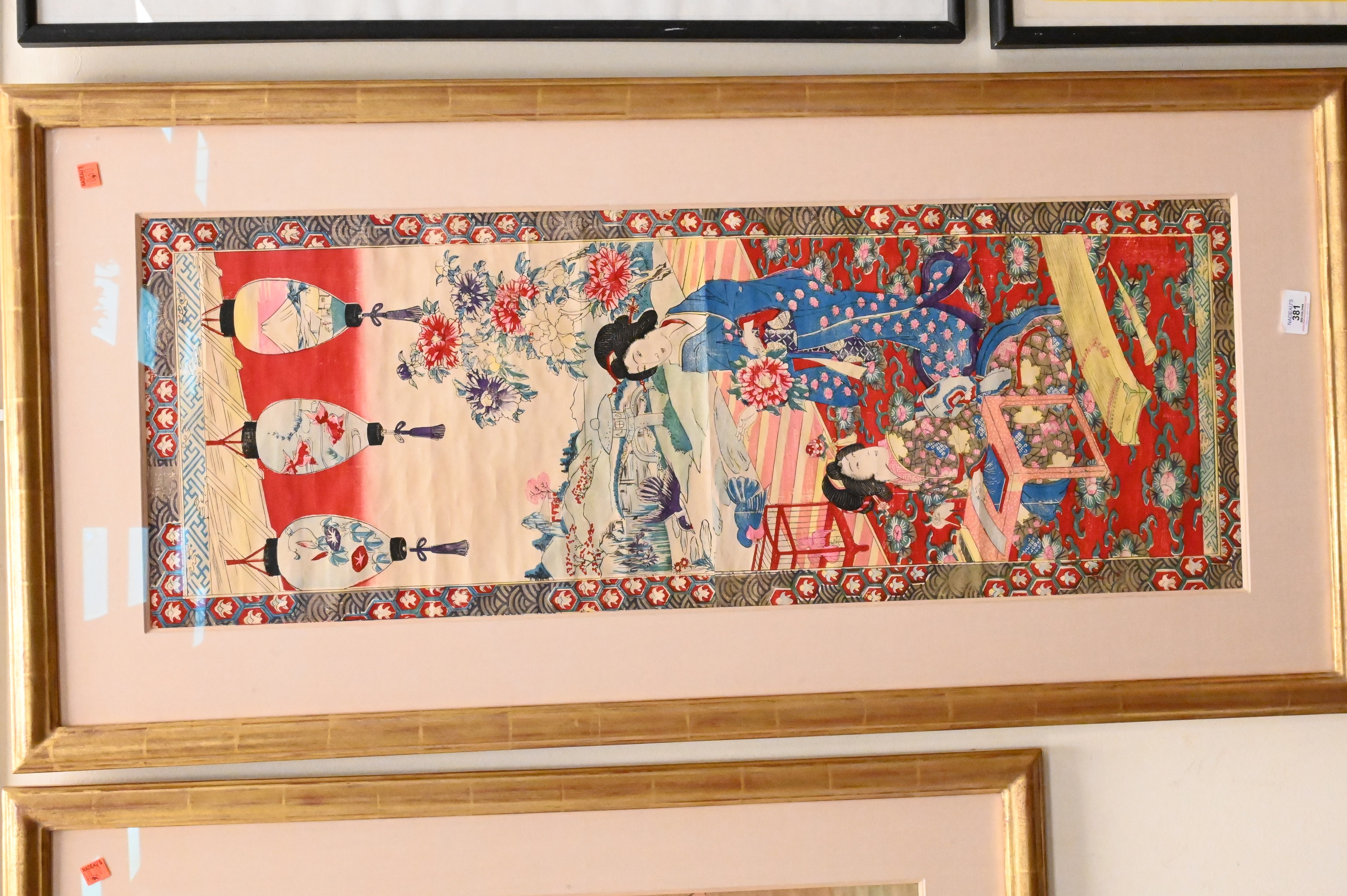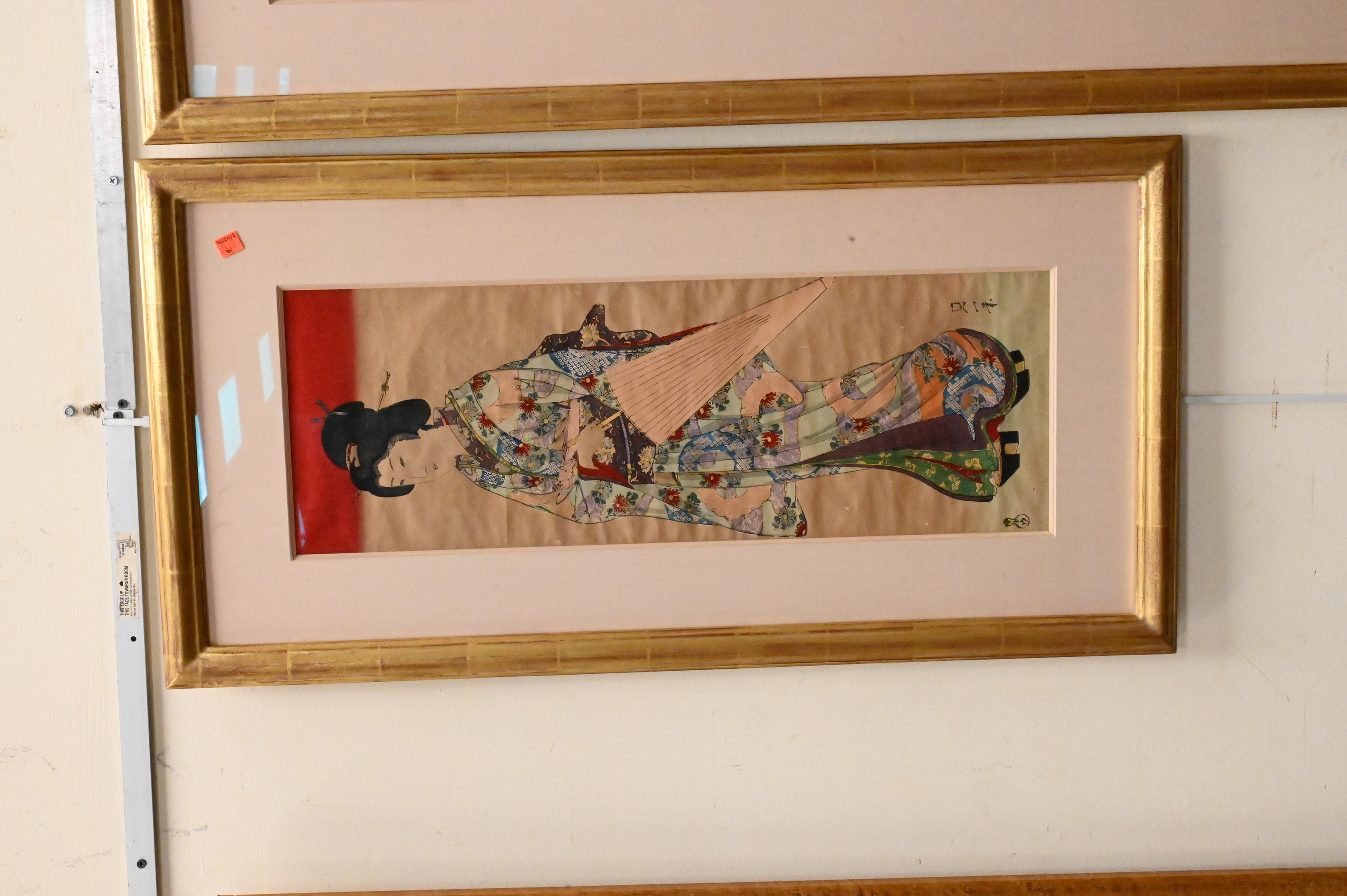Two Geishas in a garden scene, one doing calligraphy the other holding flowers, printed on two sheets