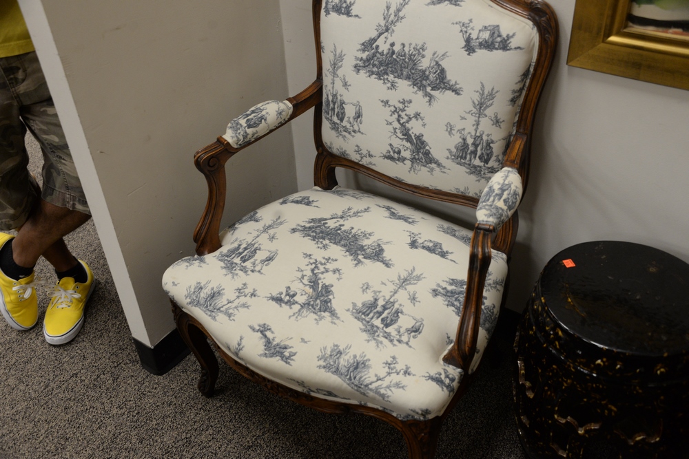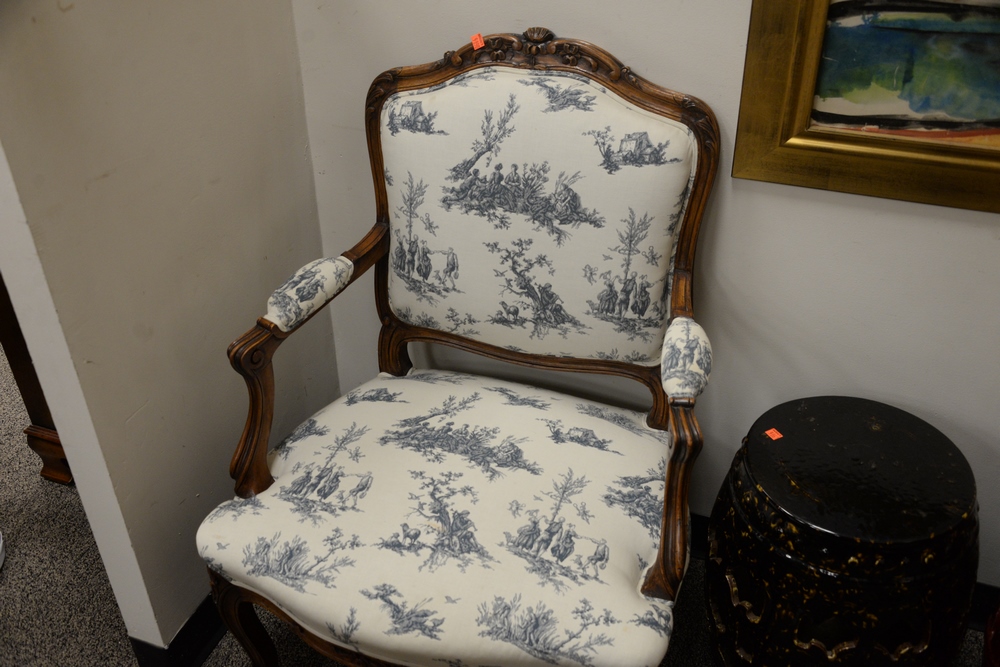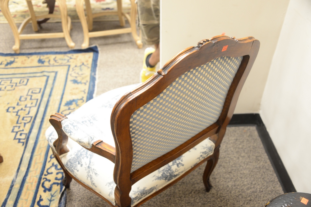 Two Louis XV Style Upholstered Arm Chairs, height 28 inches and 37 inches.