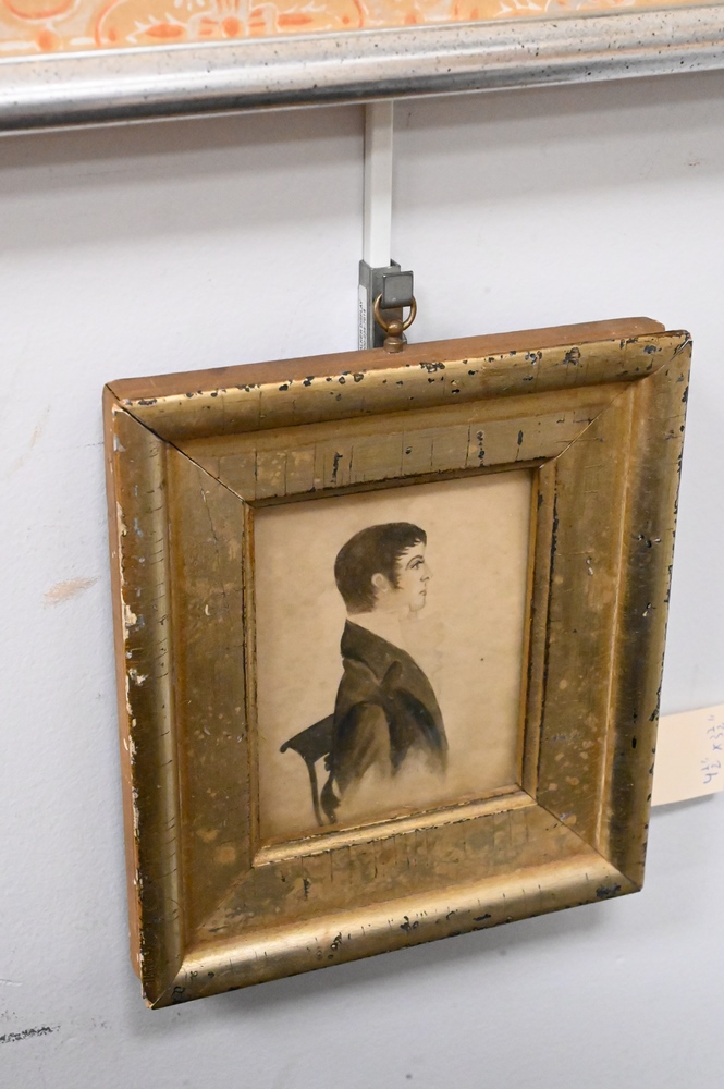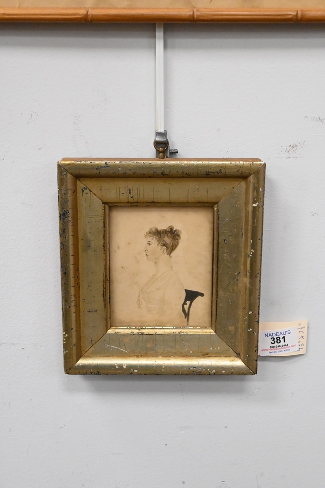 Lot 381: Two Pairs of Portraits, to include a pair of watercolor on paper of a man and woman seated in a chair, 4 1/2″ x 3 1/2″; along with a pair of plaster relief portraits, 6″ x 6″.