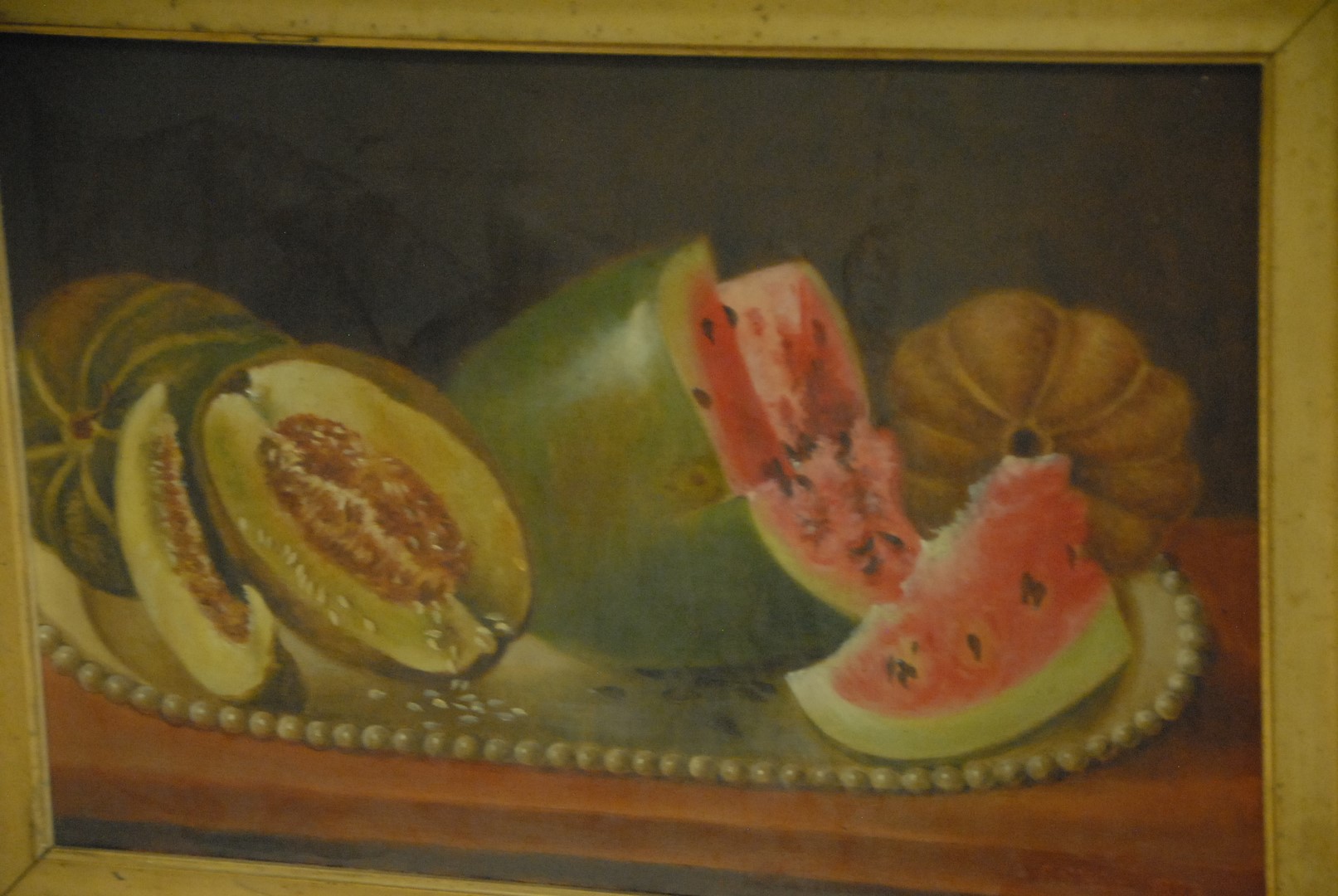 Lot 381: Two piece lot to include oil on canvas still life of mellon signed lower right E. S. Webster 1893 and oil on canvas still life with…