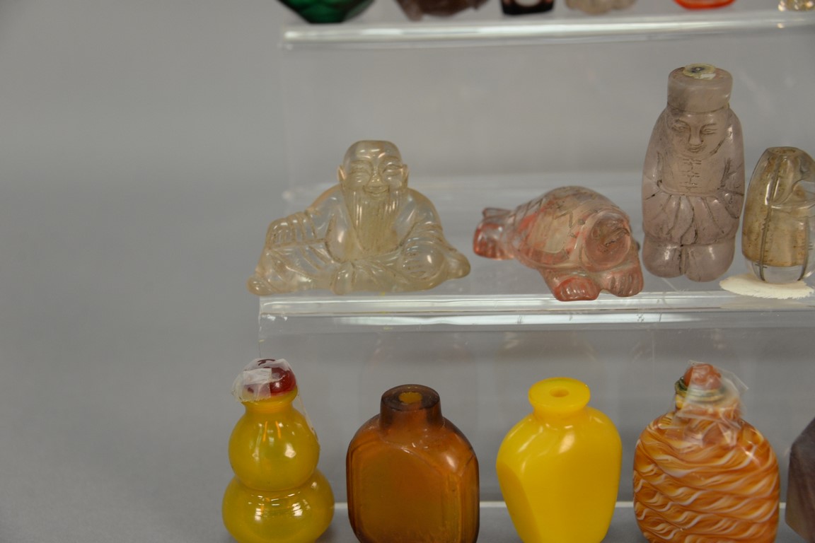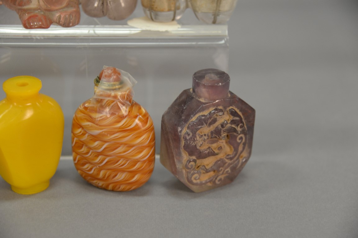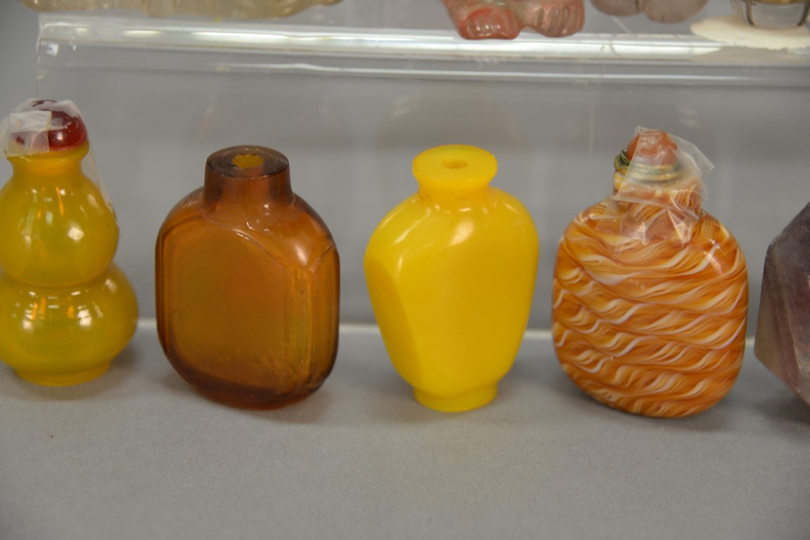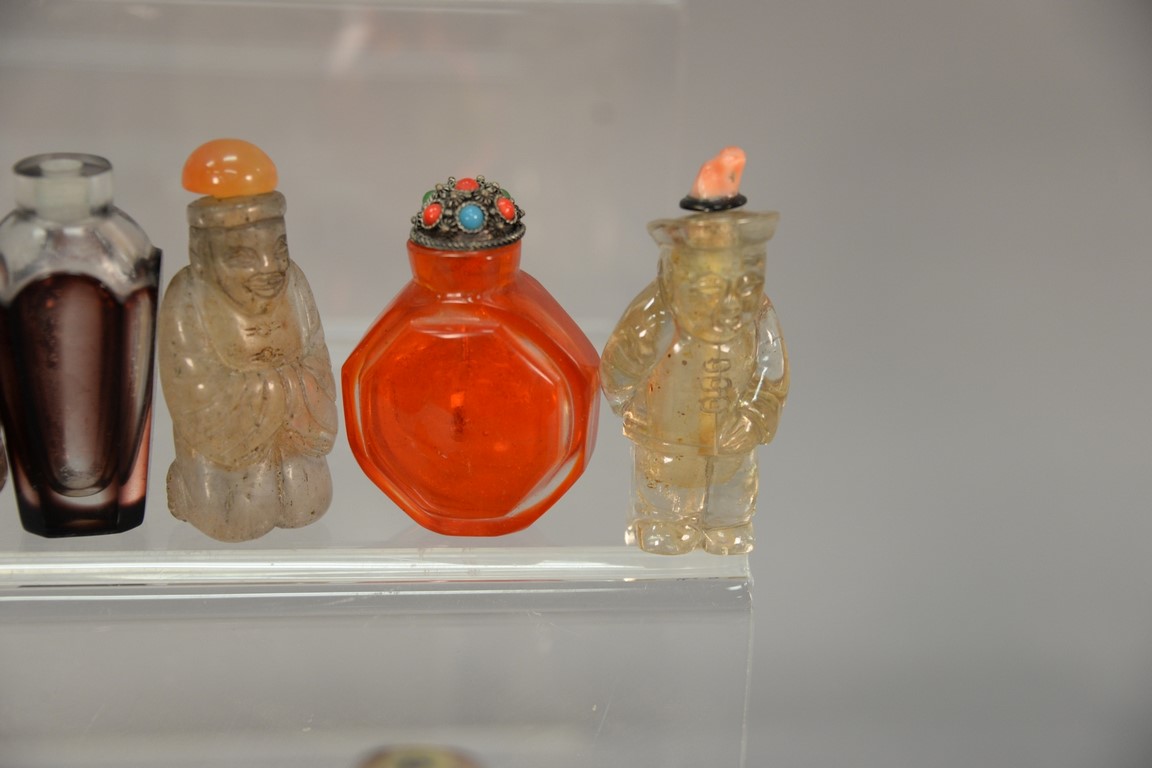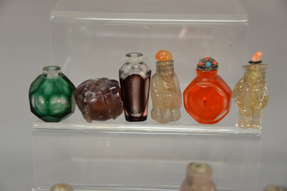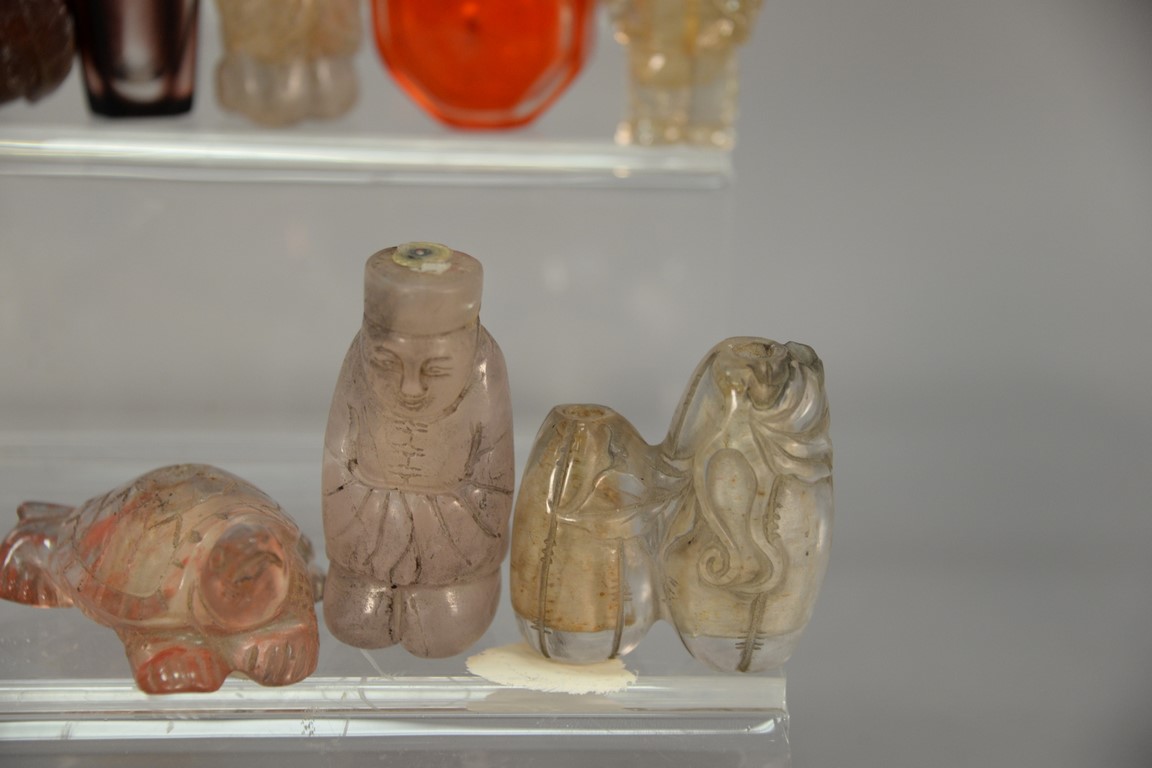 Lot 382: Fifteen glass, crystal, and quartz snuff bottles, some possibly Peking glass. ht. 1 1/4in. to 2 3/4in.